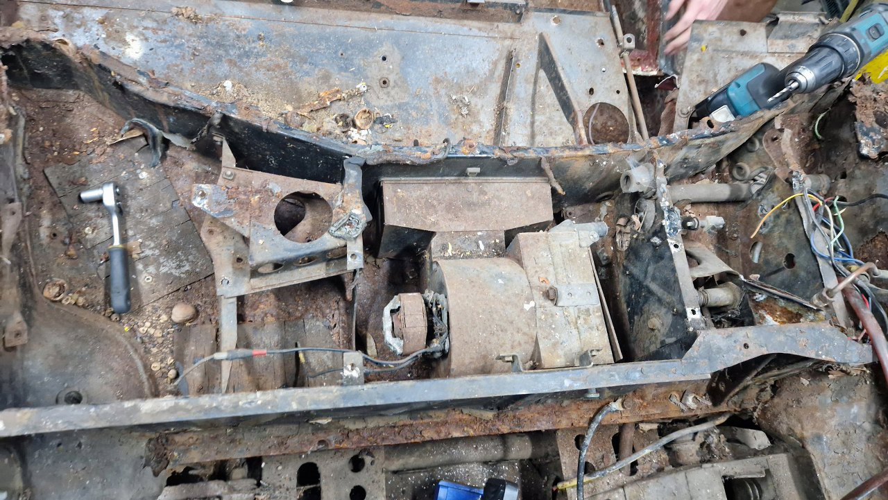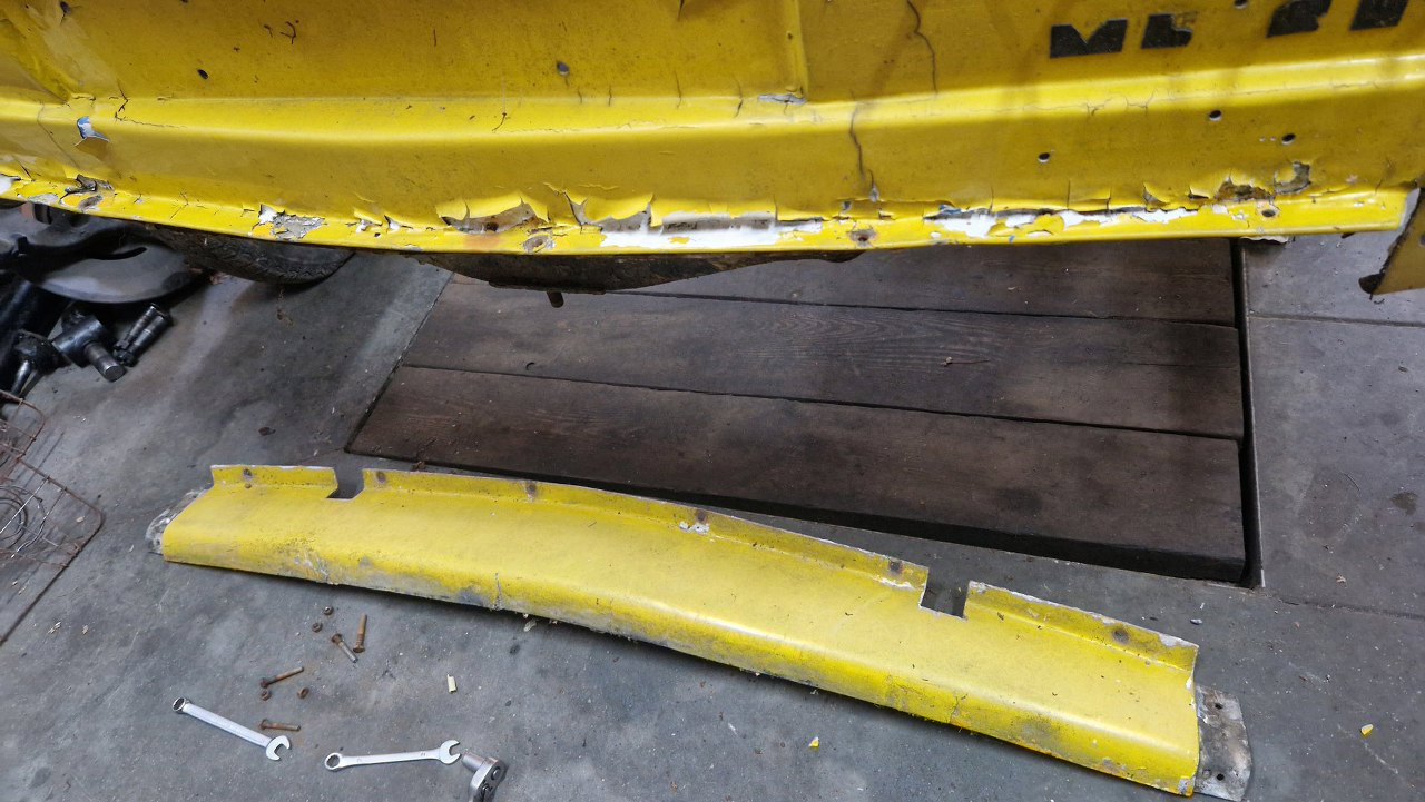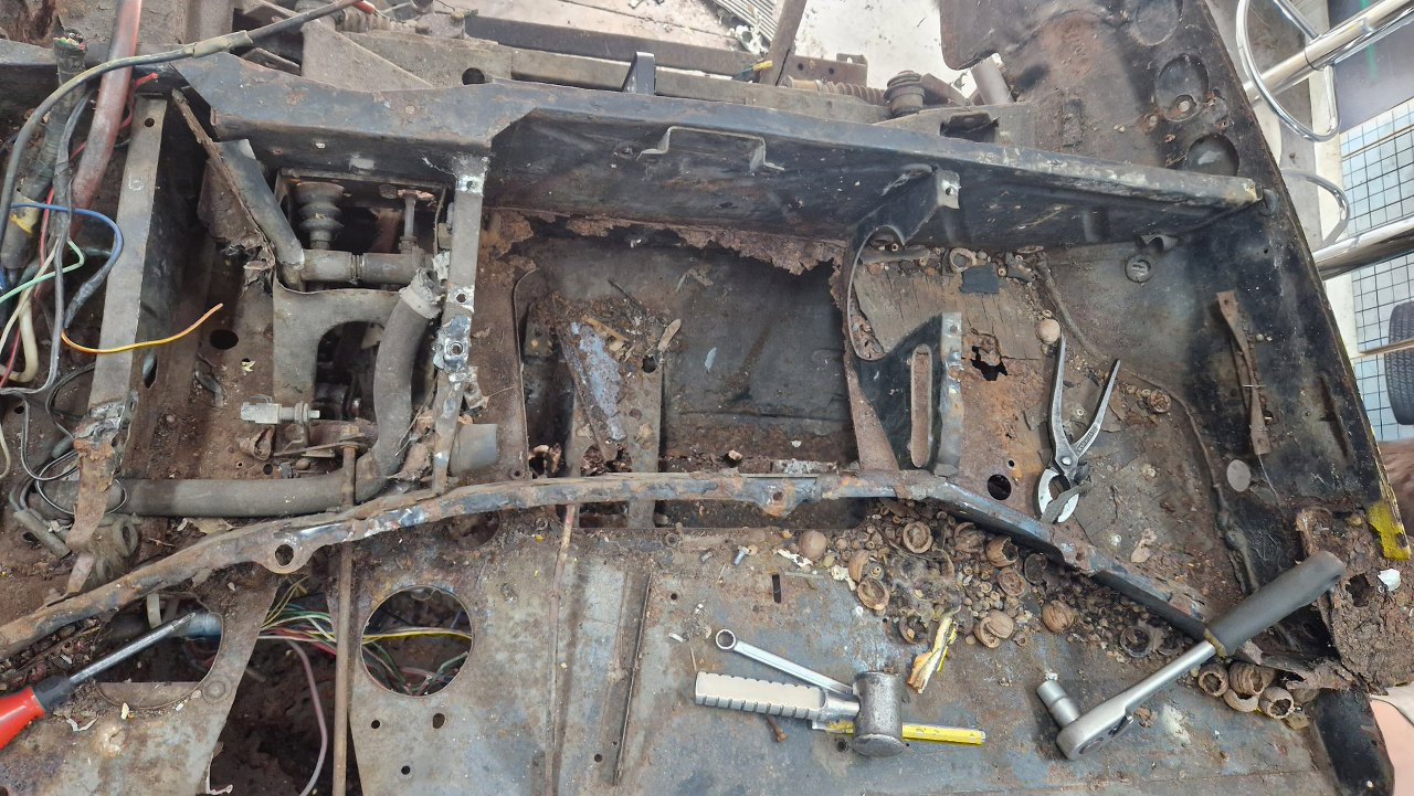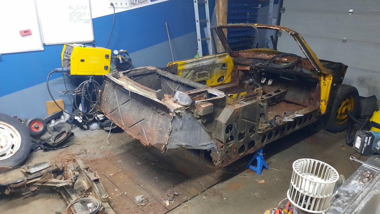 Zdjęliśmy dach. Nie bez trudu, bo akurat tu wszystkie śruby mocujące go do ramy przedniej szyby były tak zardzewiałe, że trzeba było się mocno postarać, żeby je urwać, a do tego były dość słabo dostępne. Z tyłu została belka wzmacniająca, przykręcona z obu stron do boku samochodu.