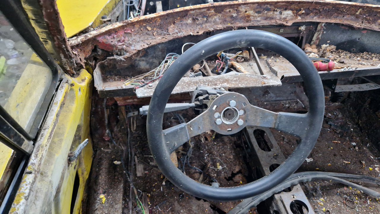 W środku za dużo ciekawych rzeczy nie ma. Poza zegarami nie ma tu praktycznie nic więcej z deski rozdzielczej. Sama kolumna kierownicy jest albo z czegoś innego, albo ma tylko pająk włączników wpasowany z czegoś. Kierownica też jest nieoryginalna - widać to pootworach mocujących. Mi to wygląda na kierwnicę od malucha.