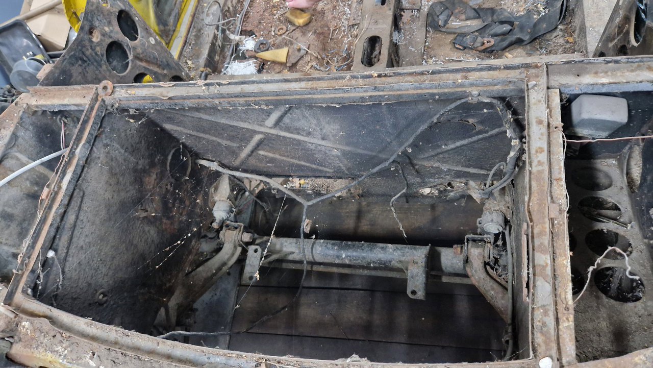 Po wykręceniu nawiewu widać, że tu też mocno wygniło, ale też część blach została kiedyś już wycięta, bo komuś przeszkadzały w dostępie do części. W całym samochodzie jest też cała masa orzechów, skorupek ślimaków i innych takich. Ta Matra musiała mieć bogate życie wewnętrzne.