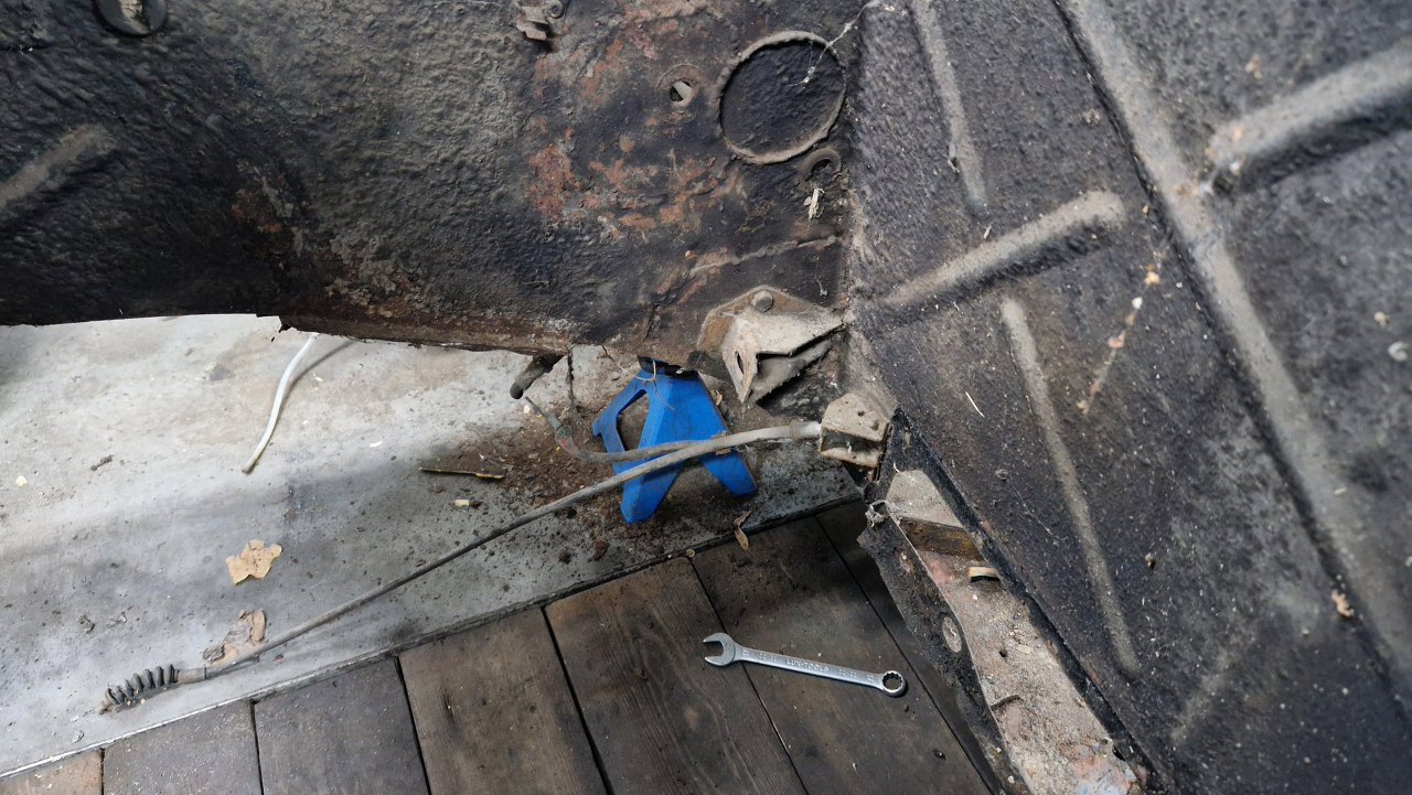 Dobra, pomieszały mi się zdjęcia, ale niech już tak zostaną - tu jeszcze sprzed wyjęcia zawieszenia tylnego. Przykręcane jest 4 śrubami - dwie od zewnątrz, przez próg, dwie tutaj, nad mocowaniem wahaczy.