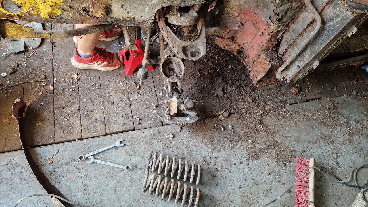 Potem przeszliśmy do wyjęcia zawieszenia przedniego. Tu nie ma belki zawieszenia, wszystko jest mocowane do podwozia. Wyjęliśmy sprężyny.