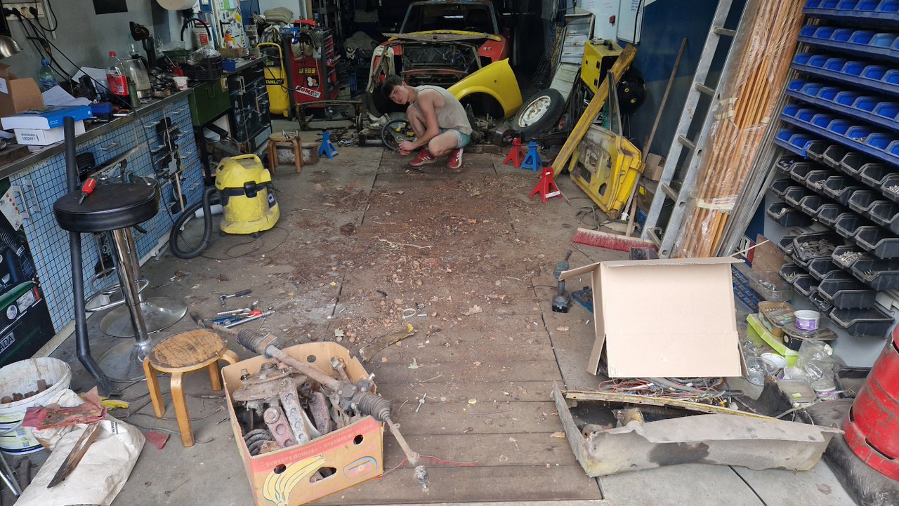 Po wyniesieniu przydatnych części do przechowania i wywaleniu zardzewiałych blach na złom, zostało Maćkowi sporo zamiatania - to wszystko, co na razie z żółtej Matry zostało. Ale ten egzemplarz był już za daleko na złomie, żeby go zatrzymywać. Części z niego przydadzą się do uzupełnienia czerwonej, a karoseria albo kiedyś kogoś uratuje, a może zostanie założona na jakąś ramę przestrzenną z V12 z Mercedesa? :).