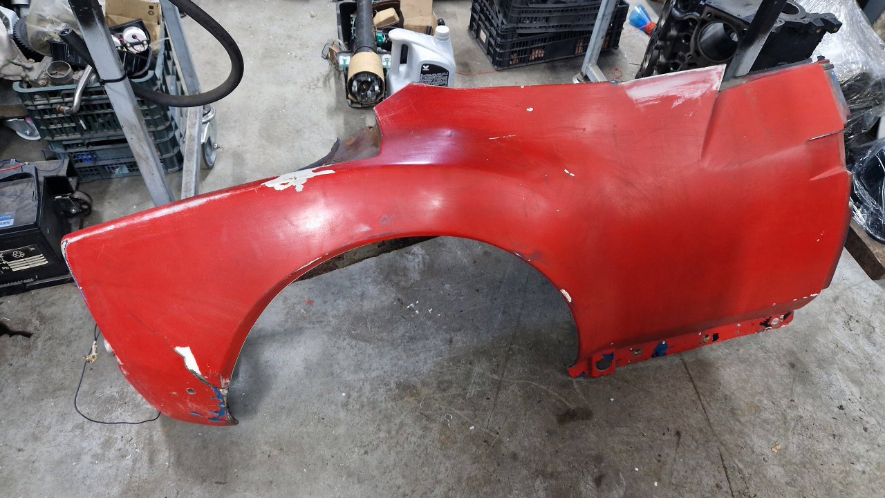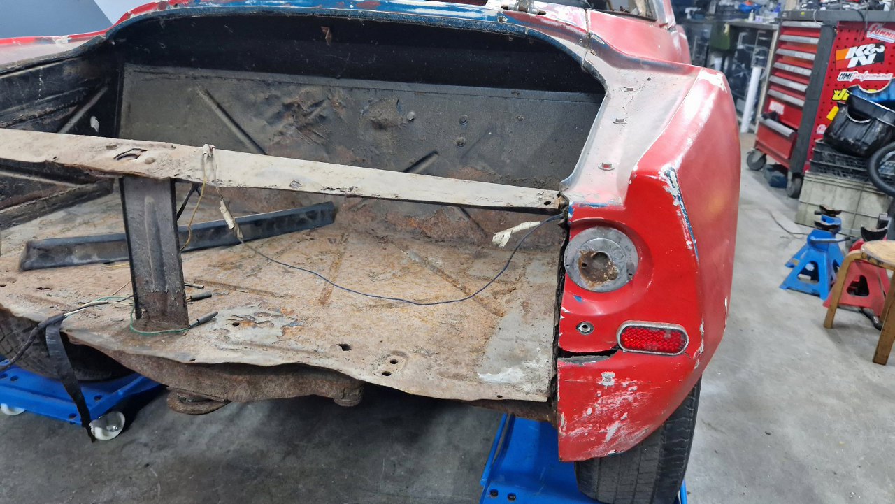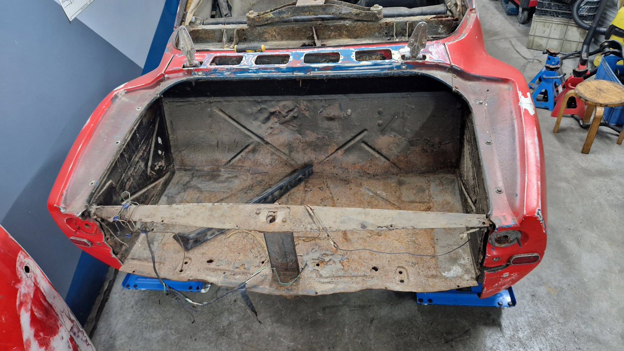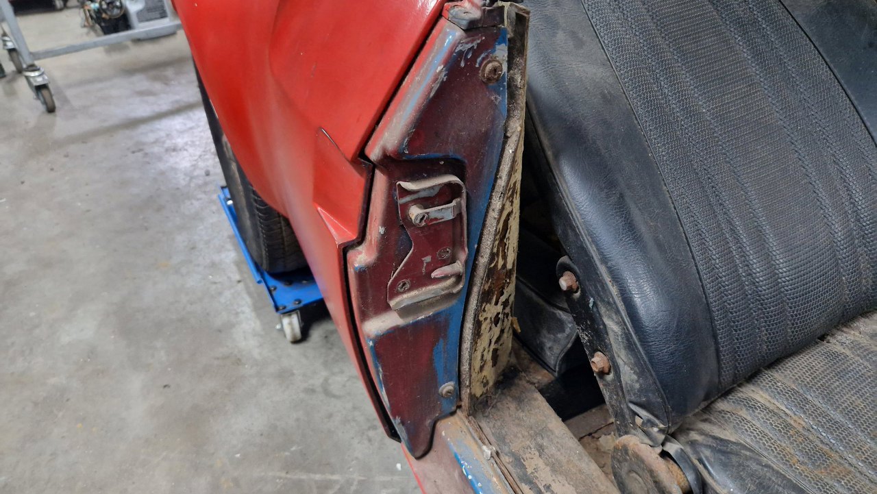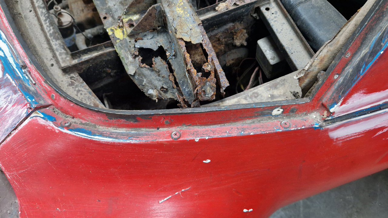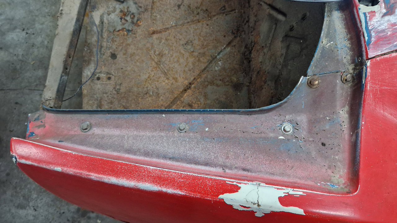Jak już się uporaliśmy (bo oczywiście Maciek tu nie tyle mocno bierze udział w pracach, tylko to on działa, a ja tylko pomagam) z rozłożeniem żółtej, przeszliśmy do ogarnięcia czerwonej. Pas tylny był luzem, więc nie trzeba go byo odkręcać. Krawędzie części laminatowych wymagają poprawek, ale jest to do zrobienia. Podłoga i ściana przednia bagażnika są tak pogięte i zardzewiałe, że mimo, że jeszcze są, to będą wycięte i zrobione nowe. Poprzeczka górna, z zamkiem, jest przerobiona i pogięta, prawdopodobnie zmienimy ją na tą z żółtej. Zawiasy tylnej klapy są z czegoś zupełnie innego, nie pasujące, z wyciętymi dziurami w podszybiu. To będzie trzeba poprawić. W tym miejscu błotniki są przykręcone do bocznych ścian bagażnika śrubami.