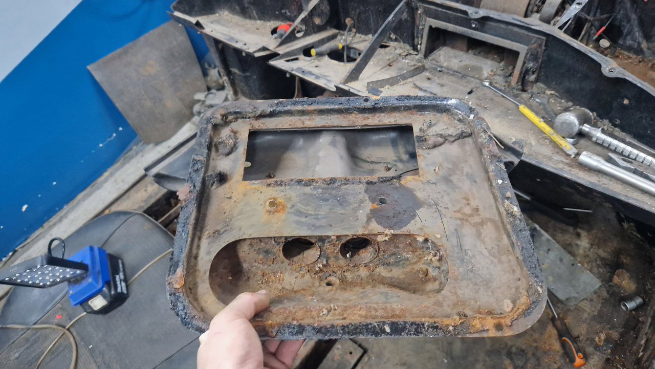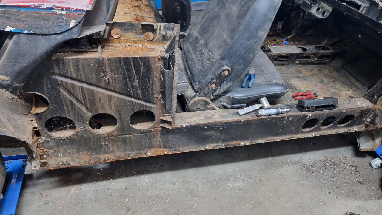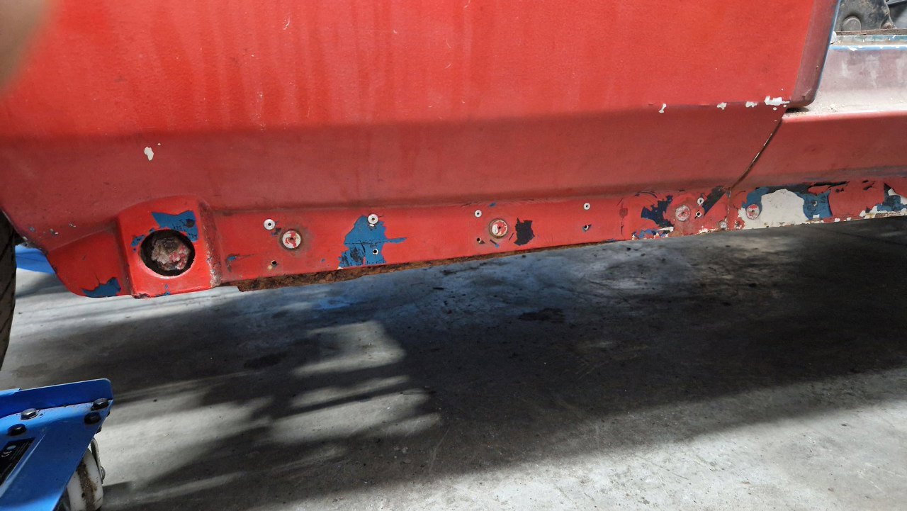 Potem zdjęliśmy próg. Oryginalnie wsuwa się go od dołu w rowek wzdłuż dolnej krawędzi drzwi, a potem nituje na dole do podwozia. Z tej strony ktoś już był, i naprawiał blachę naspawując arkusz na wszystko, zasłaniając też otwory.