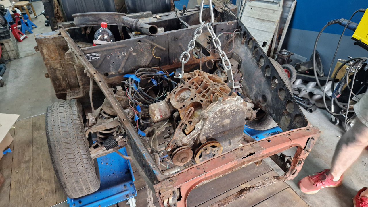 Jedną półoś dało się odkręcić, w drugiej jedna ze śrub się nie chciała poddać, więc odcięliśmy krzyżak. Po silniku zostały tylko łapy z poduszkami. To się przyda, bo pomysł na ten samochód zakłada użycie V4, ale nieco dłubniętej.