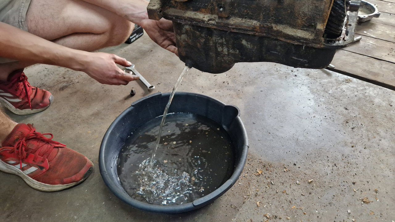 Po odkręceniu korka spustu oleju spotkało nas spore zaskoczenie - w środku, zgodnie z przypuszczeniami, nie było w ogóle oleju, ale za to spuściliśmy z 7 litrów wody.