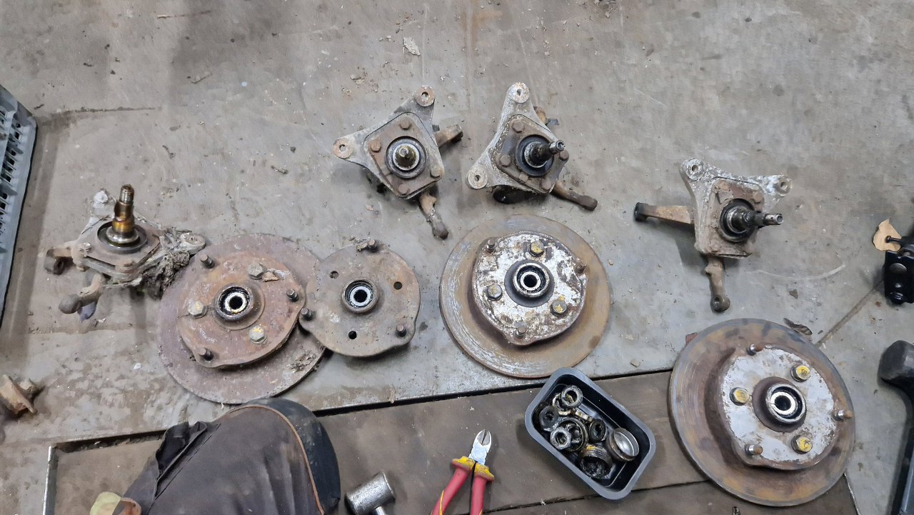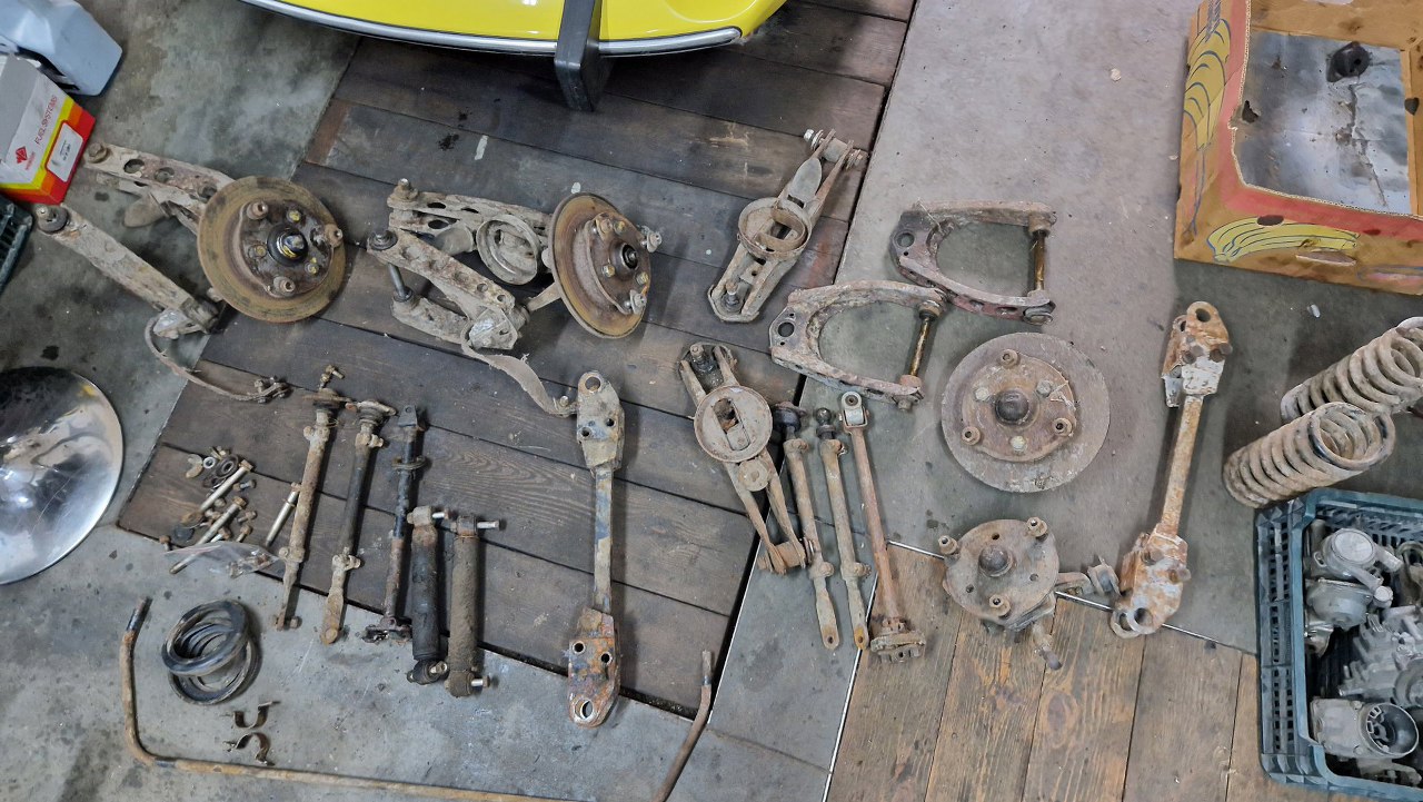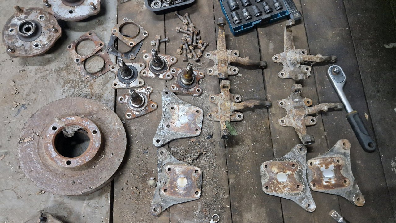 Po rozłożeniu samochodu mieliśmy się wziąć za przygotowania do blacharki, ale Maciek przypadkiem trafił na sklep z częściami do Matry. Takiej okazji nie mogliśmy zmarnować, więc dług syna u mnie znowu wzrósł i kupiliśmy trochę gratów do zawieszenia. Jak są, to trzeba brać, prawda? To trochę zmieniło nam plany - postanowiliśmy ogarnąć zawieszenia, żeby pozbyć się tego, co będzie do wywalenia, a to, co zostaje, odnowić, poskładać, i odłożyć do archiwum. Wyciągnęliśmy więc najpierw części z przednich zawieszeń z obu Matr.
