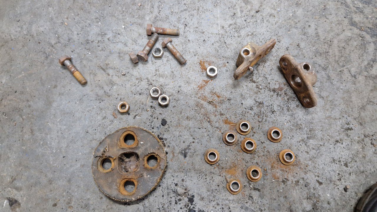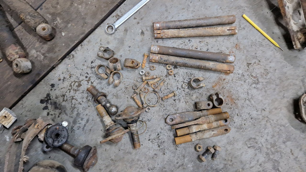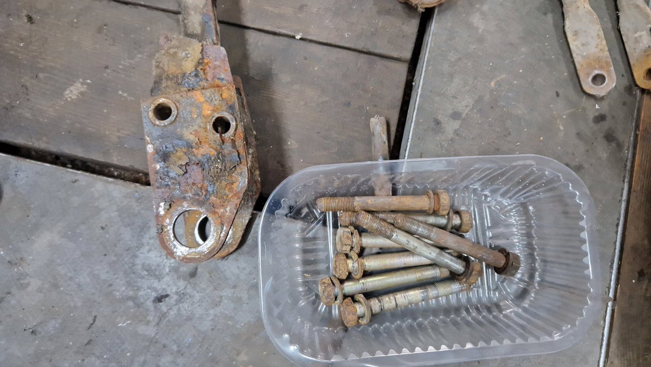 I zaczynamy je przygotowywać. Śrubki i detale inwentaryzujemy, żeby trafiły na swoje miejsca, inne części przygotowujemy do piaskowania. Tu belka przednia i jej śruby.