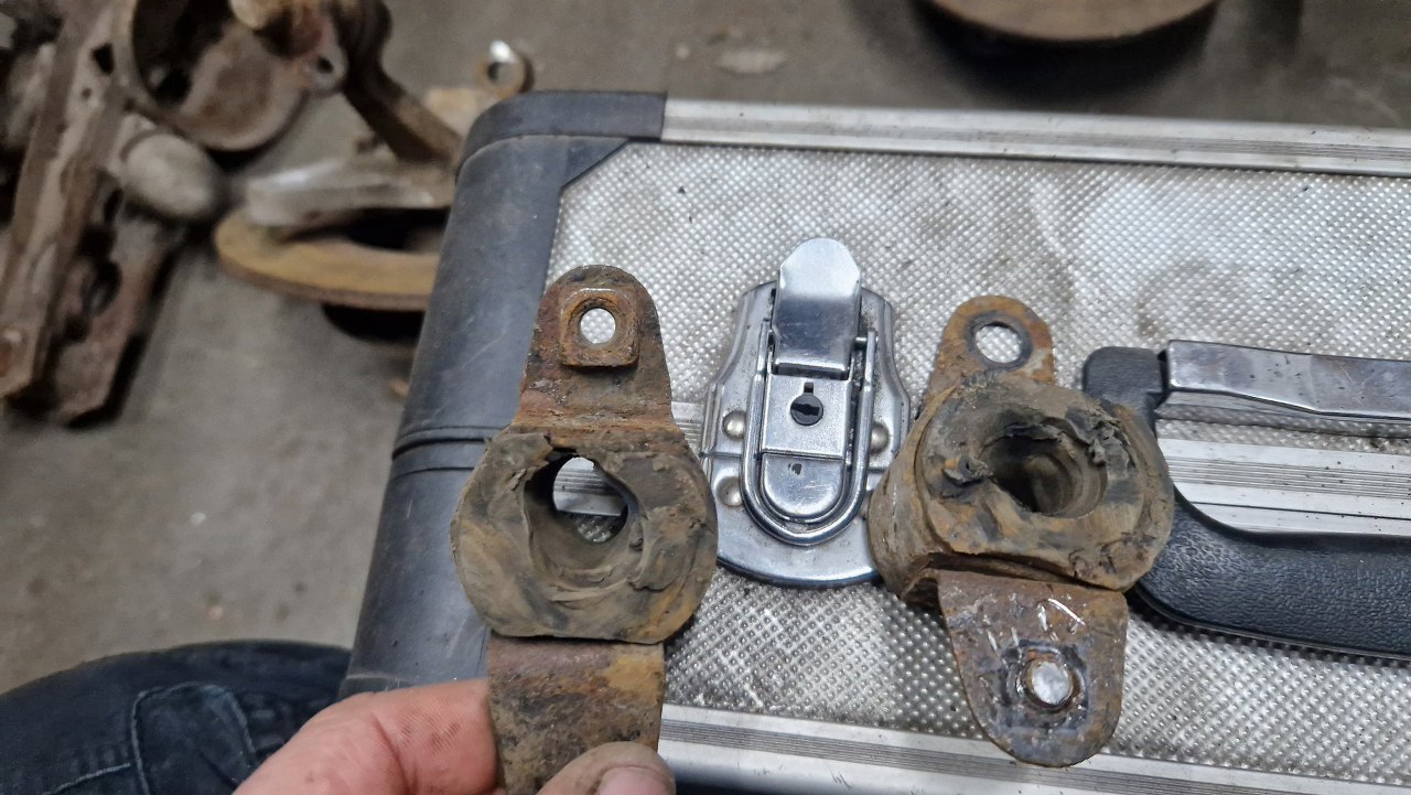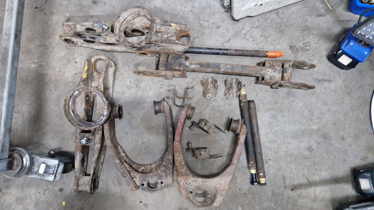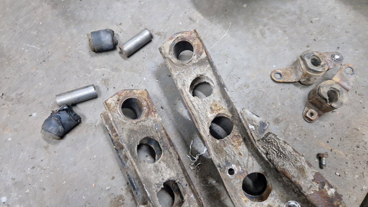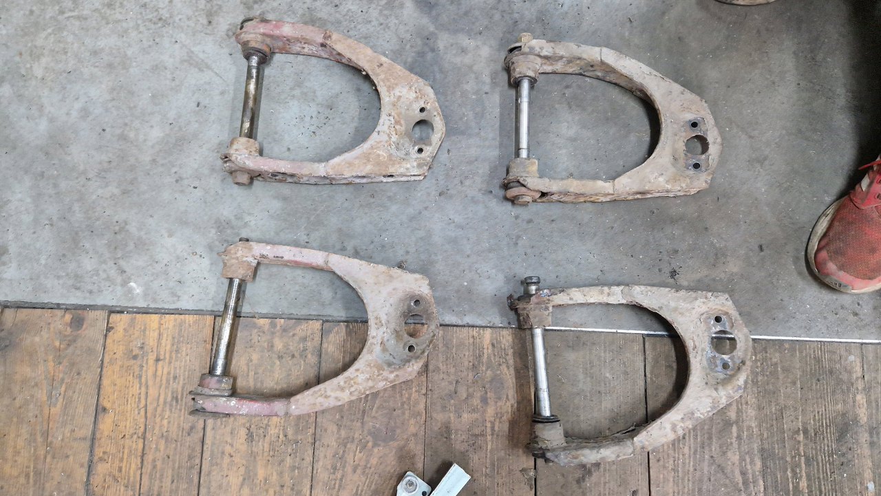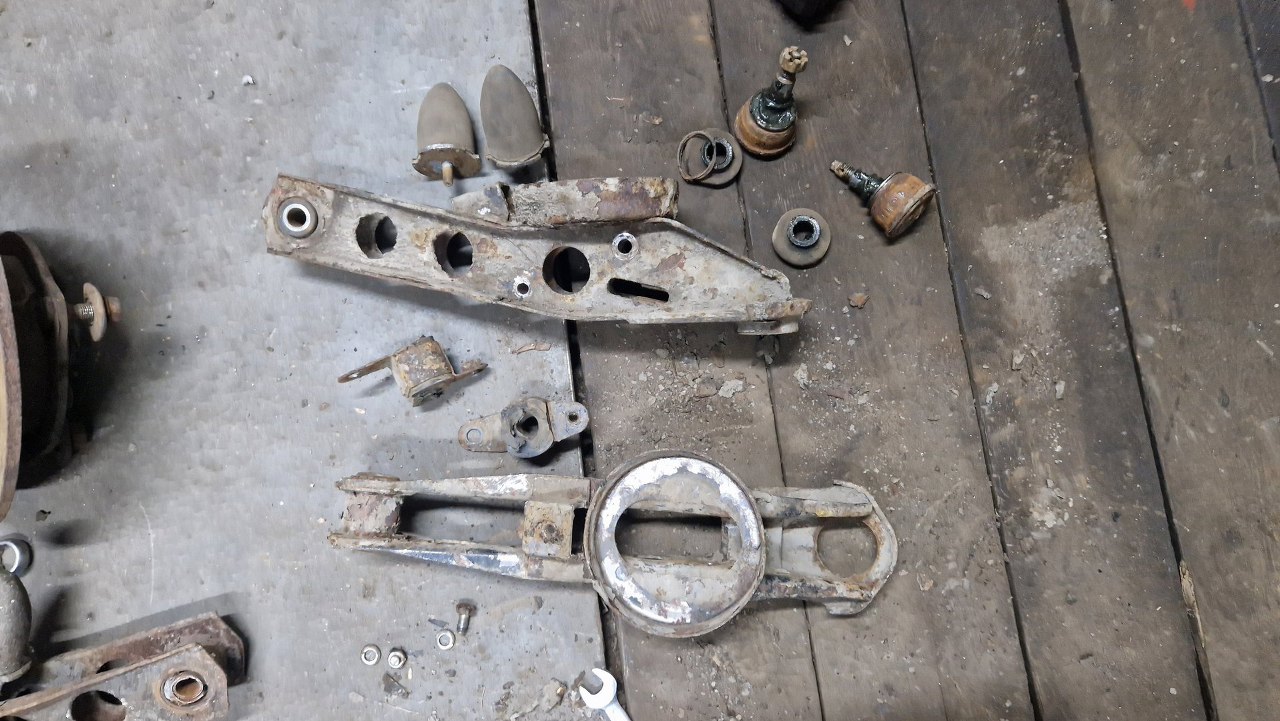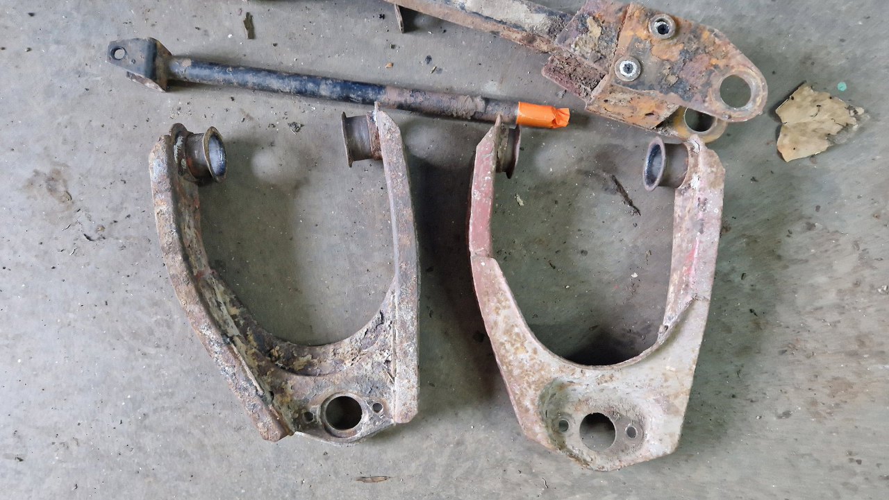 Z dolnych wahaczy odkręcone zostały odboje (takie same są w Peugeocie 104 zdaje się, ale te są ok), wycisnęliśmy na prasie sworznie i gumy. W wahaczach z żółtej Matry sworznie były przyspawane :). W środku, pomiędzy wahaczami widać mocowania gum stabilizatora, wyciągnięte ze środka wahaczy.