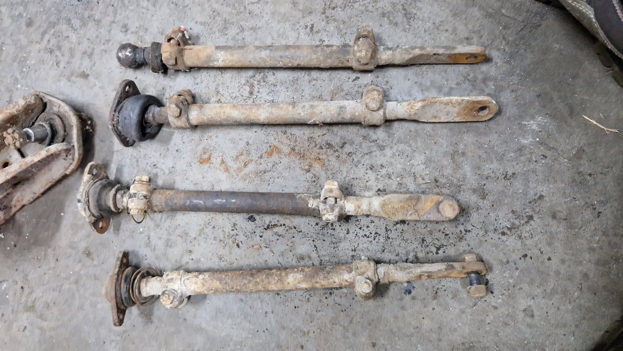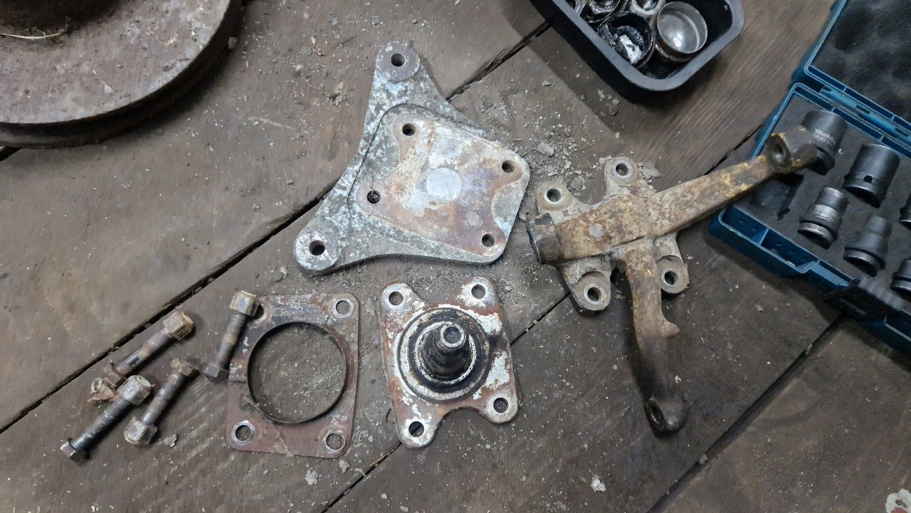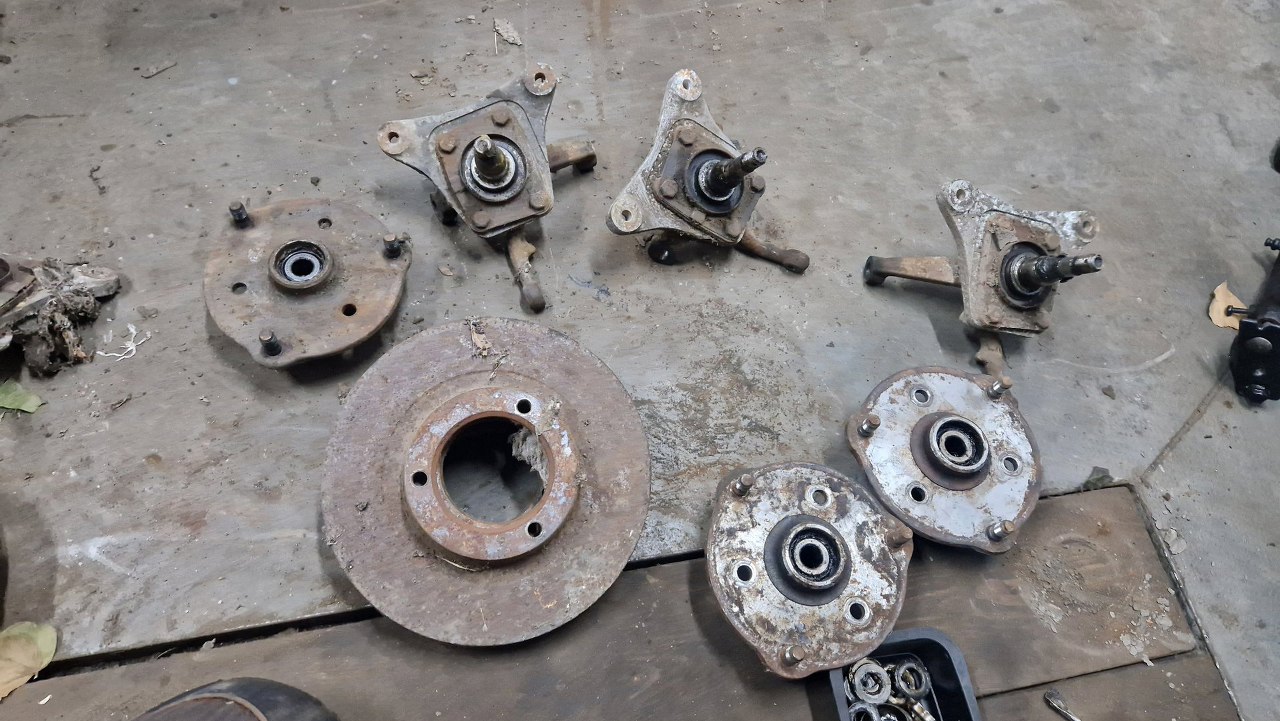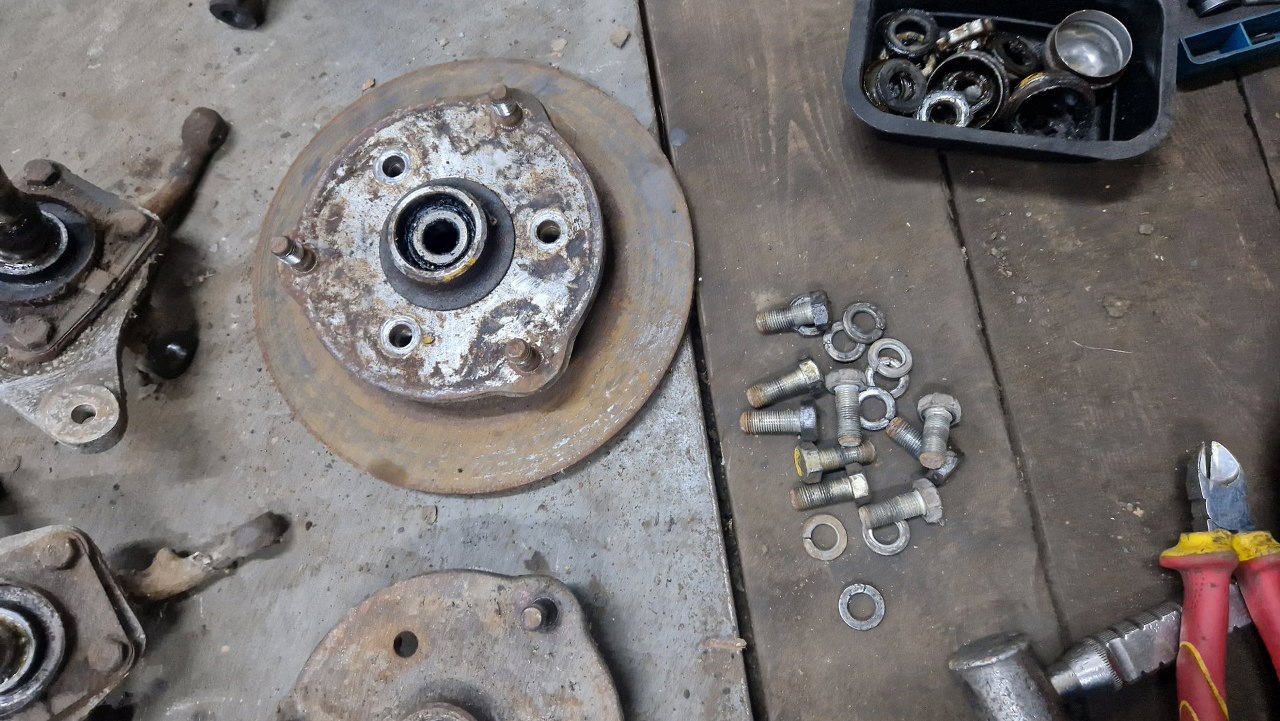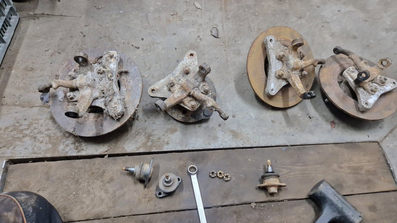 Rozłożone w drobny mak. Tu przegub, który Maciek znalazł w sklepie wydawał mi się znajomy. Sprawdziłem, i taki sam był w Alfie Romeo 115, którą robiłem. Zaryzykowałem i kupiliśmy te sworznie w sklepie Alfy, gdzie były zdaje się ciut tańsze, okazały się identyczne.