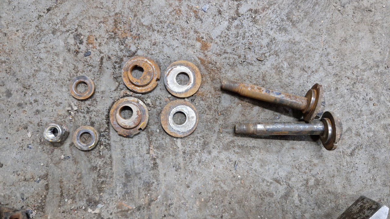 Są też śruby mocujące dolne wahacze do belki zawieszenia, z mimośrodowymi podkładkami do regulacji geometrii.