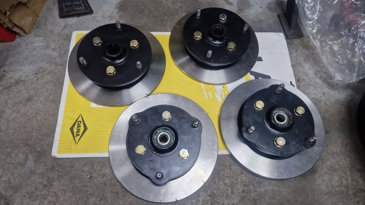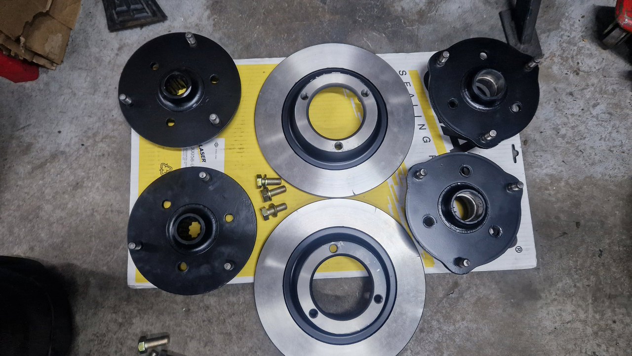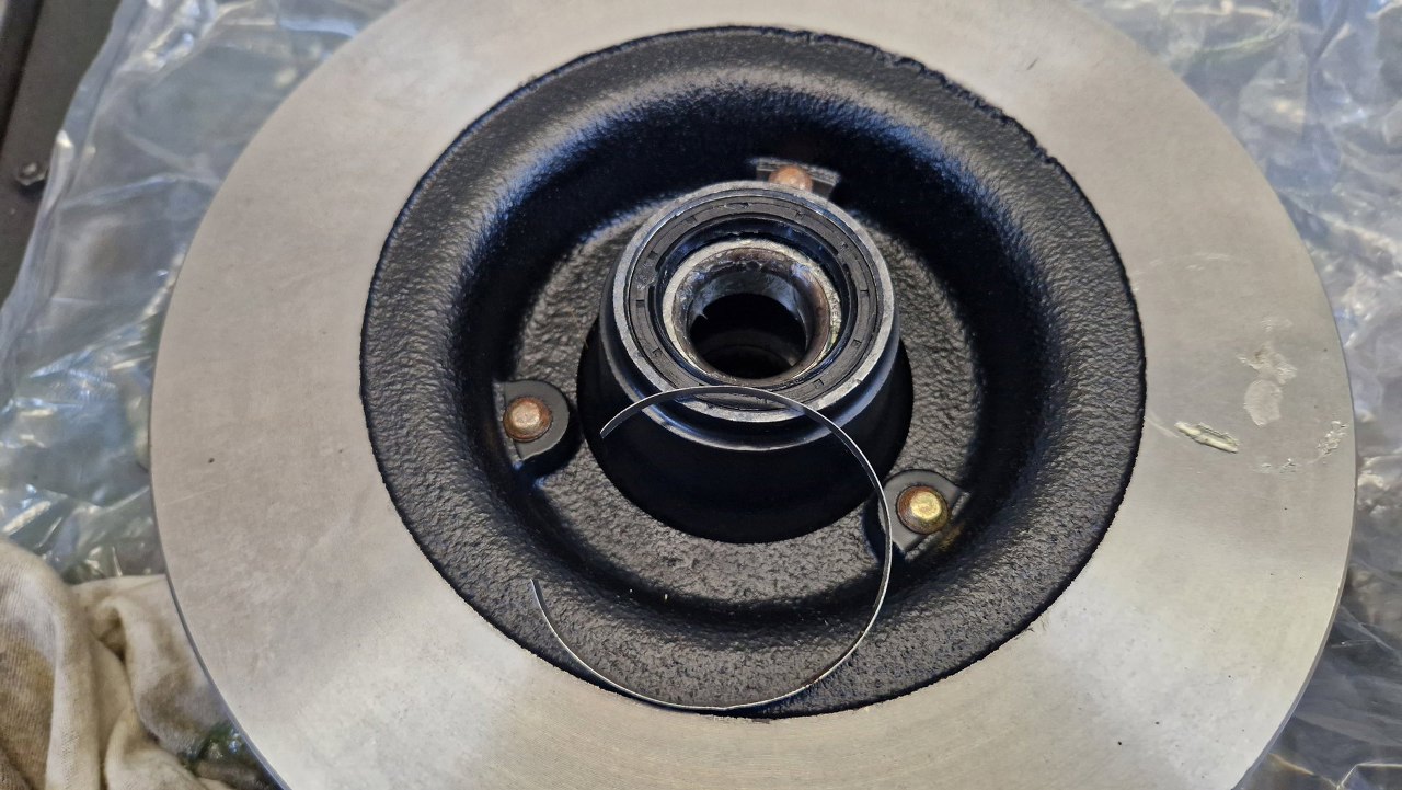 Można już było skręcić piasty z nowymi tarczami hamulcowymi. Póki co odkładamy to na bok.