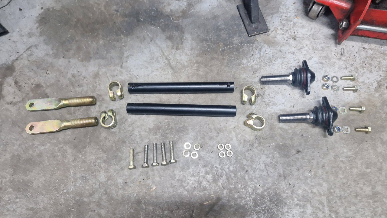 Przygotowaliśmy części składowe drążków reakcyjnych. Mimo czyszczenia gwintów, ciężko się to wszystko skręca. W rurkach środkowych Maciek zdecydował się za moją namową wywiercić po otworze, żeby było jak kręcić rurką regulując geometrię zawieszenia. Gwinty po obu stronach są lewe i prawe, więc kręcąc rurką wydłużamy lub skracamy drążek.