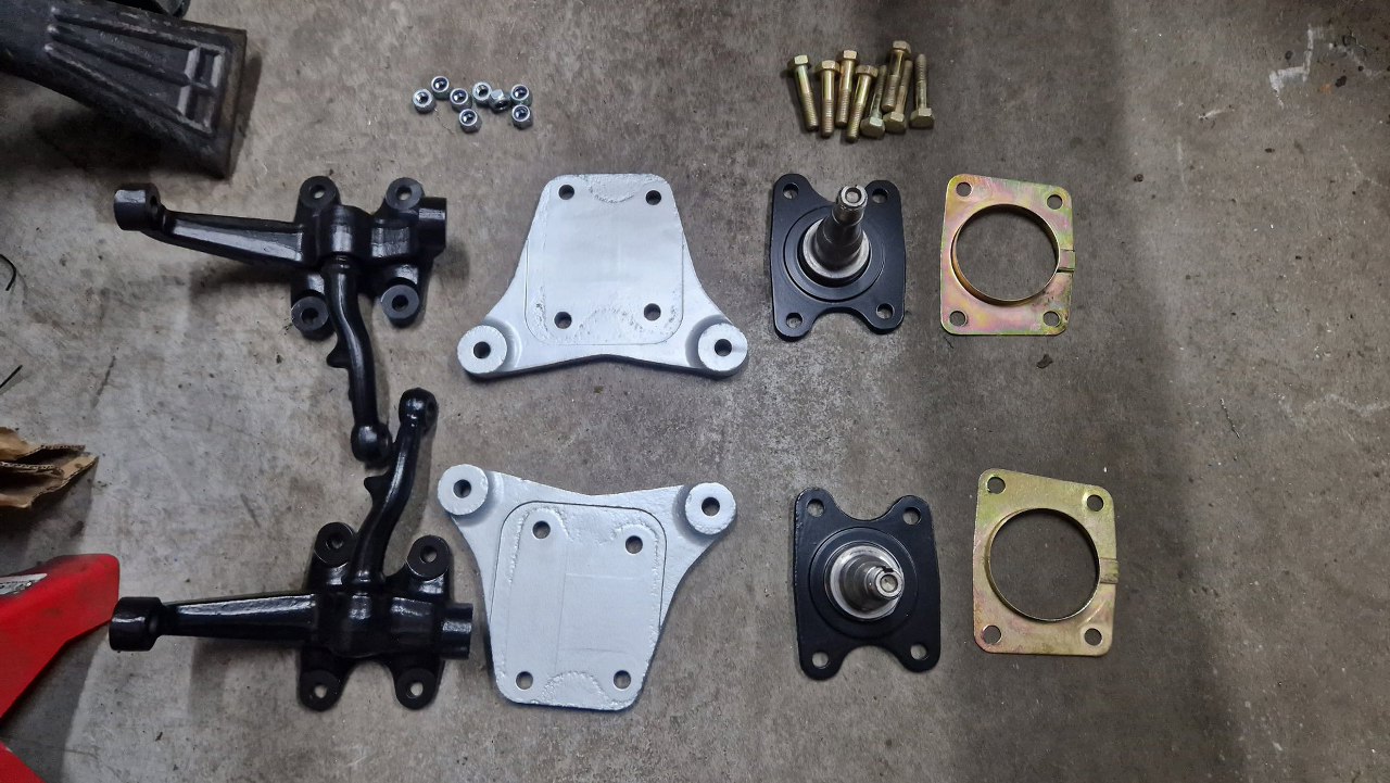 Przechodzimy do zwrotnic. Tu trochę kombinowaliśmy ze śrubami - oryginalnie były tu M9. Nie byłoby to problemem, gdyby oryginalne nakrętki nie były już zardzewiałe na amen. Nowych prawie nie ma w przyrodzie, albo kosztuje jedna tyle, co 3kg zwykłych M8 na przykład. W końcu wpadłem na pomysł, żeby zastosować tu śruby calowe, 3/8" UNF. I problem rozwiązany :). 3/8" to ciut powyżej 9mm.