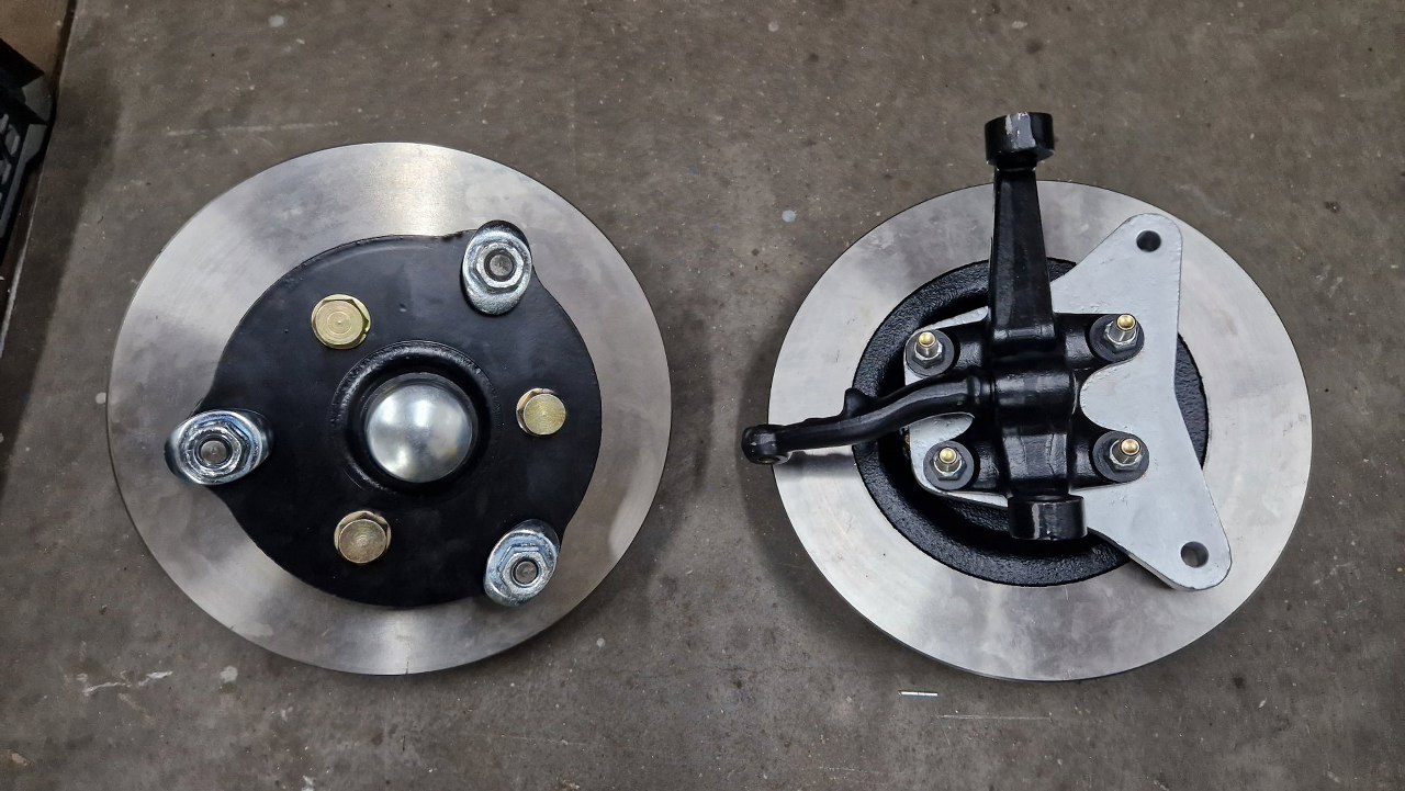 Tymczasem zaczęły przyjeżdżać z Francji pierwsze części. Tarcze okleiliśmy i zostały pomalowane w miejscach, gdzie nie pracują klocki hamulcowe. Będzie to schludniej wyglądać, jeśli tu nie będzie rdzy.