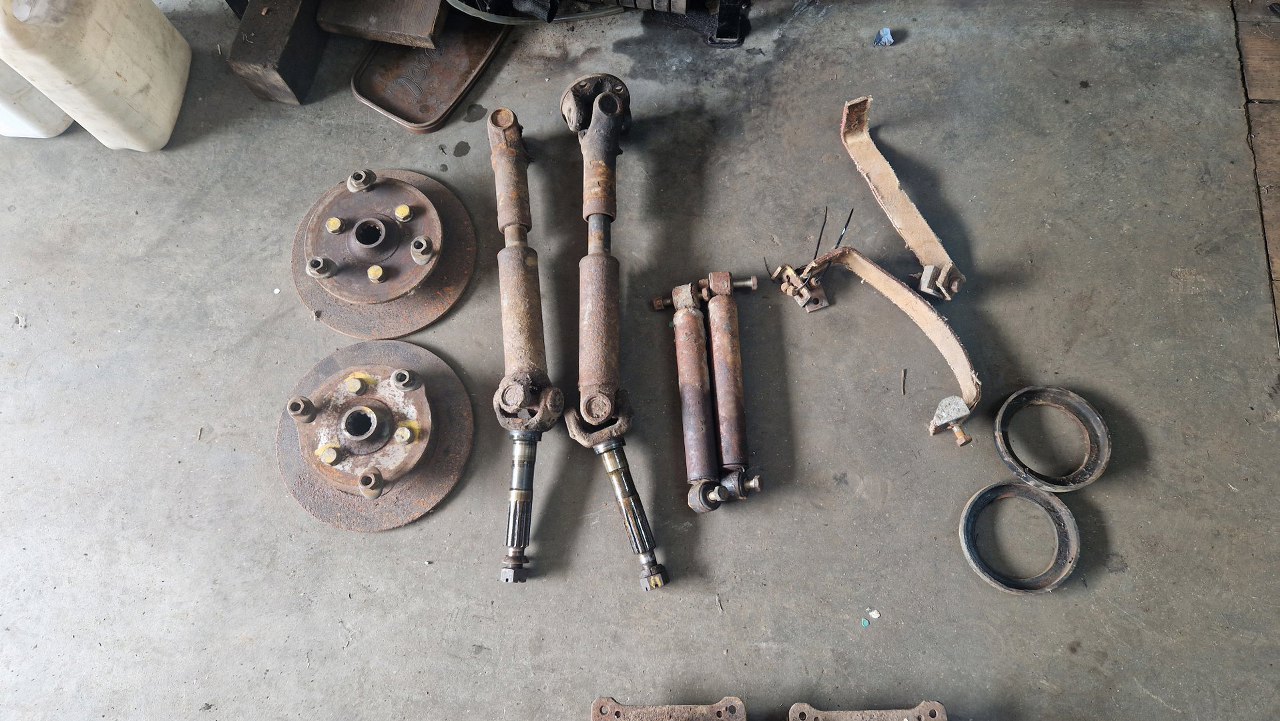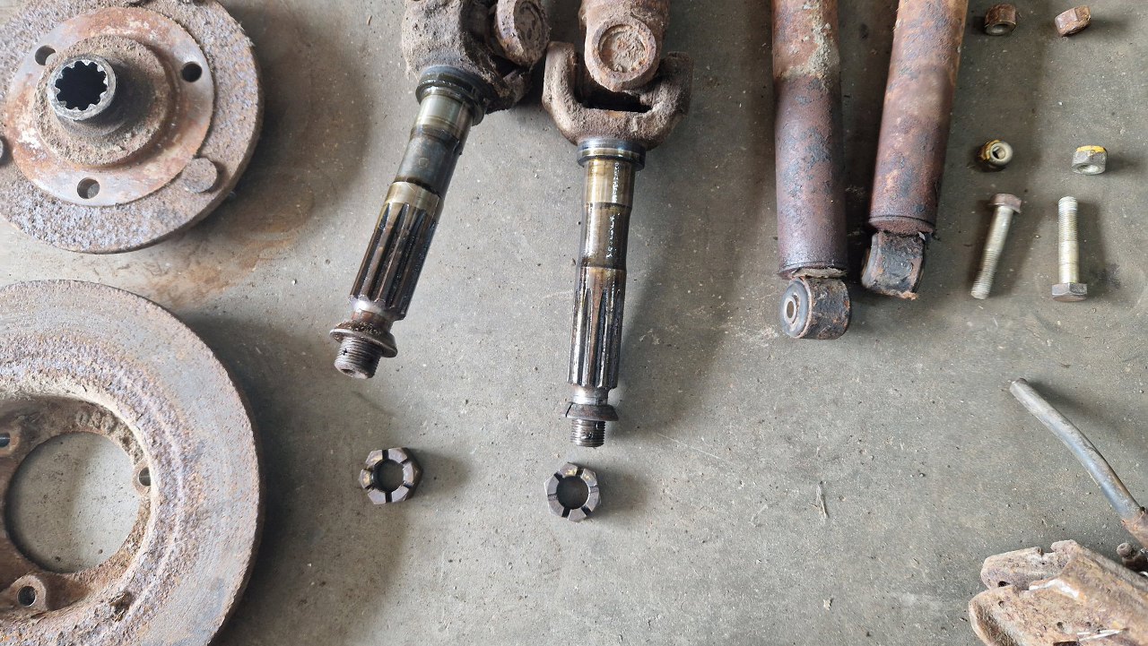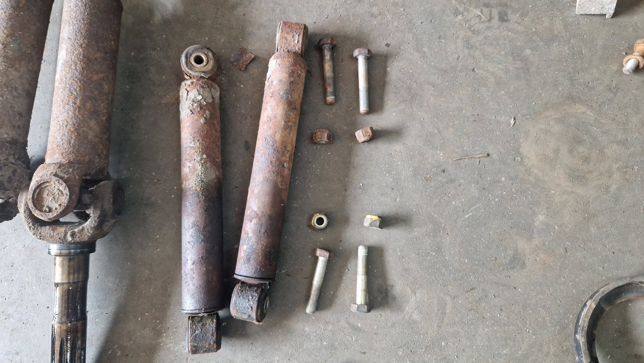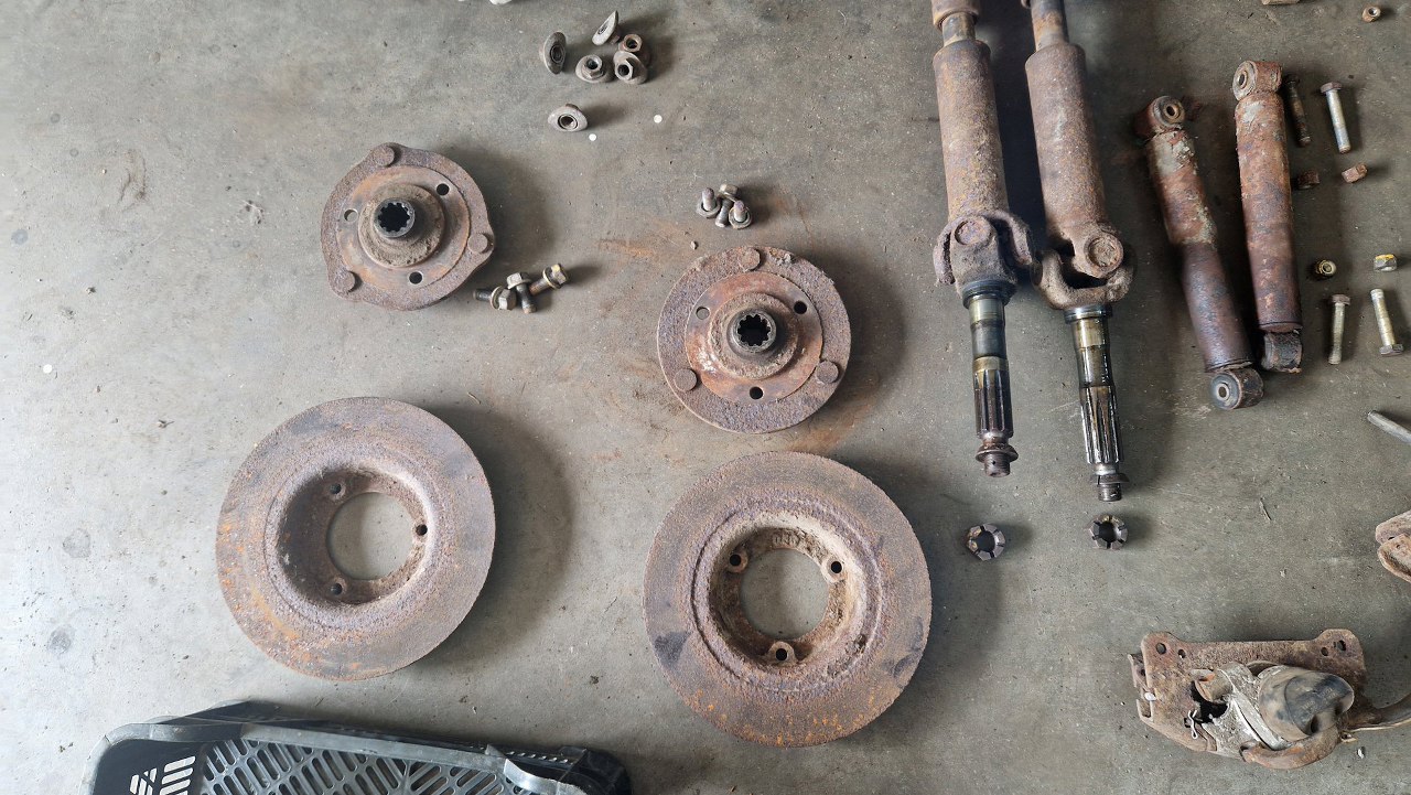 Oczywiście równolegle z przednim zawieszeniem ogarnięte zostało i tylne. Już podczas zdejmowania zawieszenia z karoserii (jednej i drugiej) zdemontowaliśmy piasty i półosie (tak było wygodniej) i paski ograniczające skok zawieszenia.