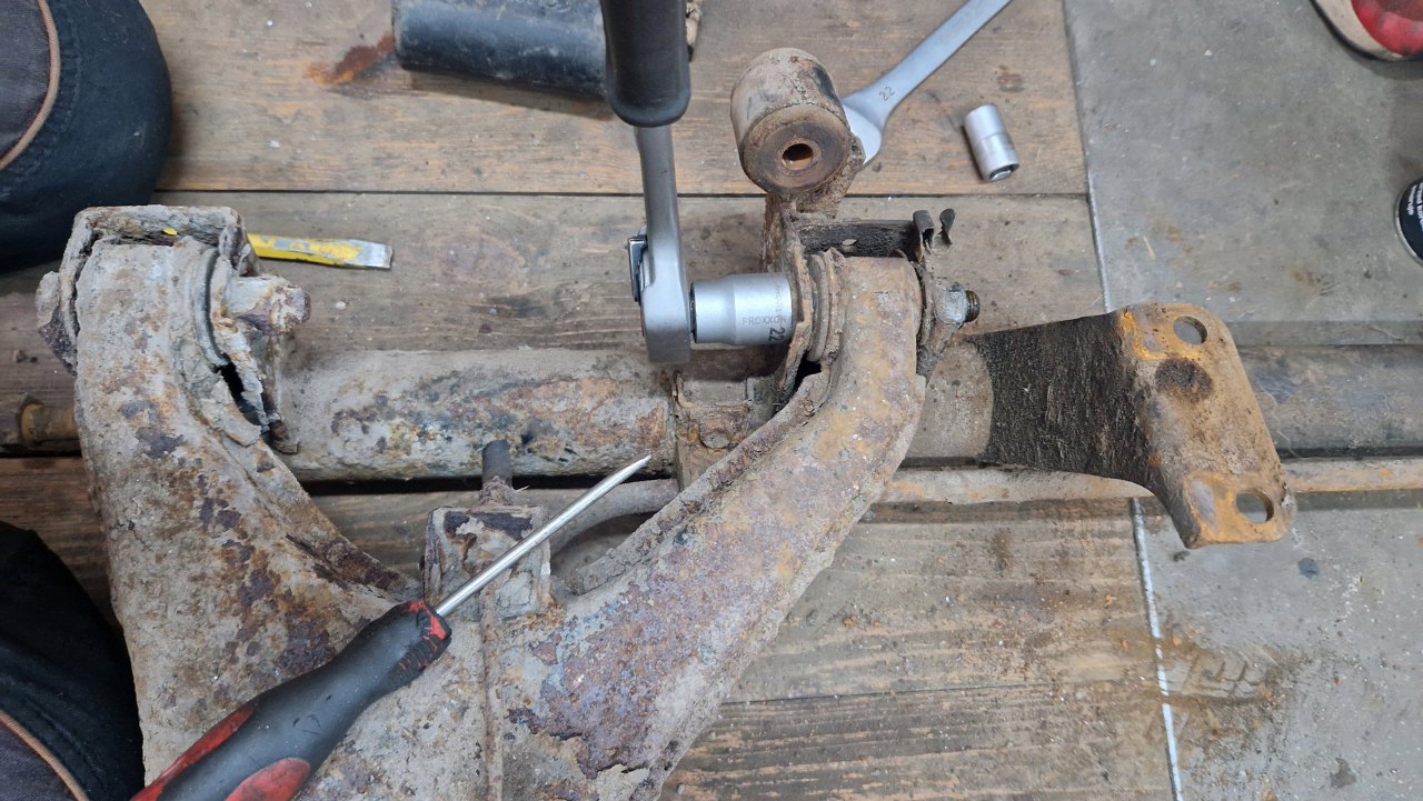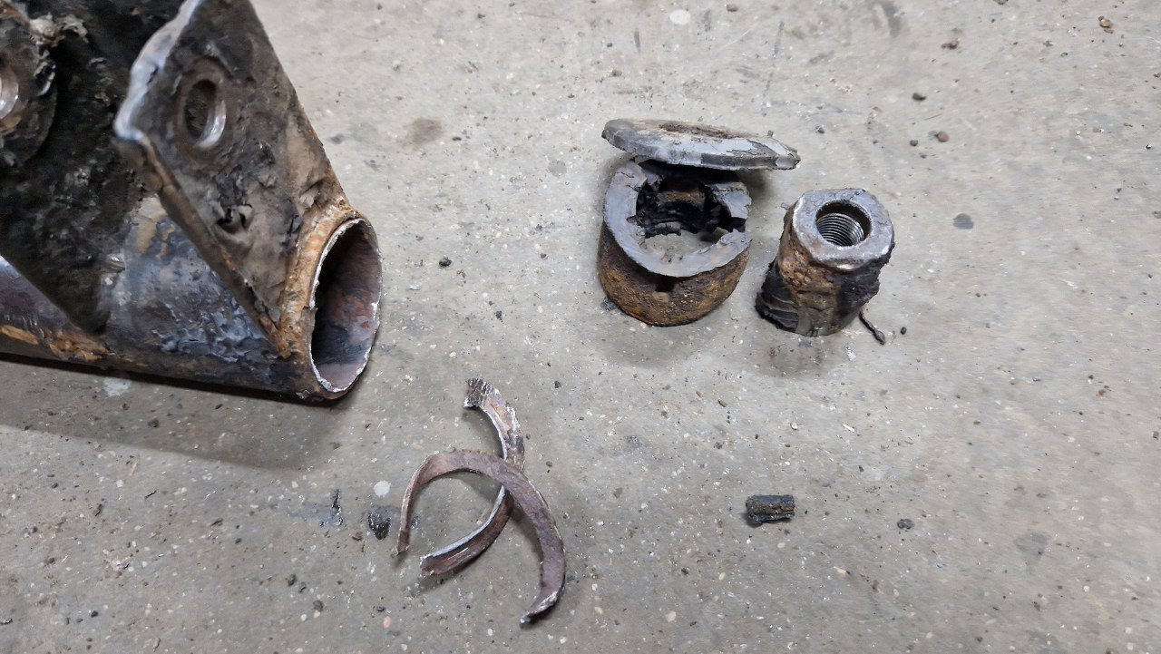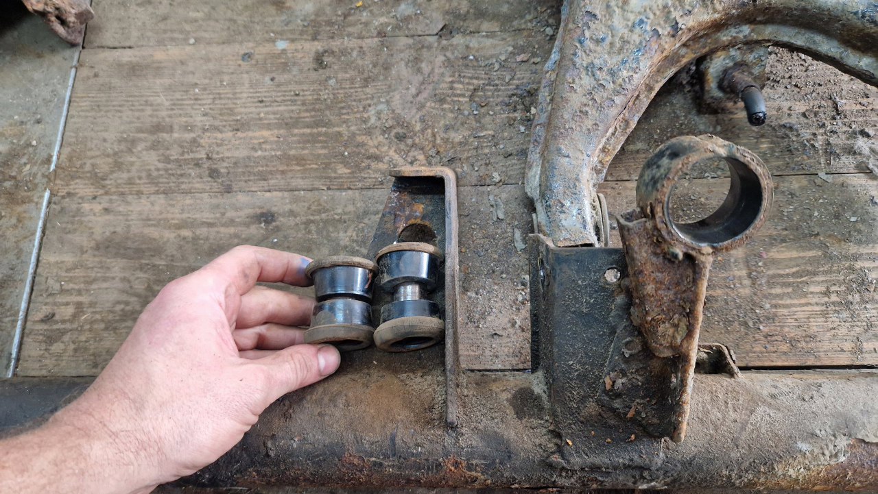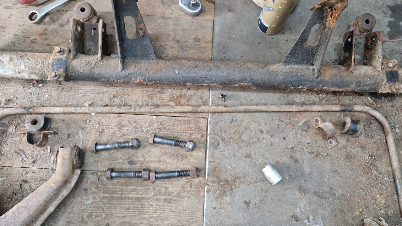 Wybraliśmy lepszą belkę zawieszenia i wyjęliśmy z jej końców gumy mocujące do nadwozia. Tych gum niestety nie ma nigdzie dostępnych, więc będziemy kombinować skąd je wziąć.