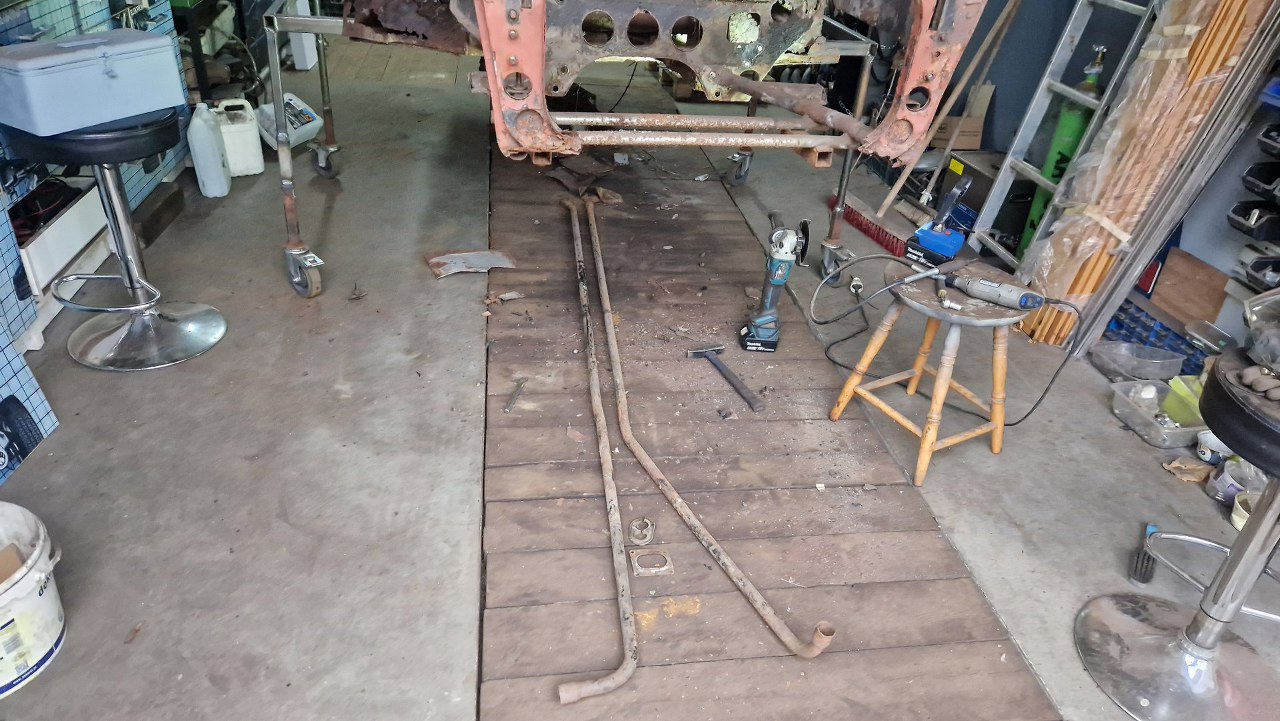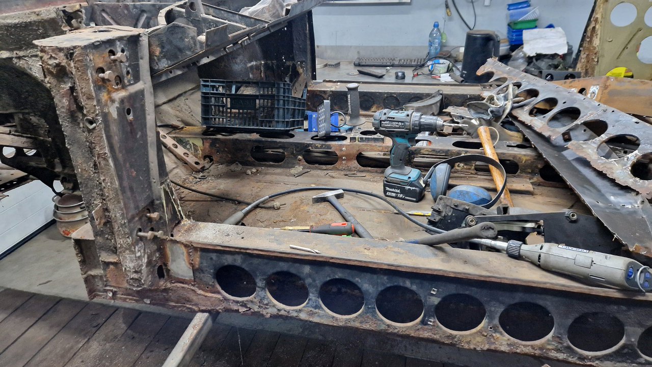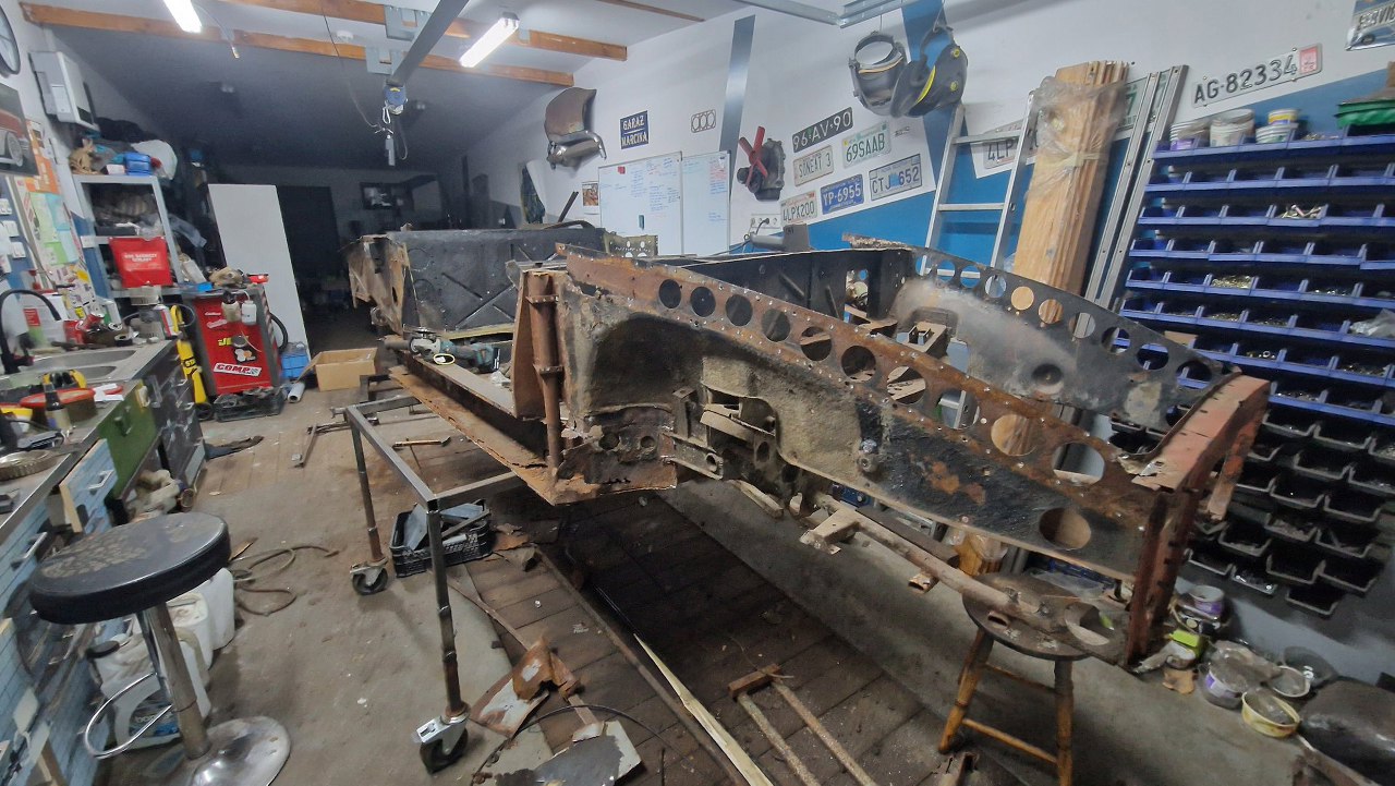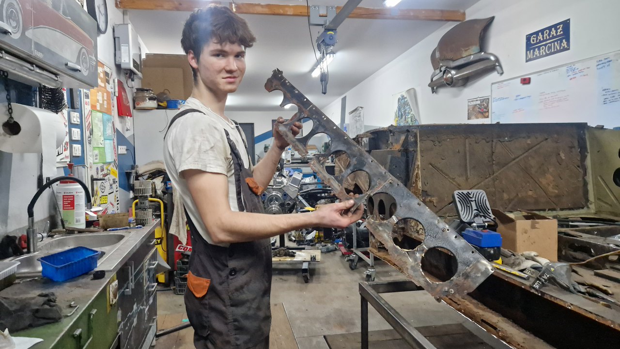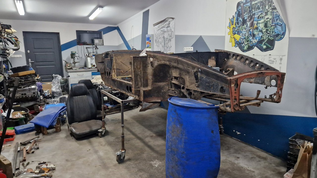 Pora porzucić przyjemne prace i przejść do blacharki. A ta akurat w przypadku tego egzemplarza będzie... hm... rozległa. Najpierw Maciek wyspawał ramę, żeby Matrę mieć trochę wyżej. Poza tym, przynajmniej przez pewien czas umożliwi to trzymanie nad ramą do Forda F1, którego równolegle składam.