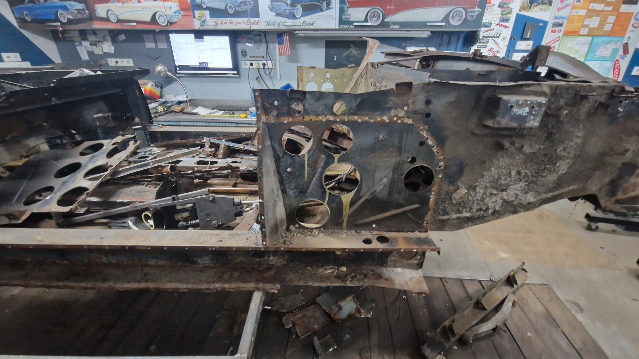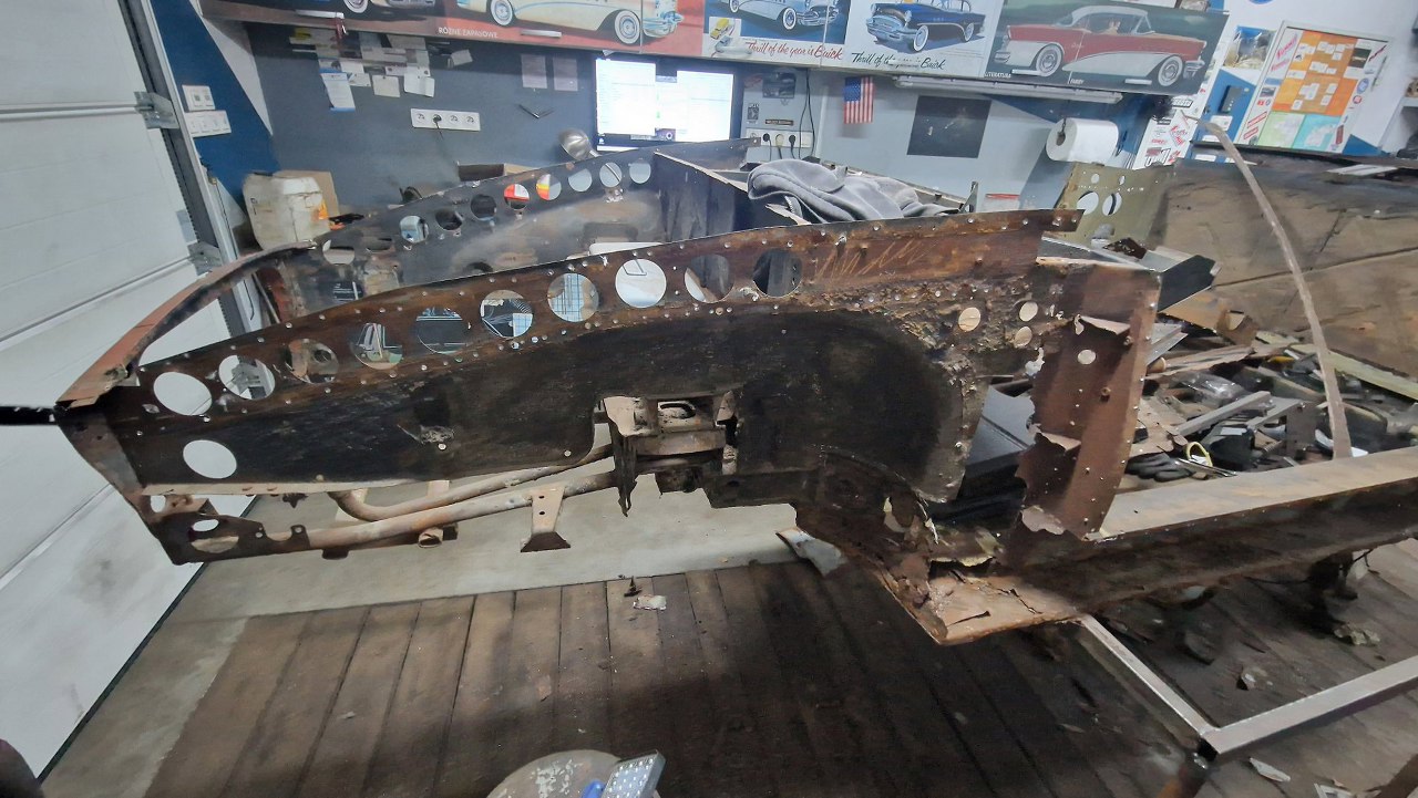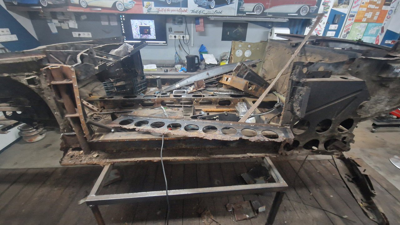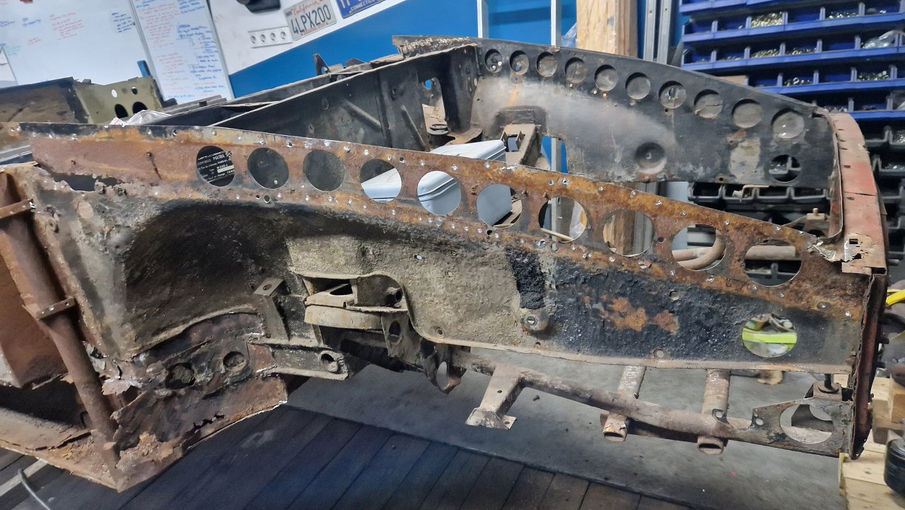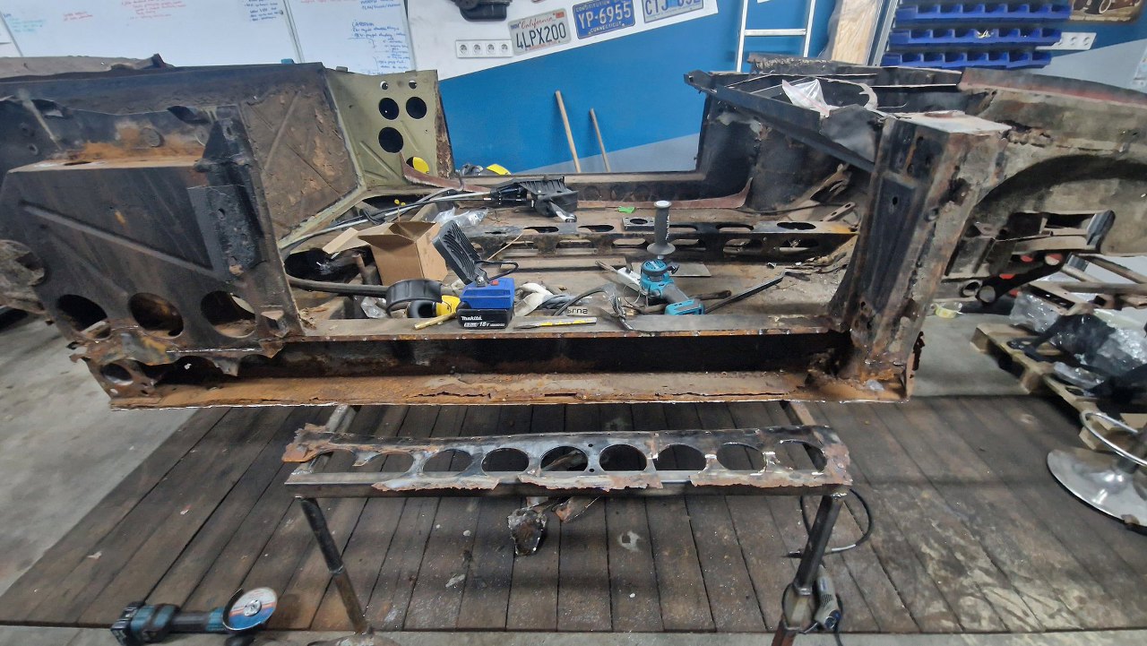 Pora porzucić przyjemne prace i przejść do blacharki. A ta akurat w przypadku tego egzemplarza będzie... hm... rozległa. Najpierw Maciek wyspawał ramę, żeby Matrę mieć trochę wyżej. Poza tym, przynajmniej przez pewien czas umożliwi to trzymanie nad ramą do Forda F1, którego równolegle składam.