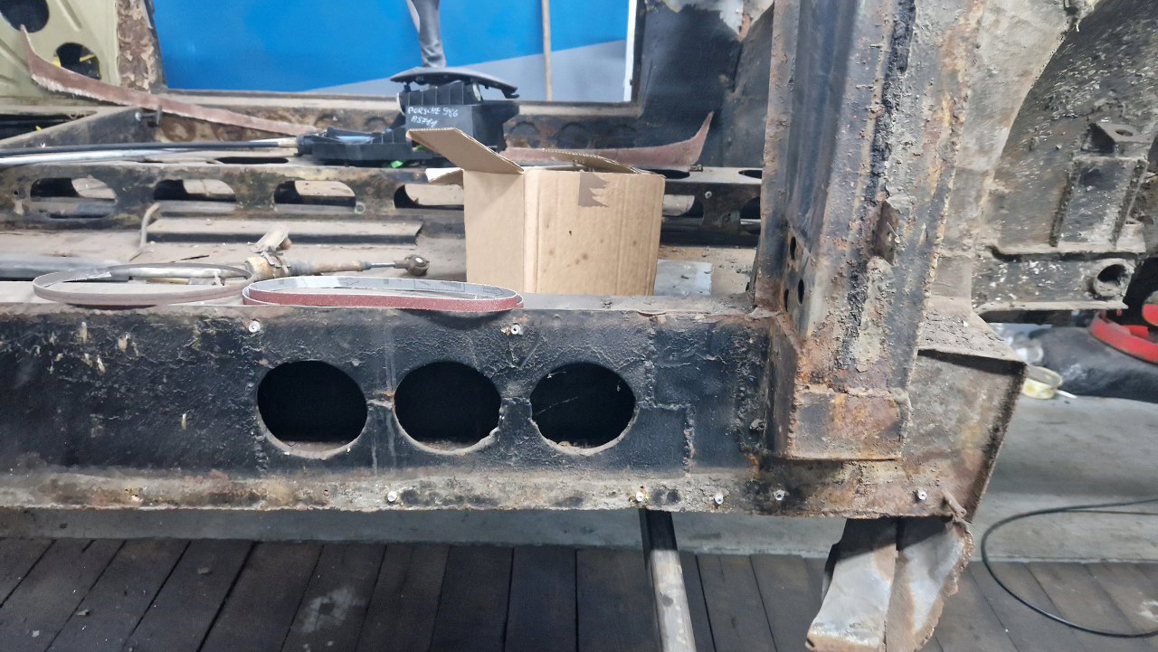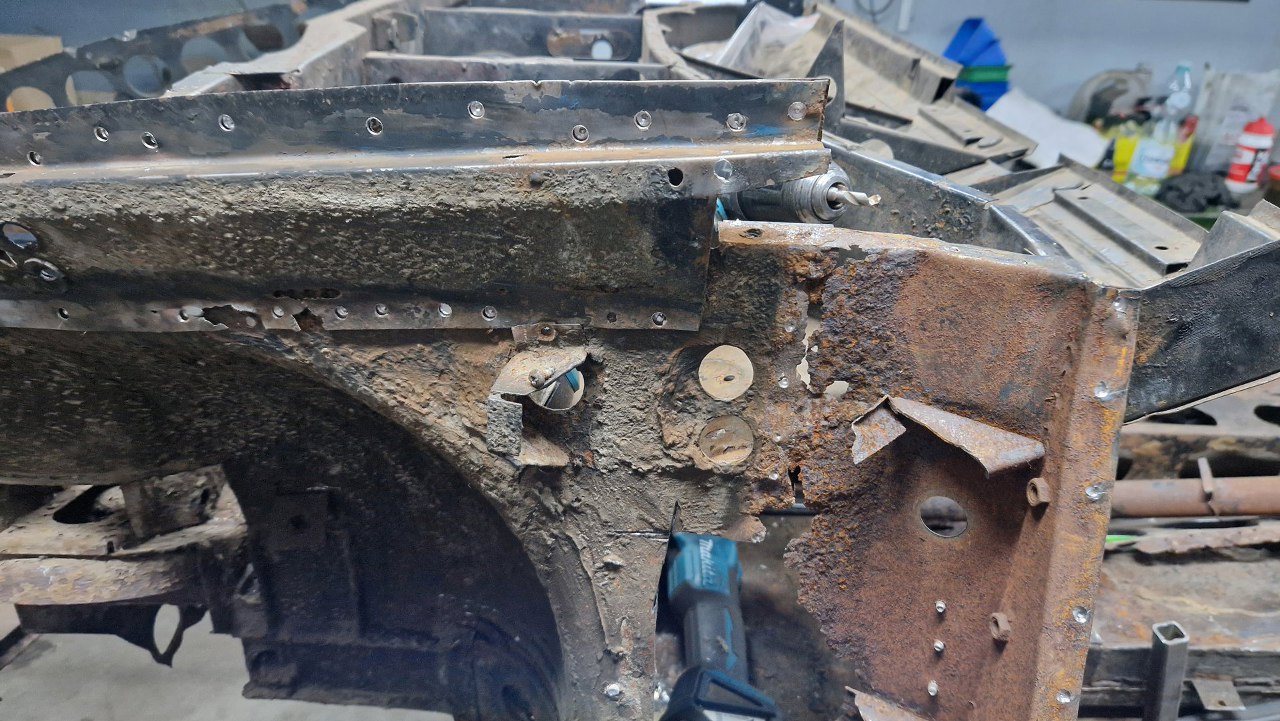 Z przodu odwiercone są wzmocnienia u góry fartuchów, do tych wzmocnień przykręcane są błotniki przednie. Częściowo są zardzewiałe, ale też chodzi o to, żeby się dostać do środka i tam wszystko wypiaskować.