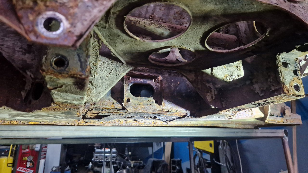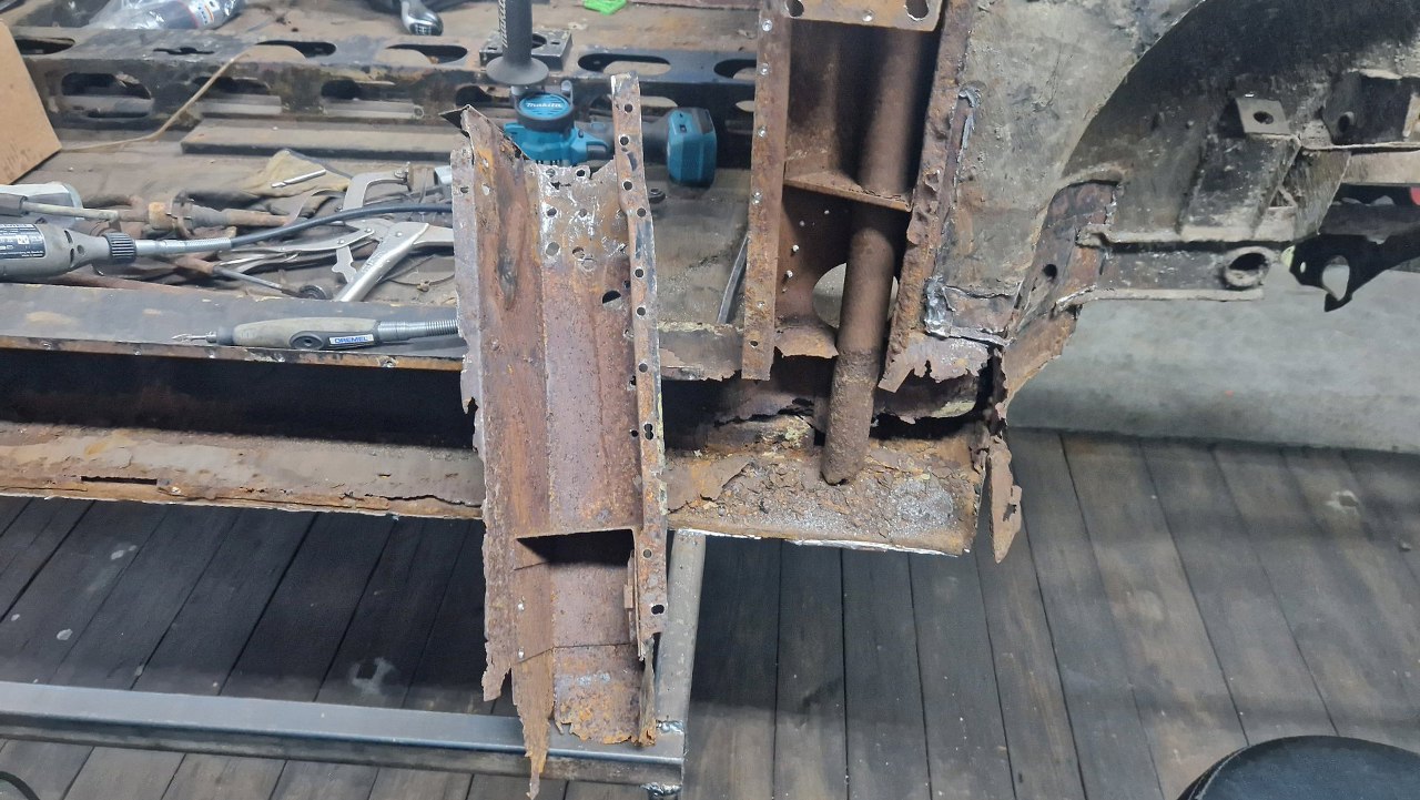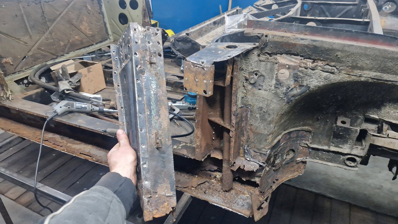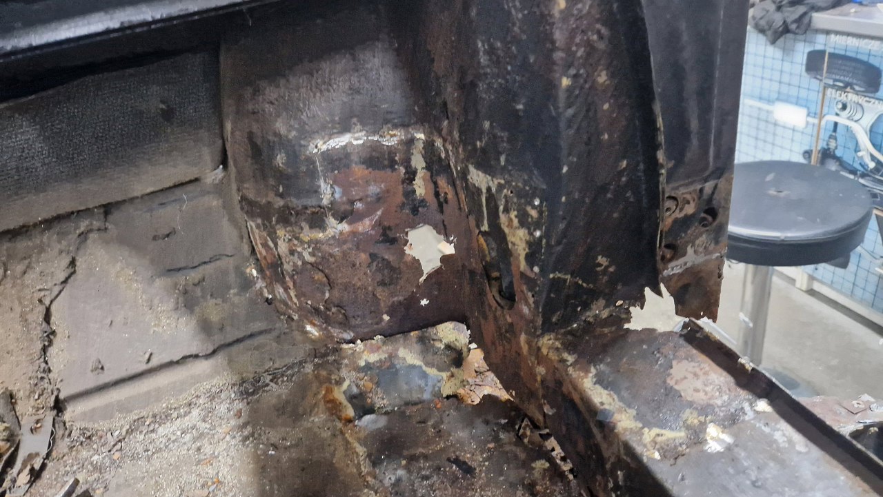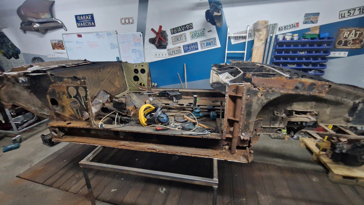 Tu jest trochę mniej łat, ale i sporo rdzy. Zdjęty słupek A (który prawdopodobnie będzie musiał być dorobiony cały nowy).