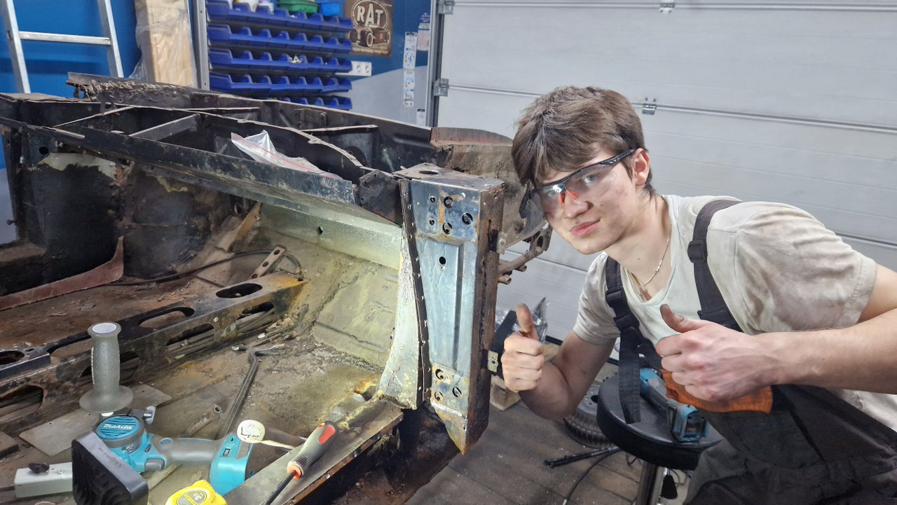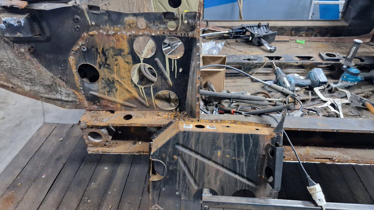 Pora zacząć ciąć metal i kzesać iskry. Na pierwszy ogień idą wspawane łaty. Mamy tu naspawaną blachę na oryginalny próg.