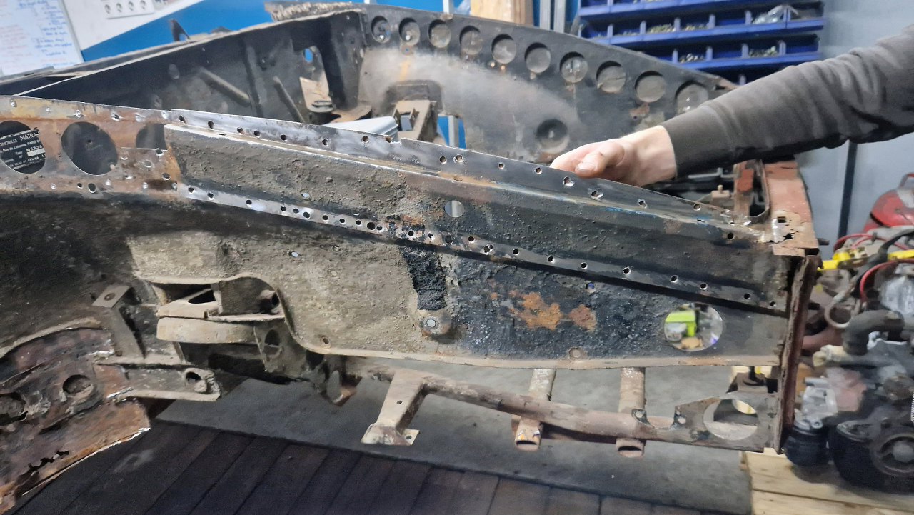 Ten próg zewnętrzny ma u góry rynienkę - w nią wchodzi laminatowe poszycie progu. To uważam za oryginalny sposób mocowania poszycia, więc będziemy to dorabiali nowe.