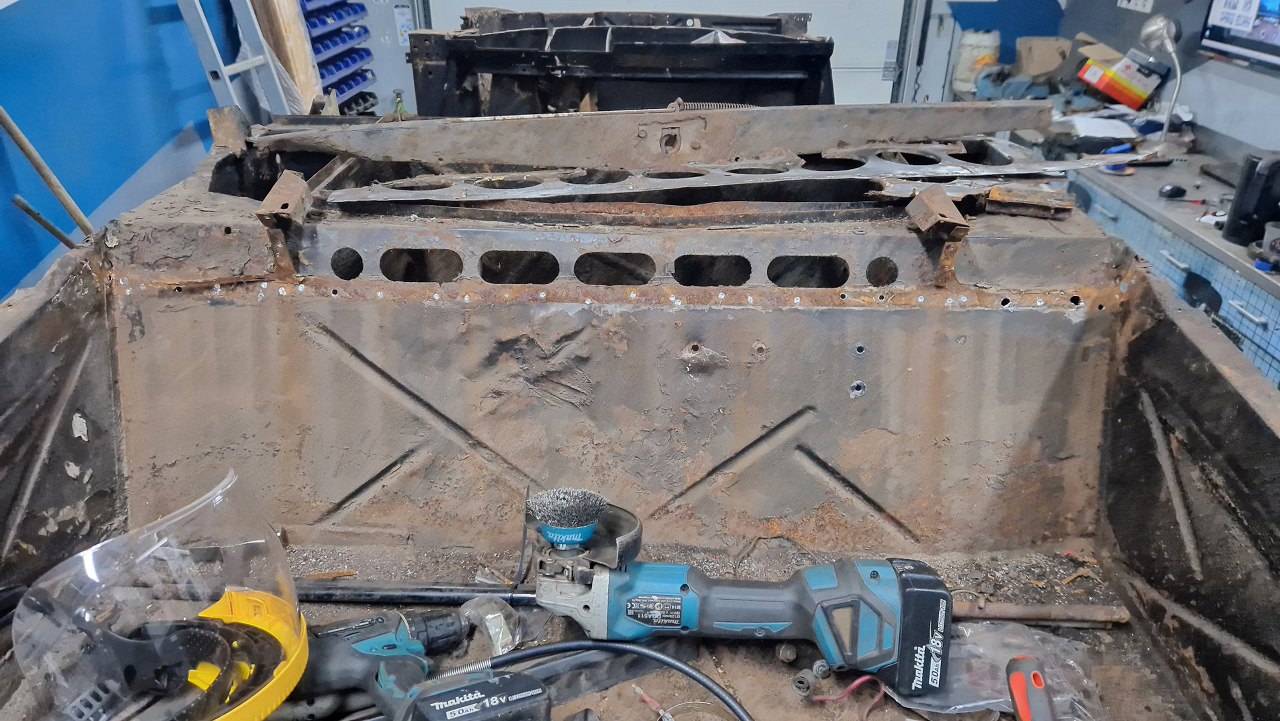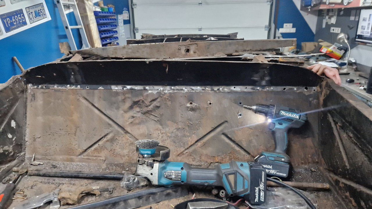 Przejdźmy na tył samochodu. Tu jeszcze trochę można wyciąć :). Do grodzi między bagażnikiem a komorą silnika, u gory jest przymocowana blacha, do której dochodzi podszybie. To musi zniknąć, żeby można się było dostać do tej pionowej, pogiętej blachy.