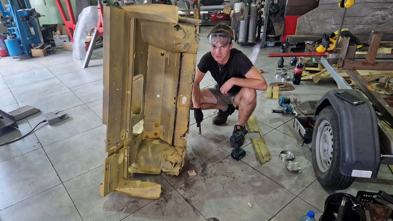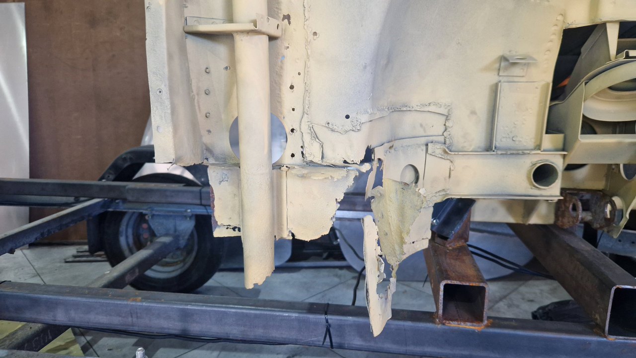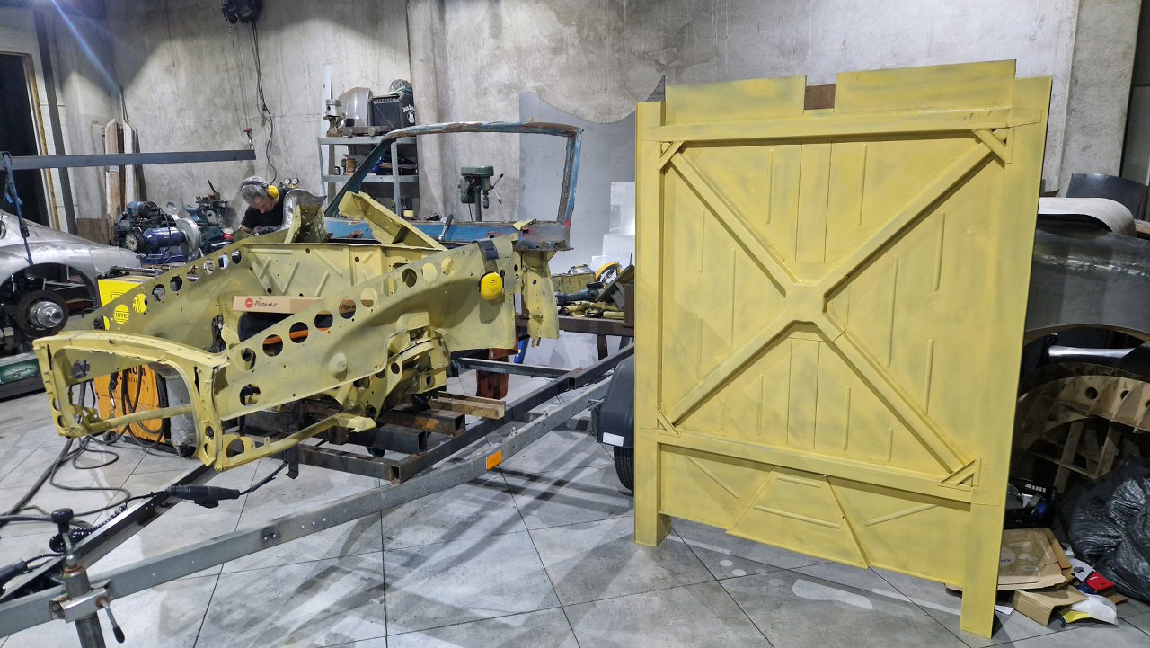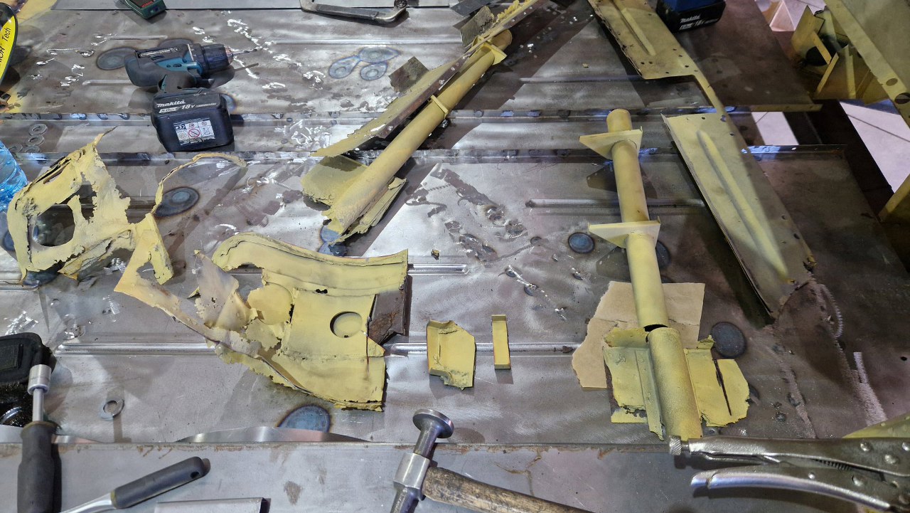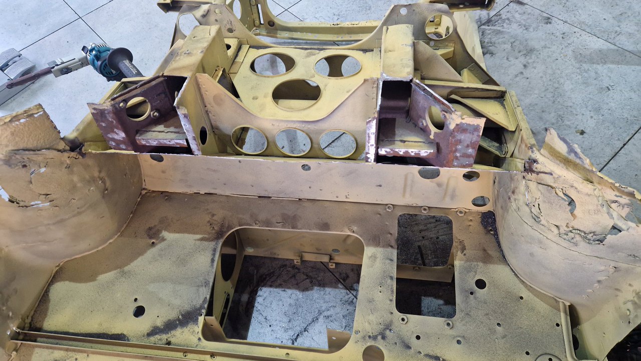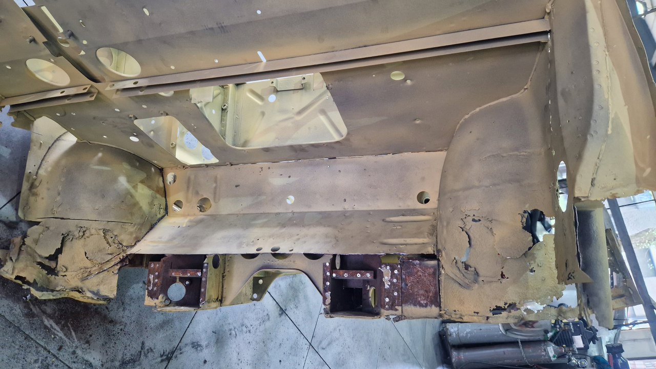 Zdjęliśmy podłogę i pomalowaliśmy ją podkładem reaktywnym. Jak ją teraz wkręcimy w ramę podwoziową, to dopiero jak będzie solidnie połączona z przodem nadwozia będzie można to ruszyć.
