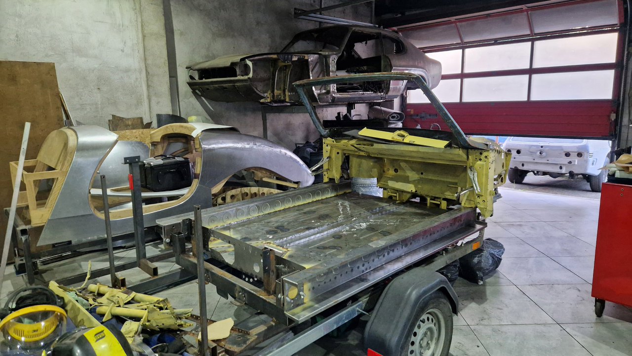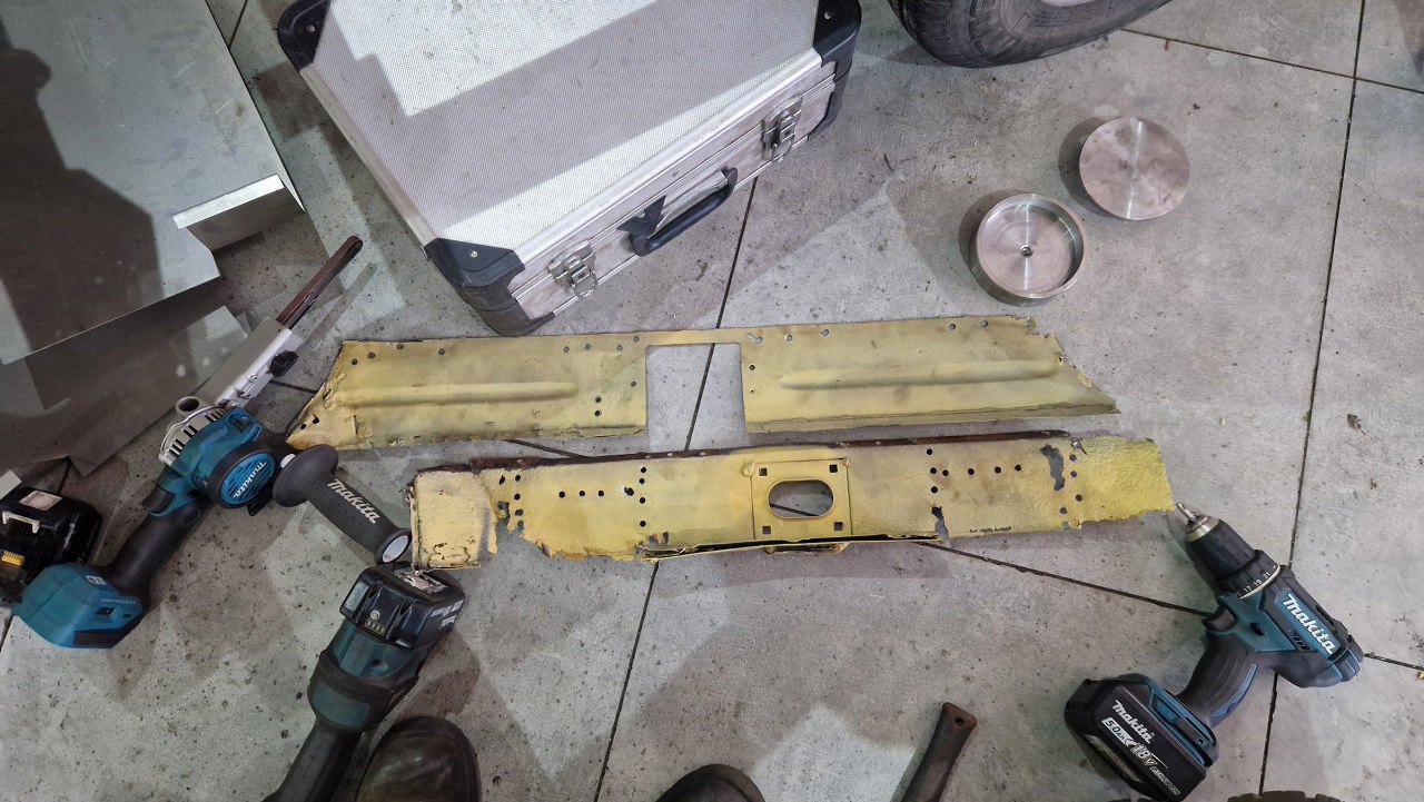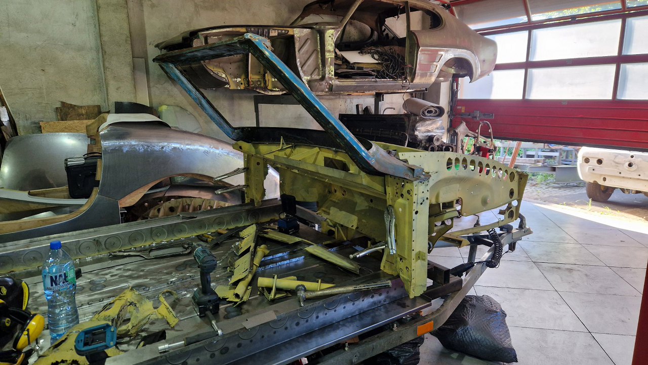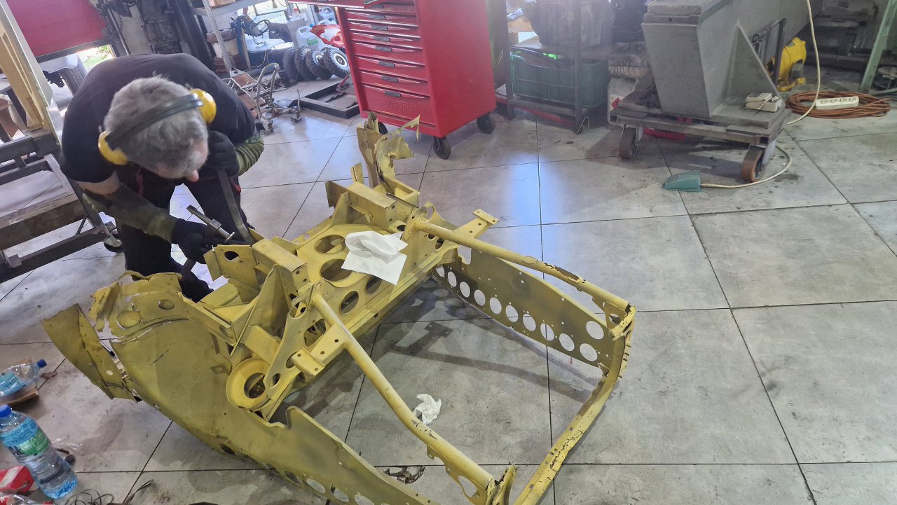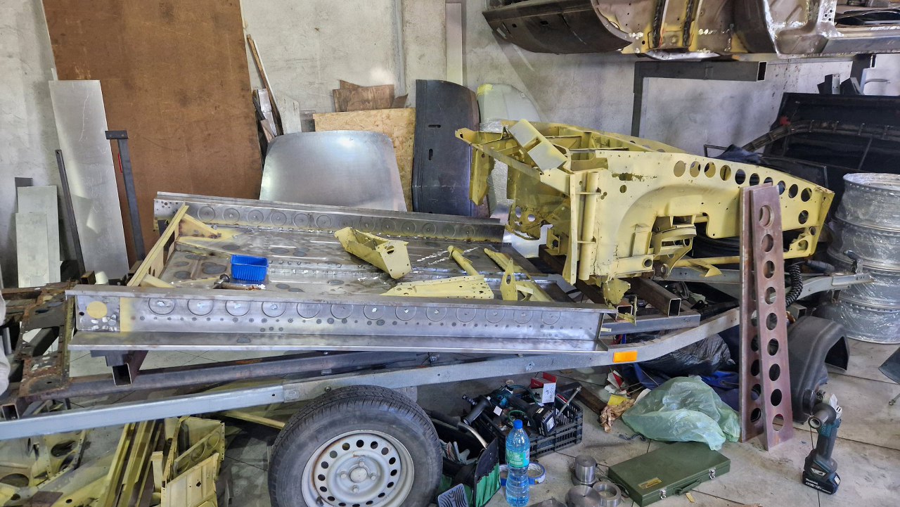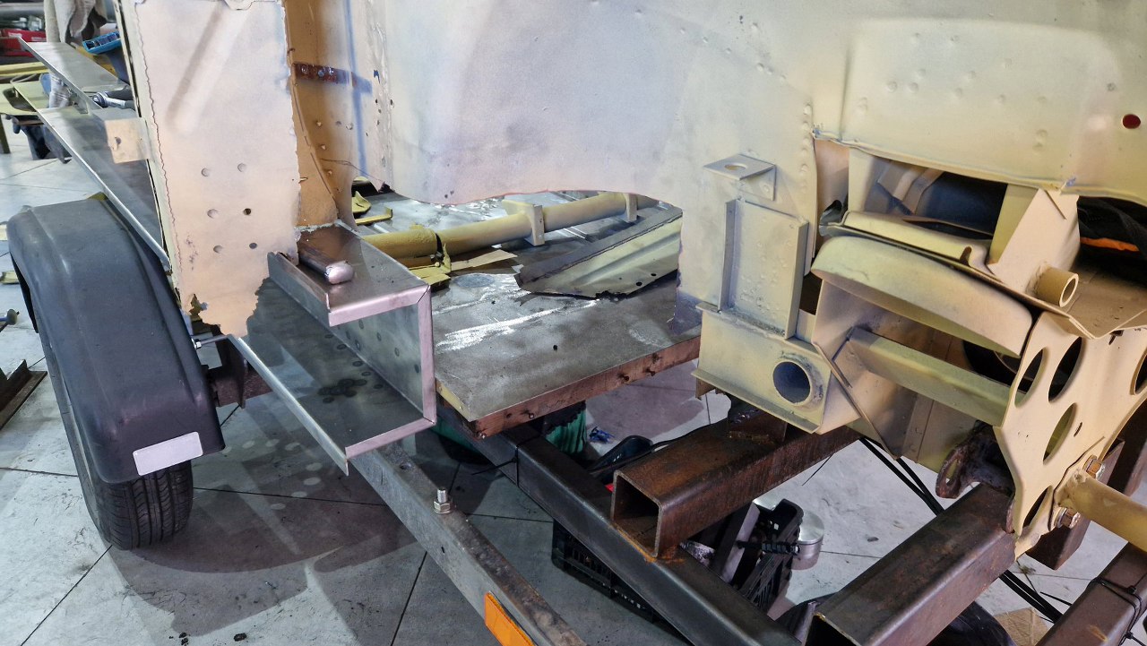 Zdjęliśmy podłogę i pomalowaliśmy ją podkładem reaktywnym. Jak ją teraz wkręcimy w ramę podwoziową, to dopiero jak będzie solidnie połączona z przodem nadwozia będzie można to ruszyć.