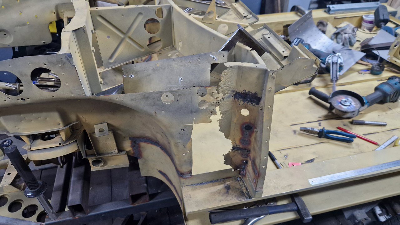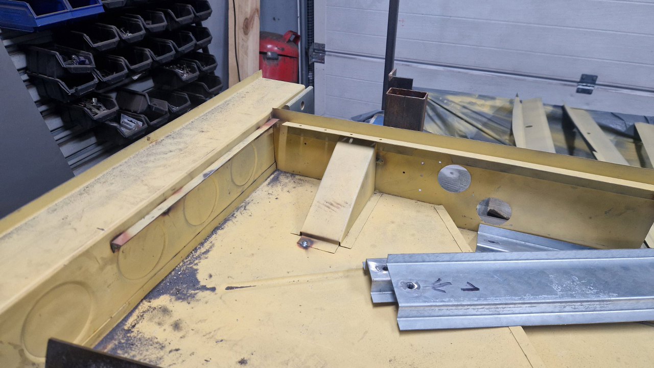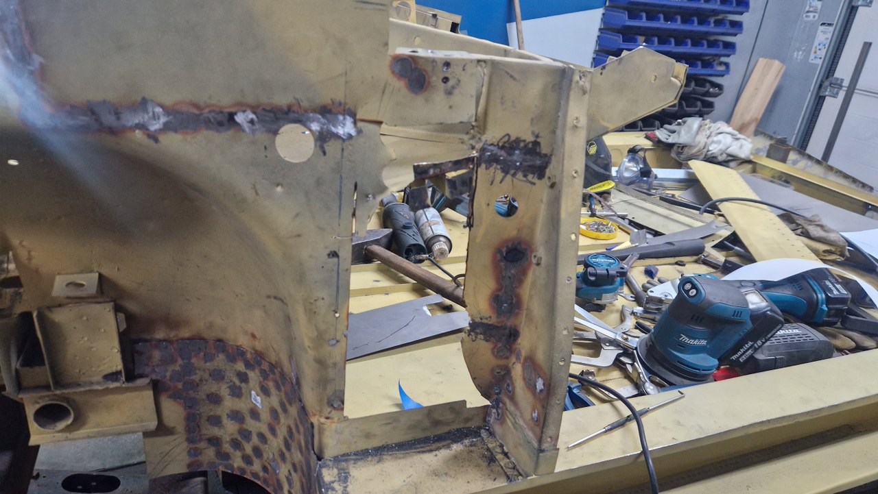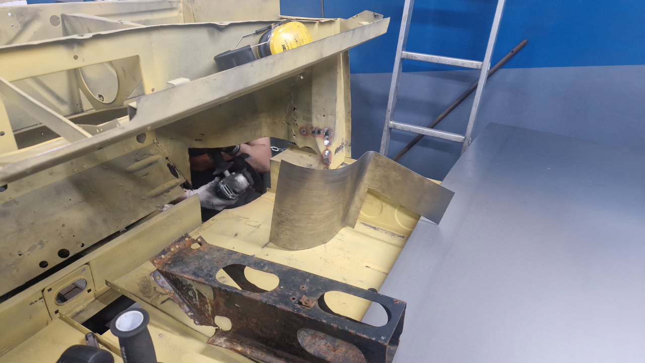Skośna część podłogi była jednym elementem, ale z przodu jest tak mocno powiązana z innymi częściami, że nie było sensu jej wyjmowac w całości - za dużo zniszczeń by było. Dlatego podjęliśmy decyzję, żeby zrobić tylko łatę widoczną na zdjęciu. Blachy w całości dorabia Maciek, ja się do tego nie dotykam.