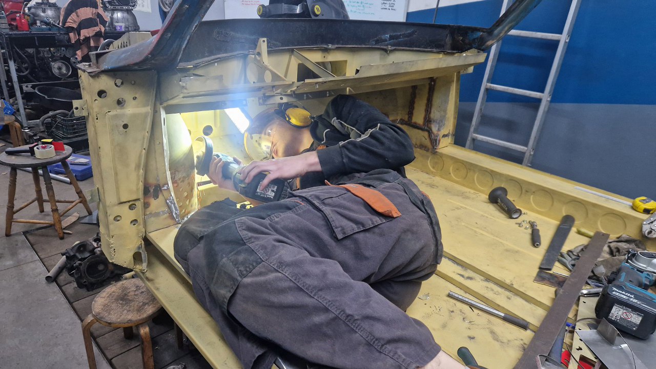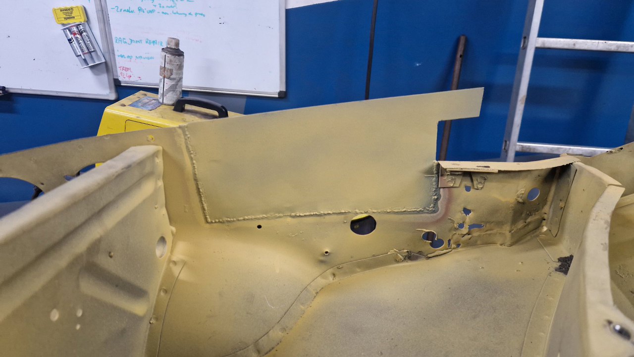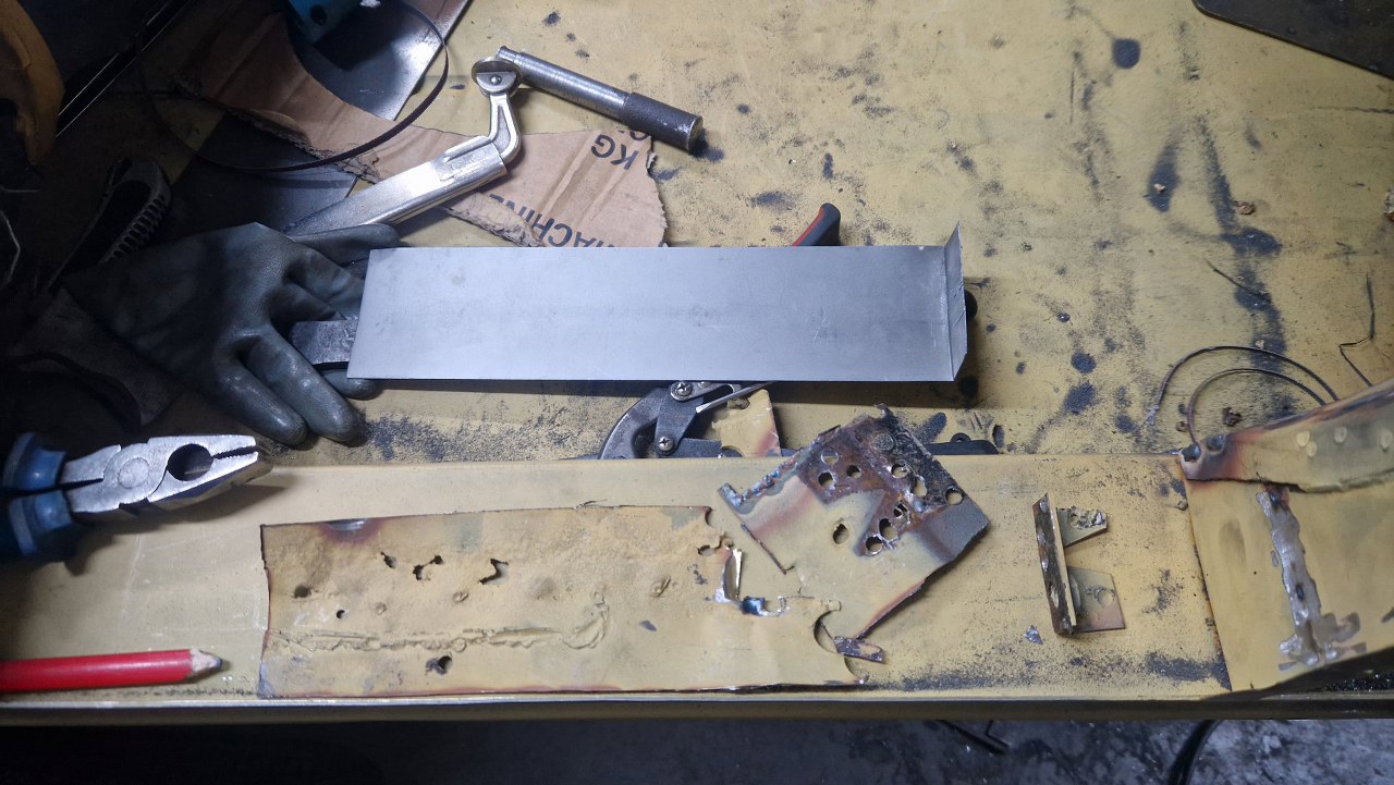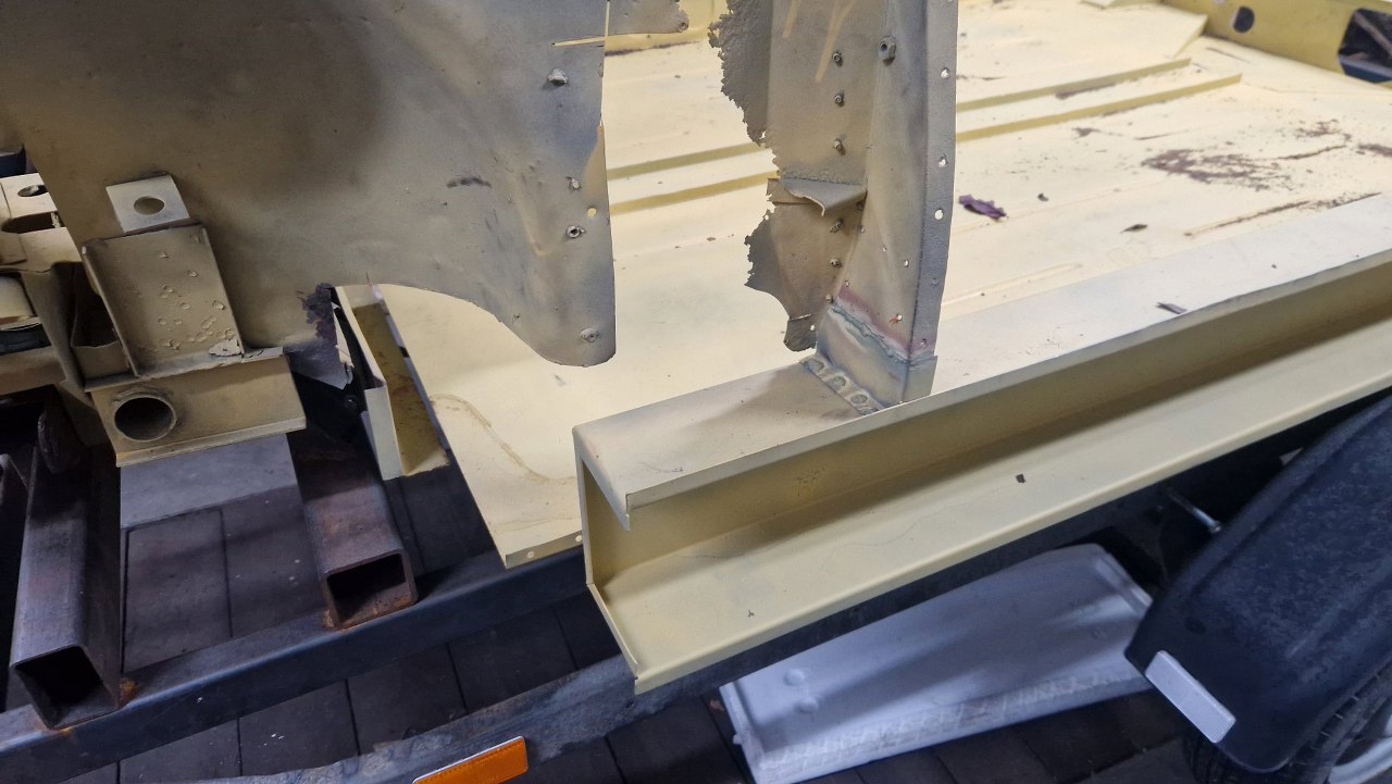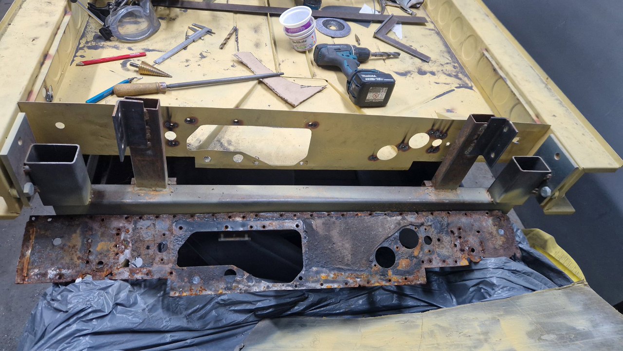 Skośna część podłogi była jednym elementem, ale z przodu jest tak mocno powiązana z innymi częściami, że nie było sensu jej wyjmowac w całości - za dużo zniszczeń by było. Dlatego podjęliśmy decyzję, żeby zrobić tylko łatę widoczną na zdjęciu. Blachy w całości dorabia Maciek, ja się do tego nie dotykam.