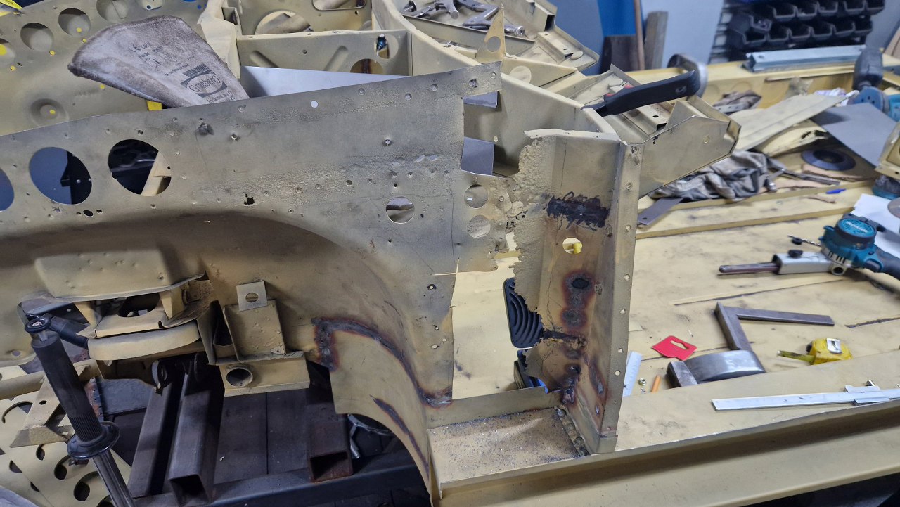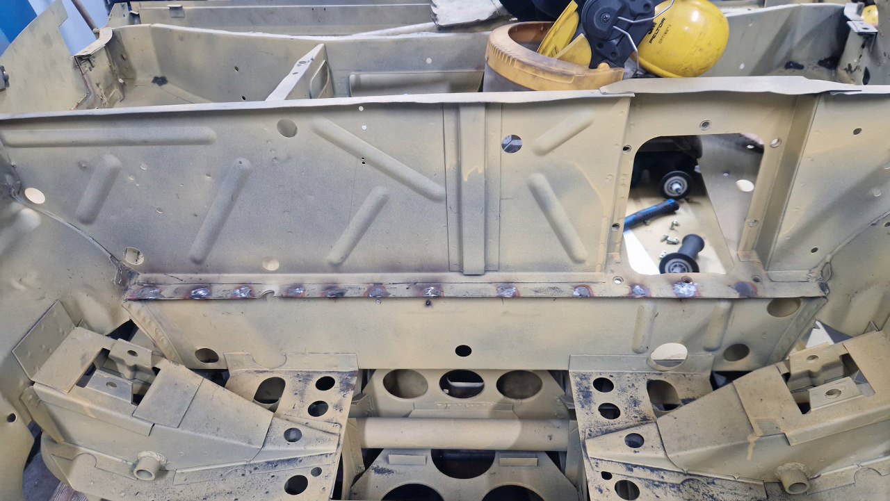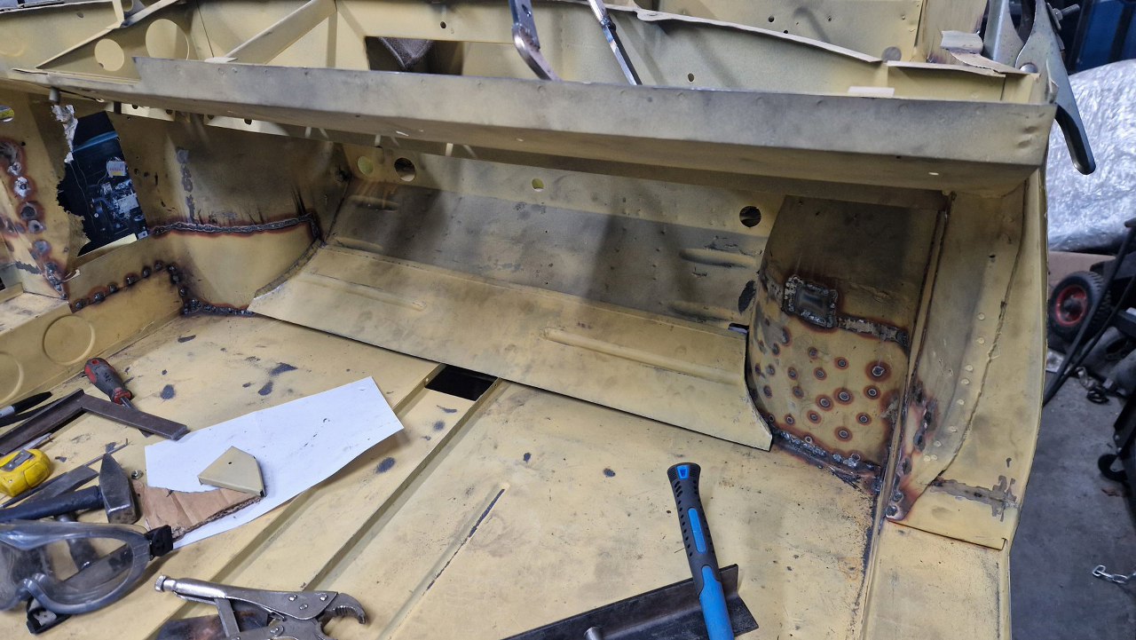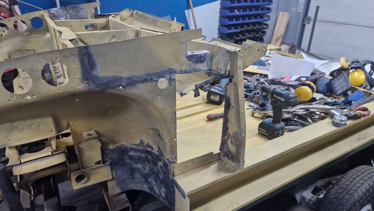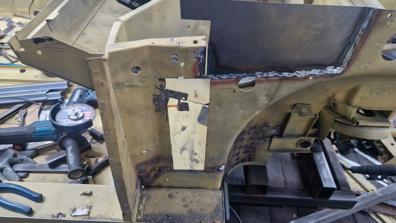 No i zamknięty cały etap, czyli powiązanie podłogi z przodem. Gotowe nadkola, słupki wewnętrzne i podłoga. W podłodze jeszcze będzie wspawana blaszka z nakrętkami mocującymi pedał gazu, ale to potem. No i oczywiście jeszcze od dołu samochodu trzeba to ogarnąć, ale to potem, jak przewrócimy go do góry nogami.