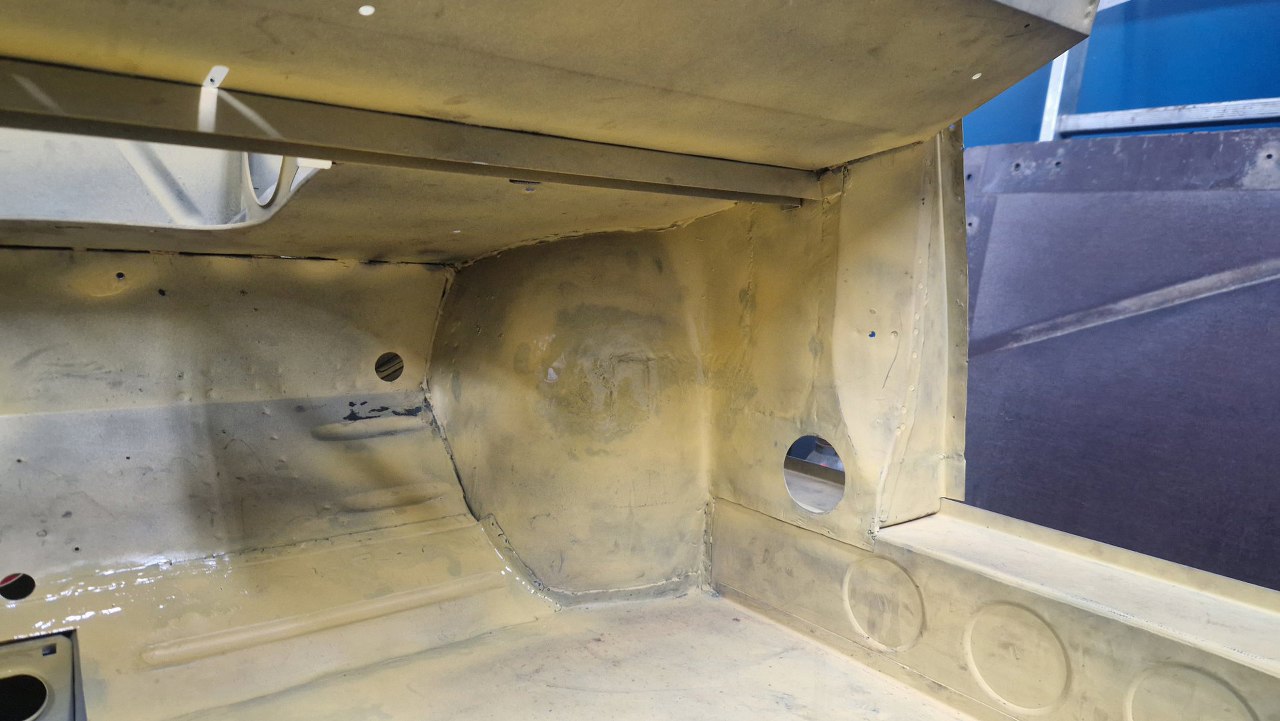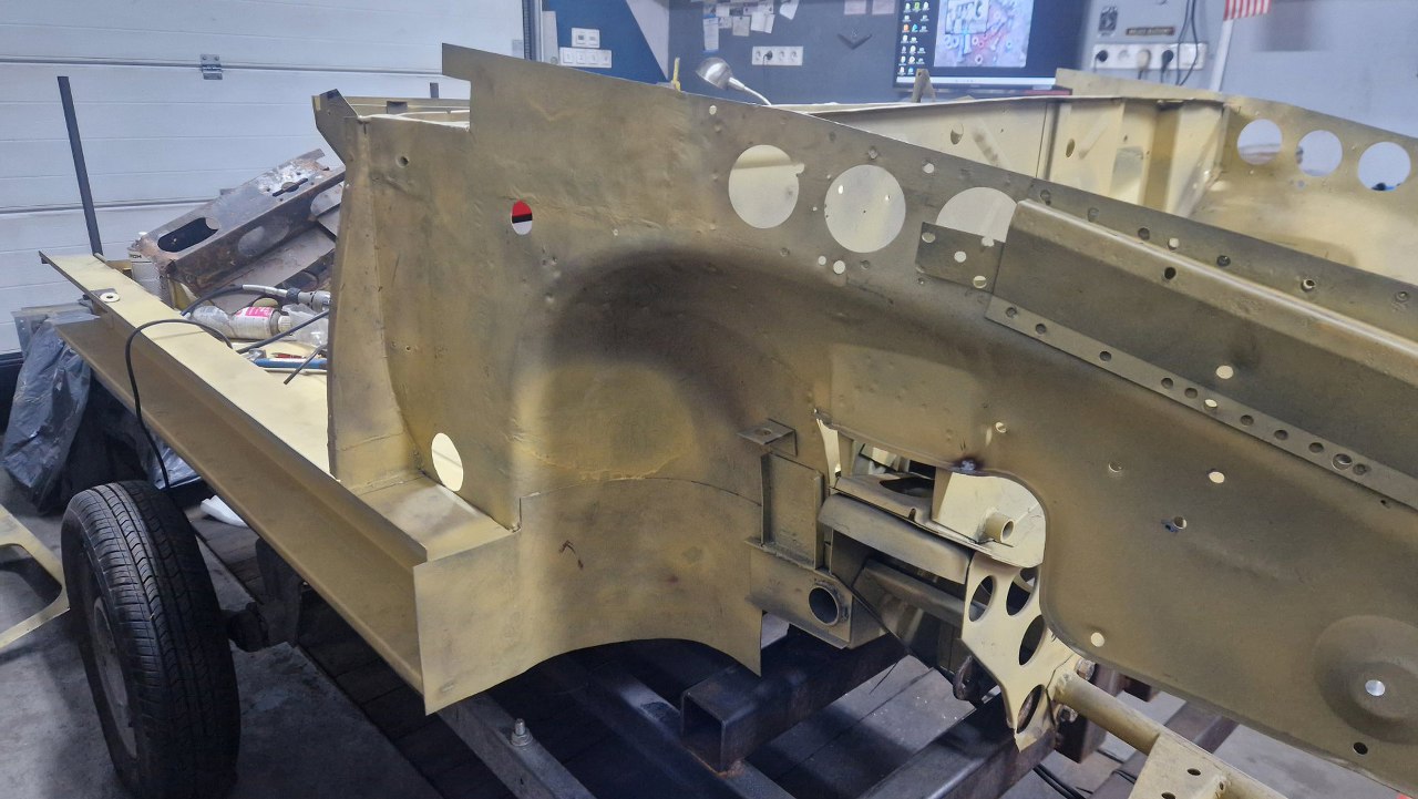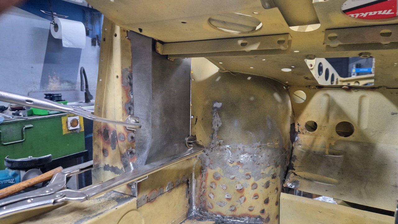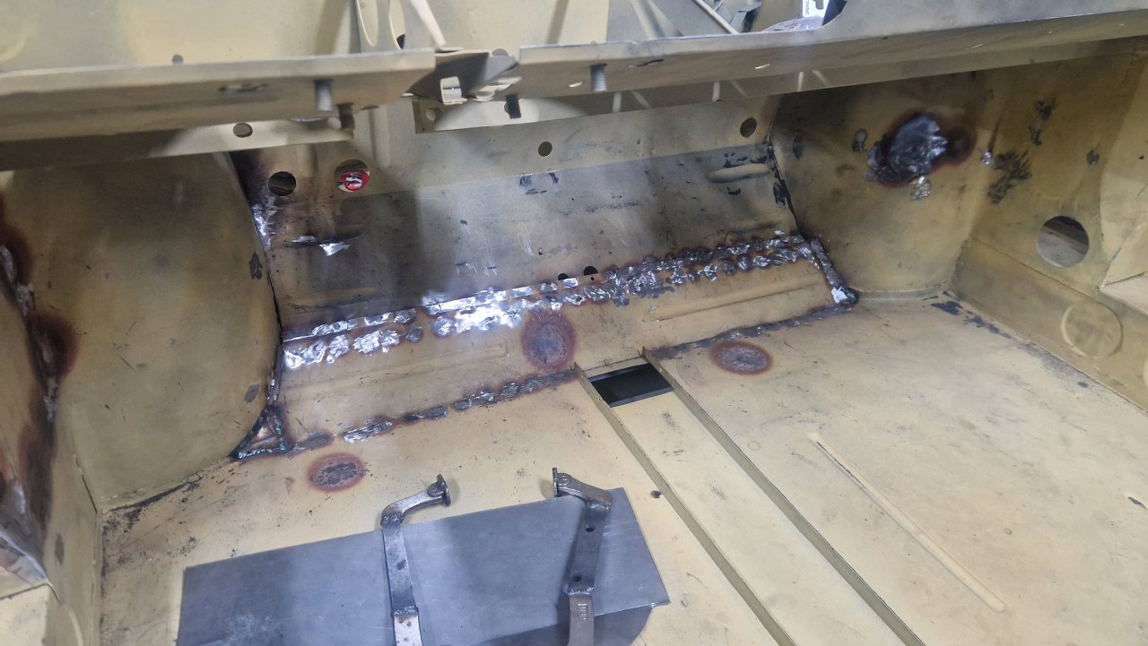 No i zamknięty cały etap, czyli powiązanie podłogi z przodem. Gotowe nadkola, słupki wewnętrzne i podłoga. W podłodze jeszcze będzie wspawana blaszka z nakrętkami mocującymi pedał gazu, ale to potem. No i oczywiście jeszcze od dołu samochodu trzeba to ogarnąć, ale to potem, jak przewrócimy go do góry nogami.