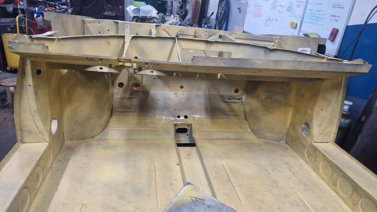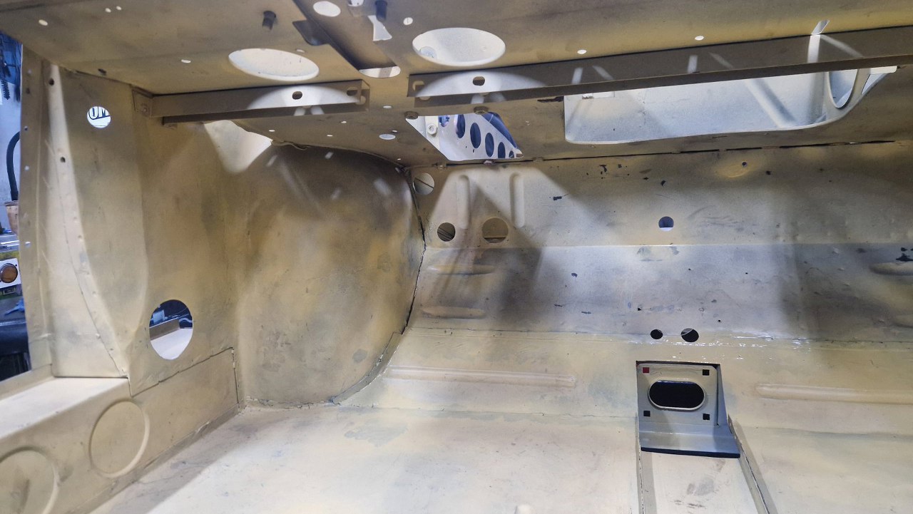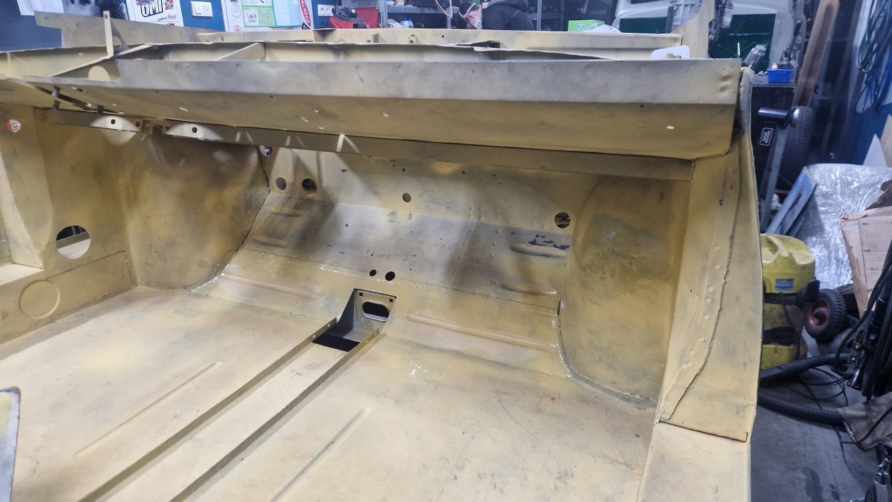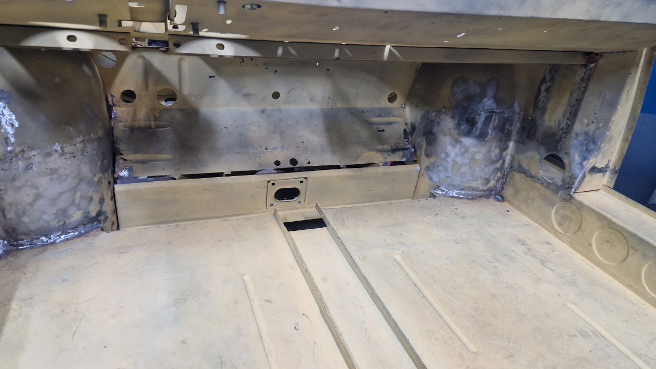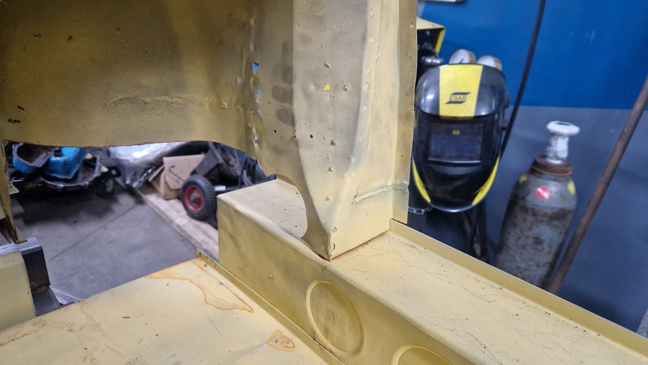 No i zamknięty cały etap, czyli powiązanie podłogi z przodem. Gotowe nadkola, słupki wewnętrzne i podłoga. W podłodze jeszcze będzie wspawana blaszka z nakrętkami mocującymi pedał gazu, ale to potem. No i oczywiście jeszcze od dołu samochodu trzeba to ogarnąć, ale to potem, jak przewrócimy go do góry nogami.