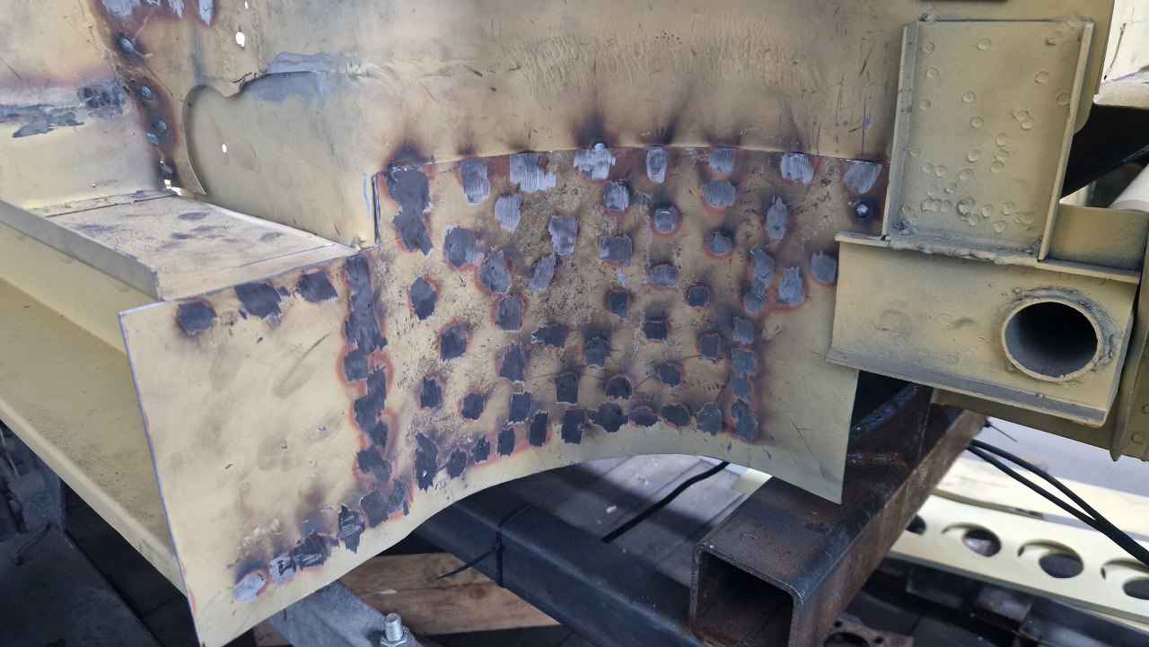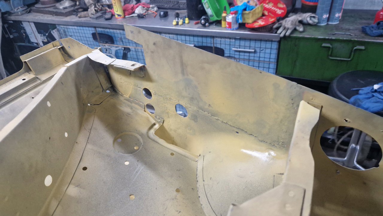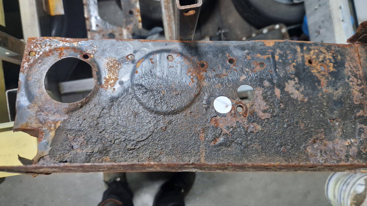 A tu już po oszlifowaniu spawów. Na to jest jeszcze jedna blacha, wzmocnienie, które zaczyna się od otworu po prawej i częściowo jest tu zachowane. To zrobię później, zwłaszcza, że ciężko to będzie zrobić - ma to być z blachy 2.5mm.