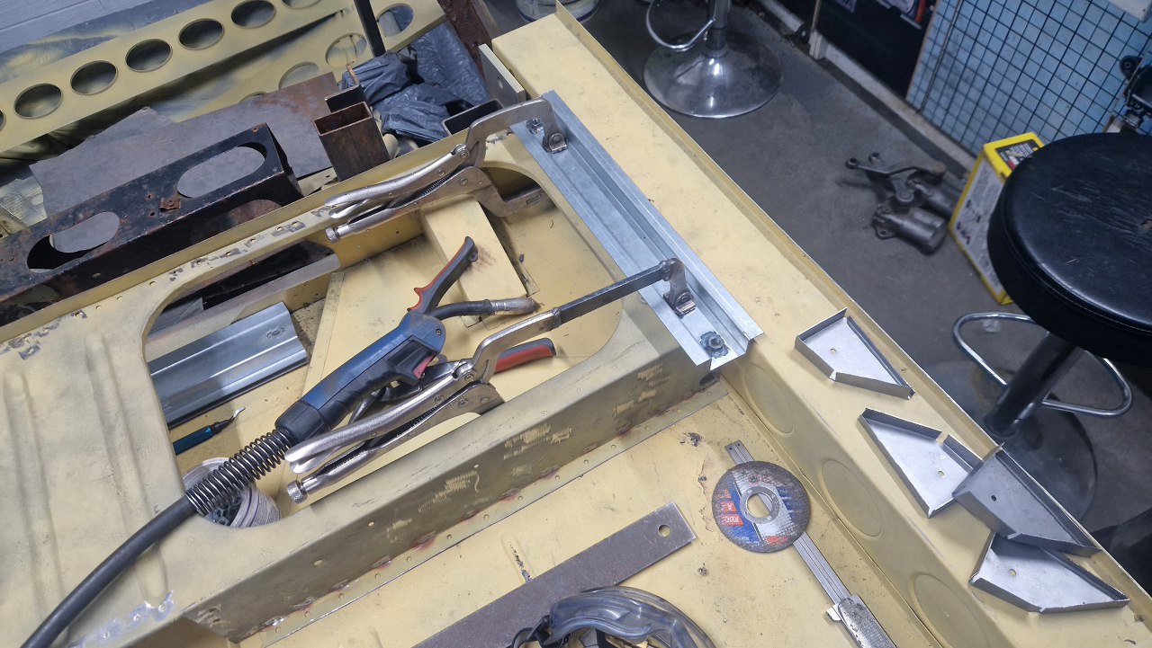 Nie patrz na razie na inne gotowe części, o nich będzie nieco później. W tylnej części podłogi przymierzyłem podstawę siedziska tylnej kanapy i spiąłem ją z mocowaniem, które mam przyspawać do progu. Oczywiście nic z tego nie widać, dostępu nie ma żadnego, więc przyspawanie tego było niezlym wyzwaniem. Udało mi się złapać jakkolwiek trzymający spaw dopiero za 5 razem.
