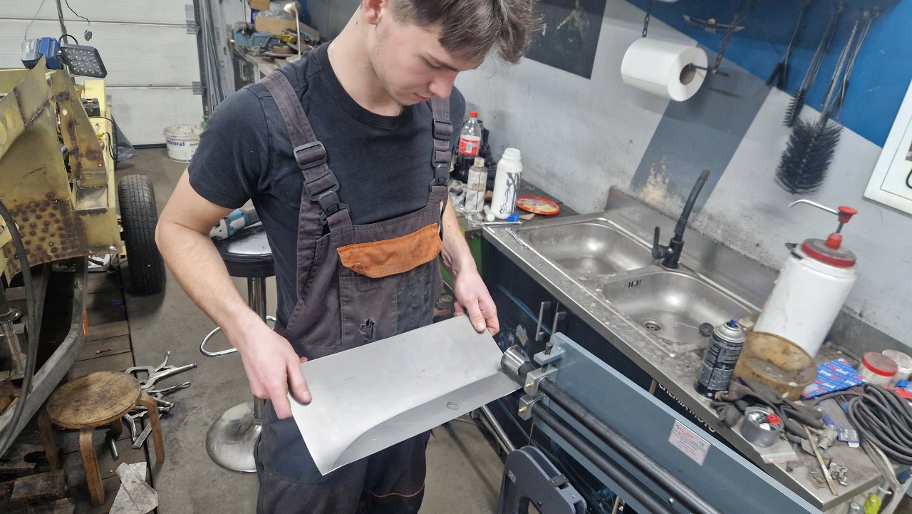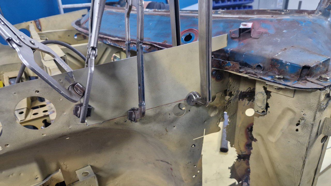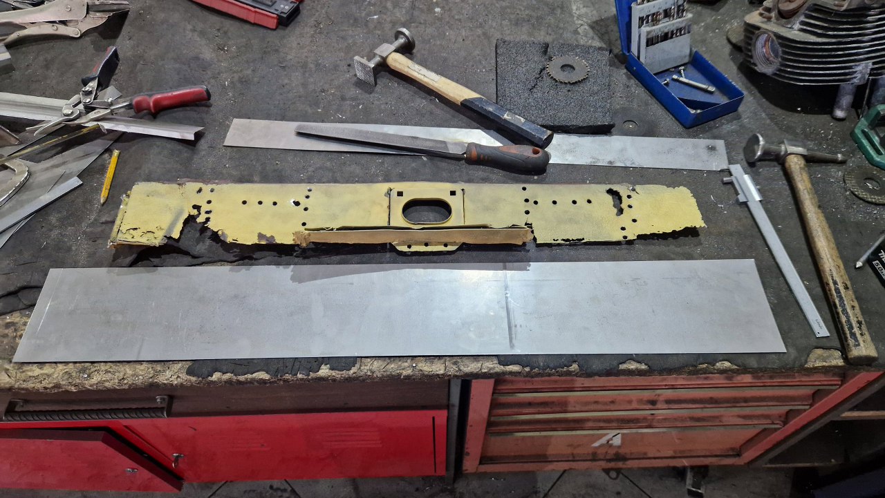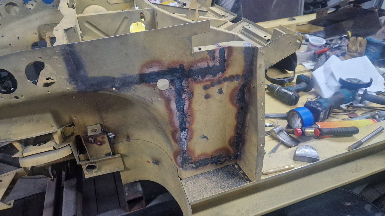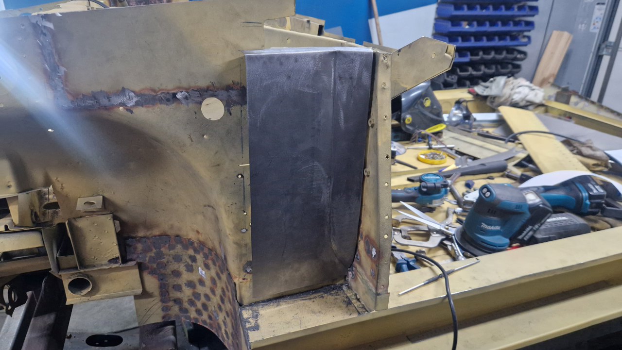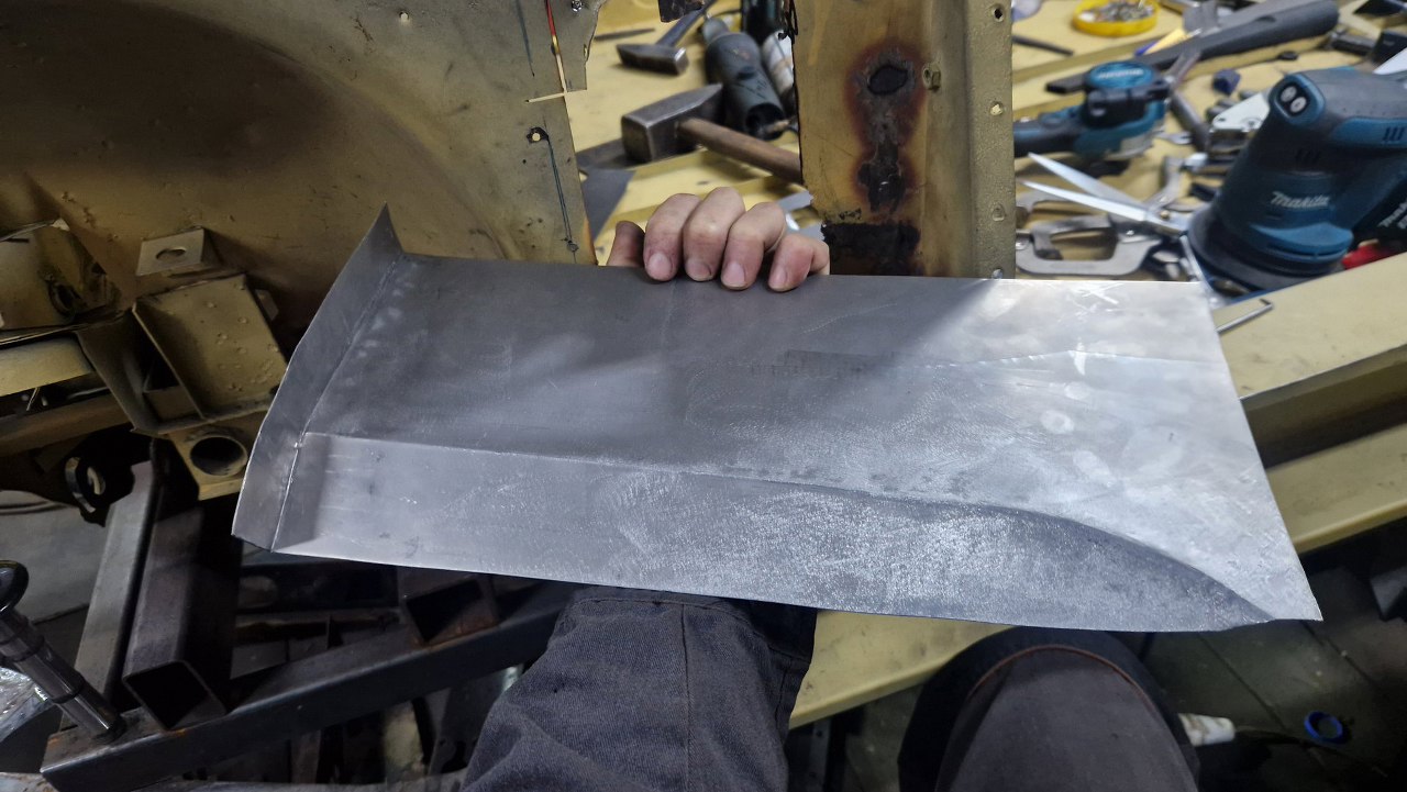 Wspawana i oszlifowana. Trzy słowa, ale w sumie wiele godzin pracy, żeby to podczas spawania dopilnować, żeby się nie pogięło, doszlifować drobne niedopasowania. Potem jeszcze w kilku miejscach grzanie palnikiem, żeby brzuchy skurczyć i blachę zrobić płaską. Na tym zdjęciu jeszcze brakuje otworów, które zrobimy tak, jak były oryginalnie.
