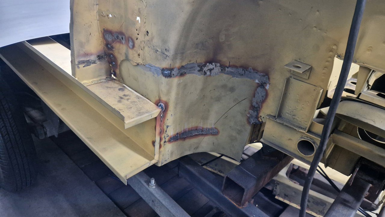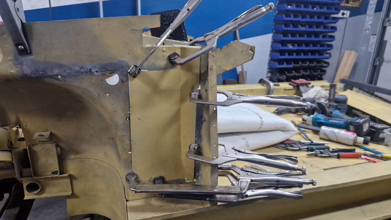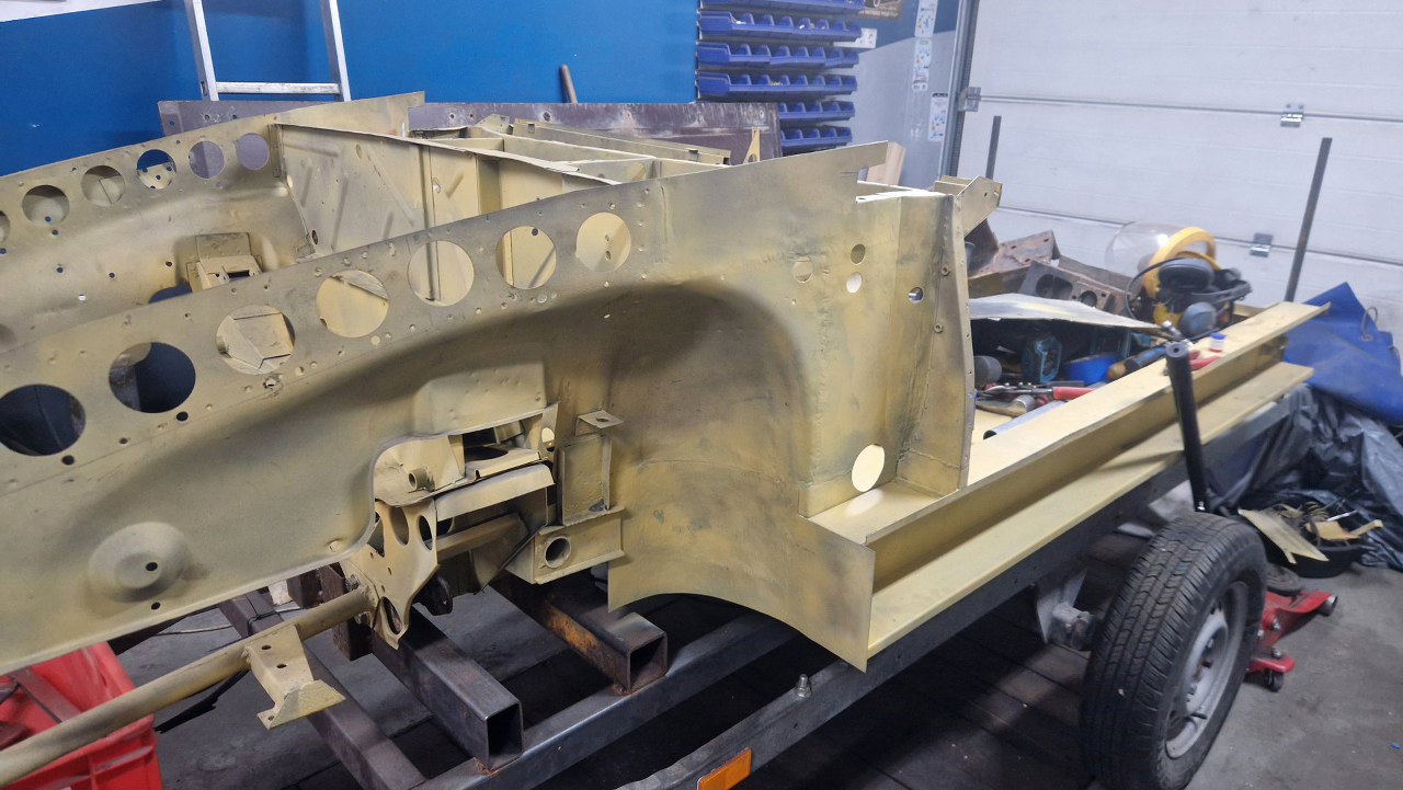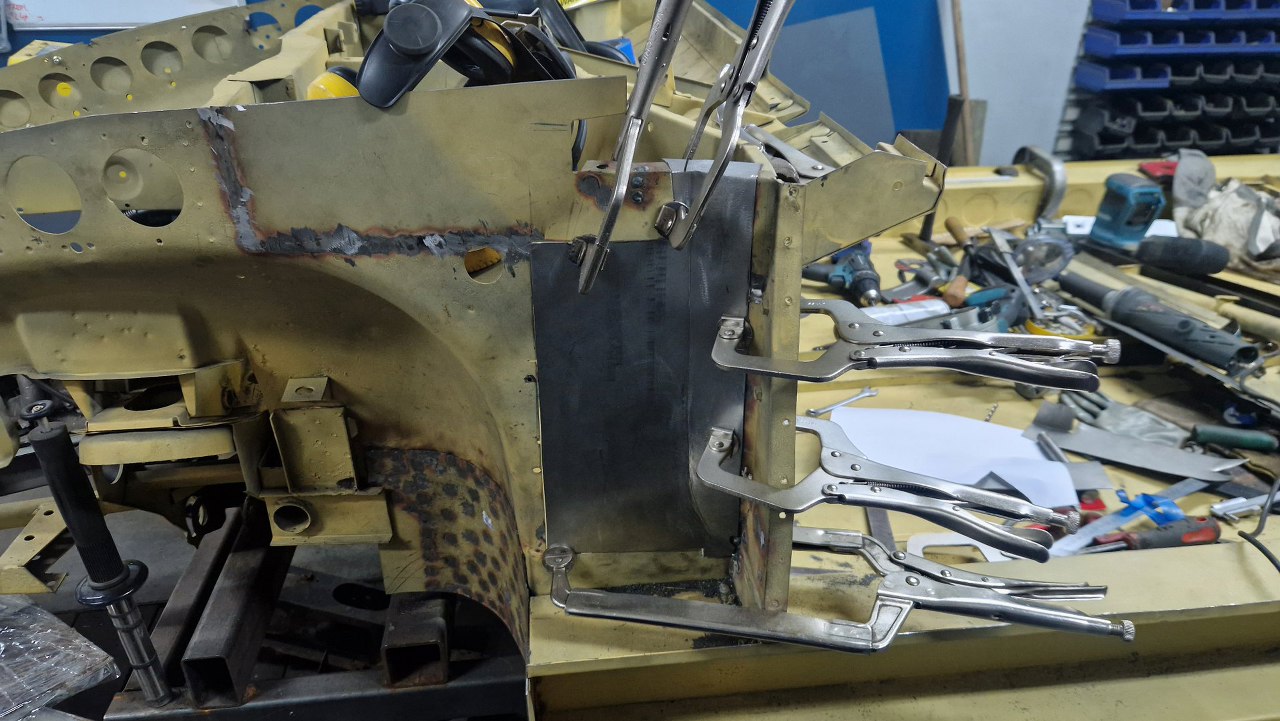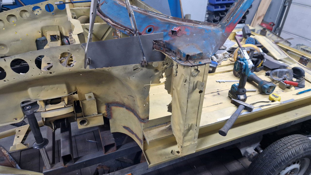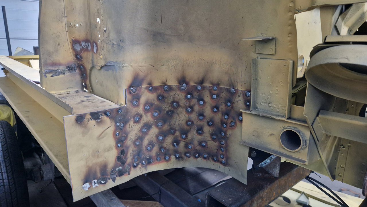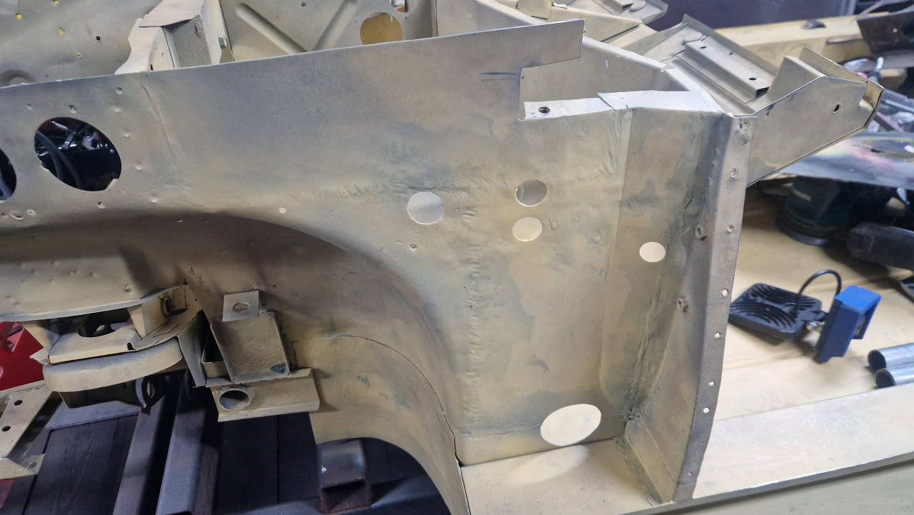 Wspawana i oszlifowana. Trzy słowa, ale w sumie wiele godzin pracy, żeby to podczas spawania dopilnować, żeby się nie pogięło, doszlifować drobne niedopasowania. Potem jeszcze w kilku miejscach grzanie palnikiem, żeby brzuchy skurczyć i blachę zrobić płaską. Na tym zdjęciu jeszcze brakuje otworów, które zrobimy tak, jak były oryginalnie.