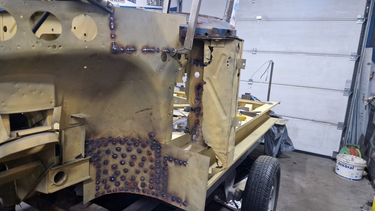 Środkowy element jest uratowany oryginalny, dorobiona jest nowa blacha pionowa. Robiliśmy to równolegle do słupków i nadkoli, więc rzuć okiem i w te rejony.