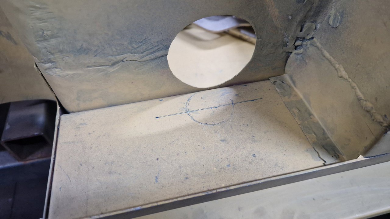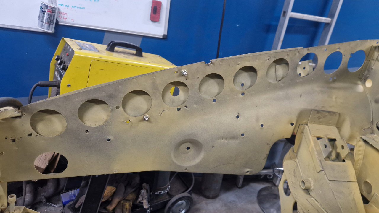 Miejsca, które zaraz nie będą dostępne zostały pomalowane podkładem epoksydowym. W blasze są już otwory do spawania.