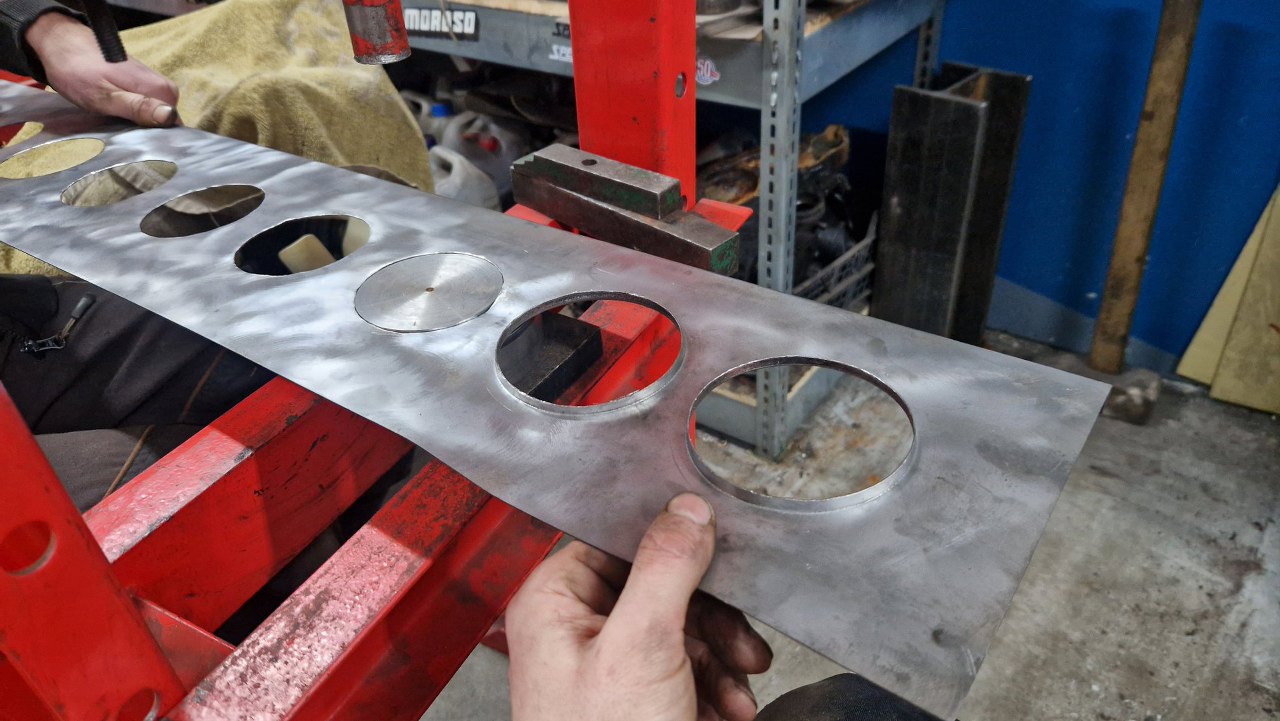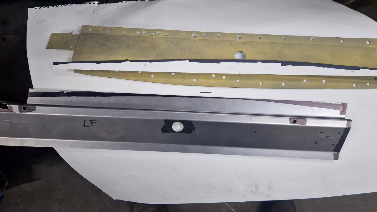 Teraz potrzebujemy zamknąć dolną część progu. Potrzebny jest kawałek blachy, ale nie wiemy jakiej długości. Mamy tylną część progu, resztki środkowej, i dopiero tym da się wyznaczyć początkowy odcinek. Ponieważ jednak środkowe progi są dość mocno zjedzone i krzywe, to trzeba dorobić nowe. Zamówiliśmy wycięte laserem blachy, żeby mieć dokładnie wycięte otwory. Potem się okazało, że narysowałem ciut za małe te otwory i Maciek musiał to później poprawiać i docinać... W każdym razie otwory te trzeba jeszcze było przetłoczyć.