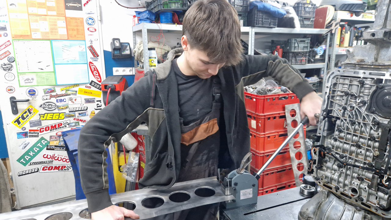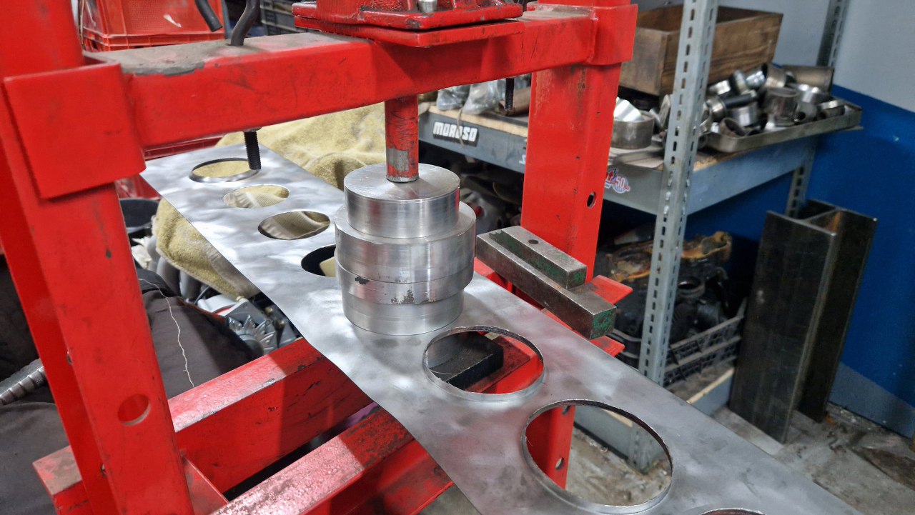 Przetłoczenia, mimo, że nieduże i w otworach, a nie ślepe jak w progach wewnętrznych, spowodowały pogięcie blach. Maciek wziął się za ich prostowanie.