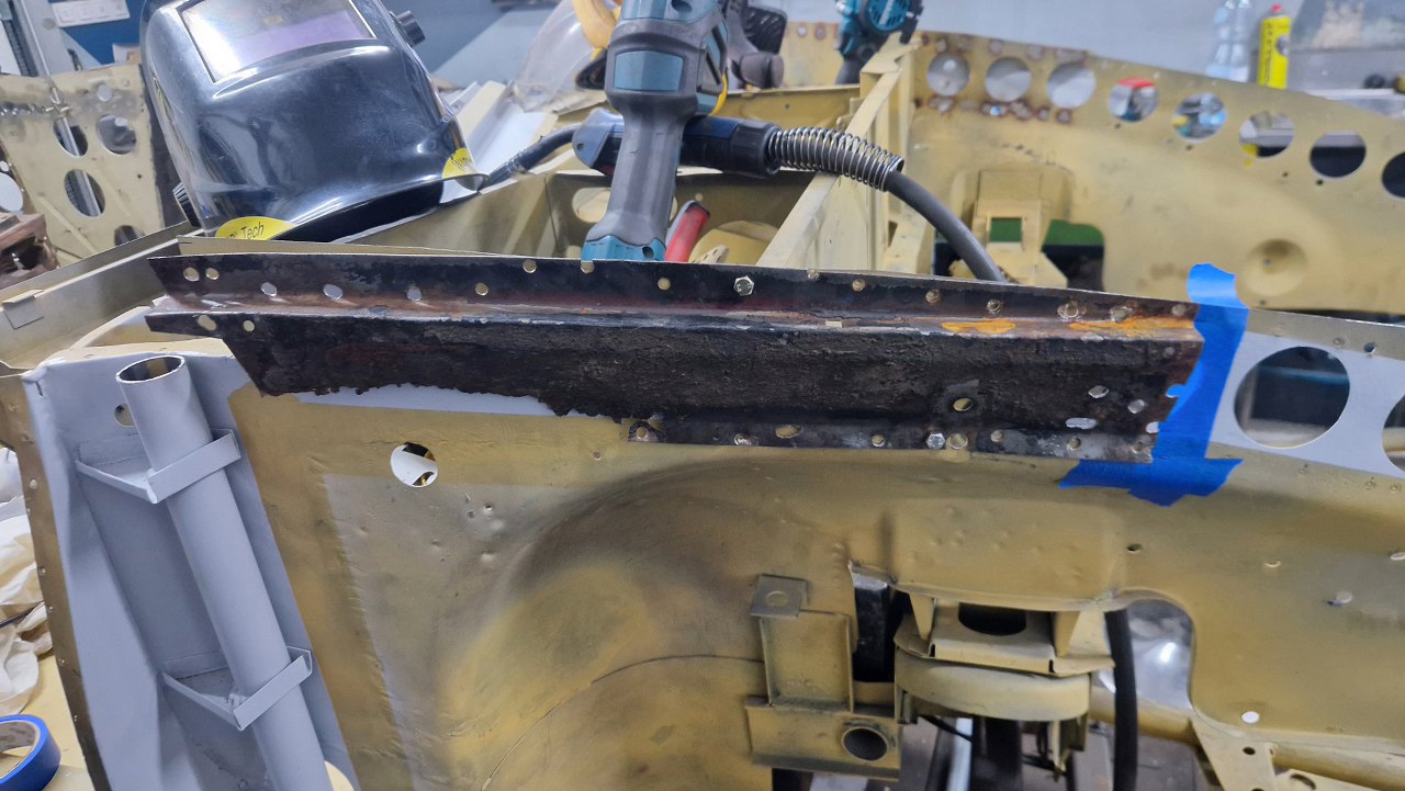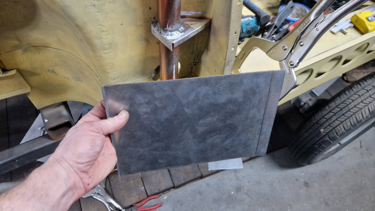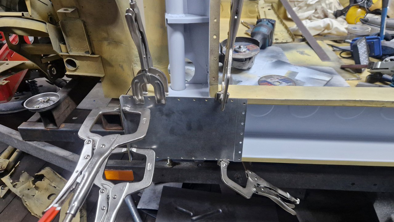 Stopniowo ściskając dwie blachy ze sobą udało się to połączyć. Przód wzmocnienia wspawany jest od środka, wykorzystując otwory wywiercone w miejscach starych zgrzewów. Tył, gdzie fartuch jest zrobiony z nowej blachy, wspawałem od zewnątrz, przez nowe otworki zrobione we wzmocnieniu.