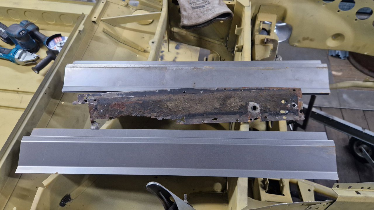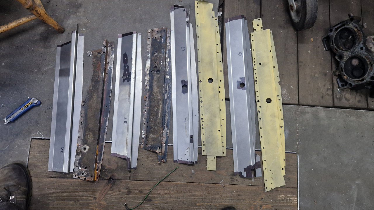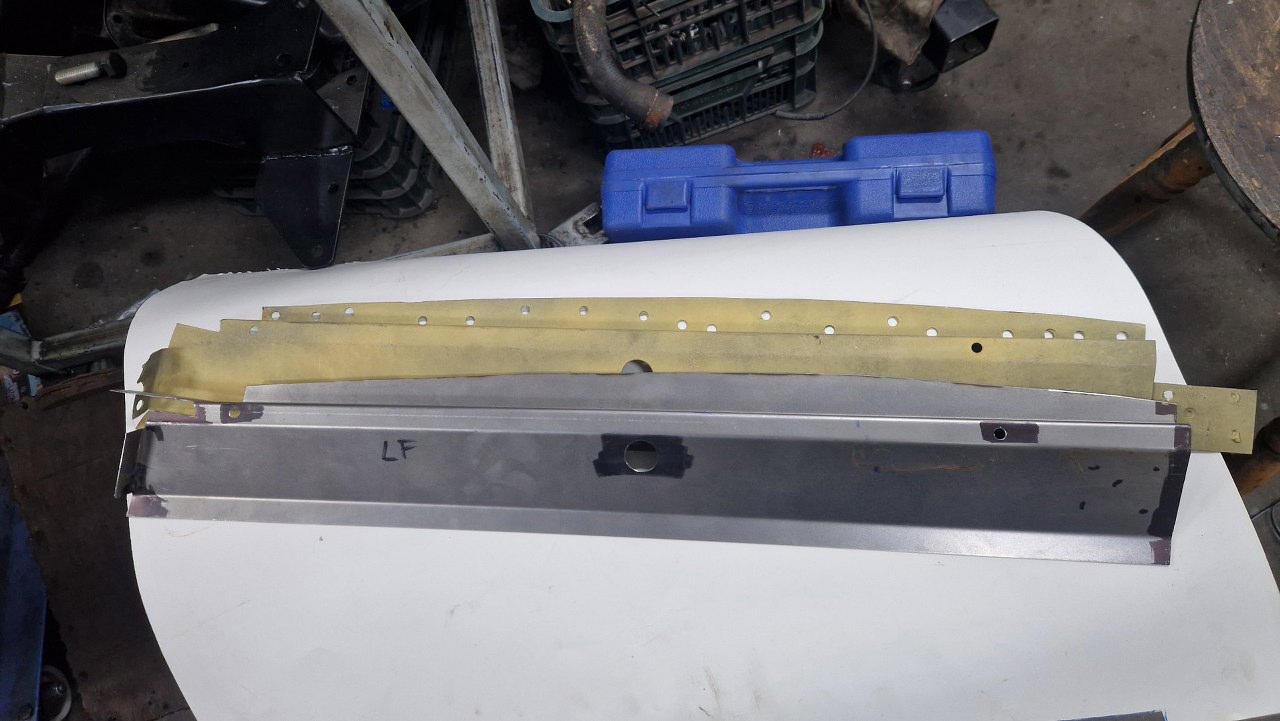 Zmieńmy chwilowo temat. Przednie błotniki są mocowane wzdłuż podwozia do wzmocnień wspawanych do przednich fartuchów. Te wzmocnienia zostały odwiercone, żeby się dostać do fartuchów. Same wzmocnienia też nie były w dobrym stanie. Narysowałem kształt i zamówiliśmy cztery takie same sztuki. Pośrodku widać jedno oryginalne wzmocnienie.