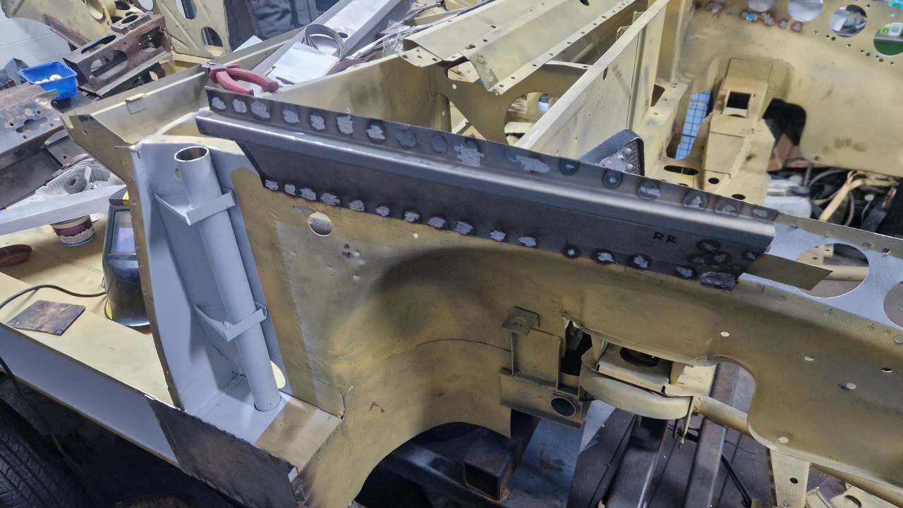 Do tylnych ćwiartek mamy przymocowane kasety boczne, w których jest mocowanie zamka drzwi, ale schodzą one do dołu i stanowią tylną część progu. Do nich dochodzą środkowe części progu, te, które dopiero co zostały dorobione.