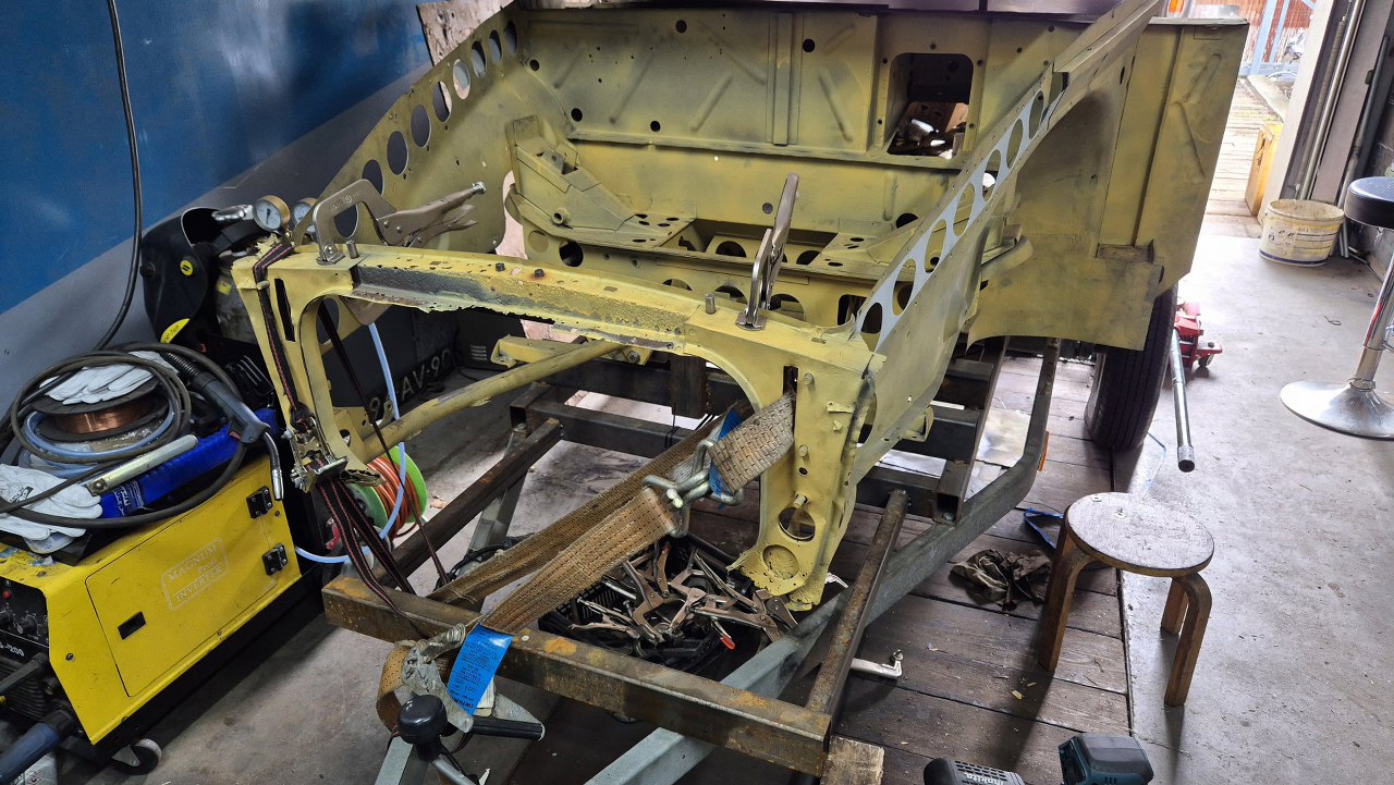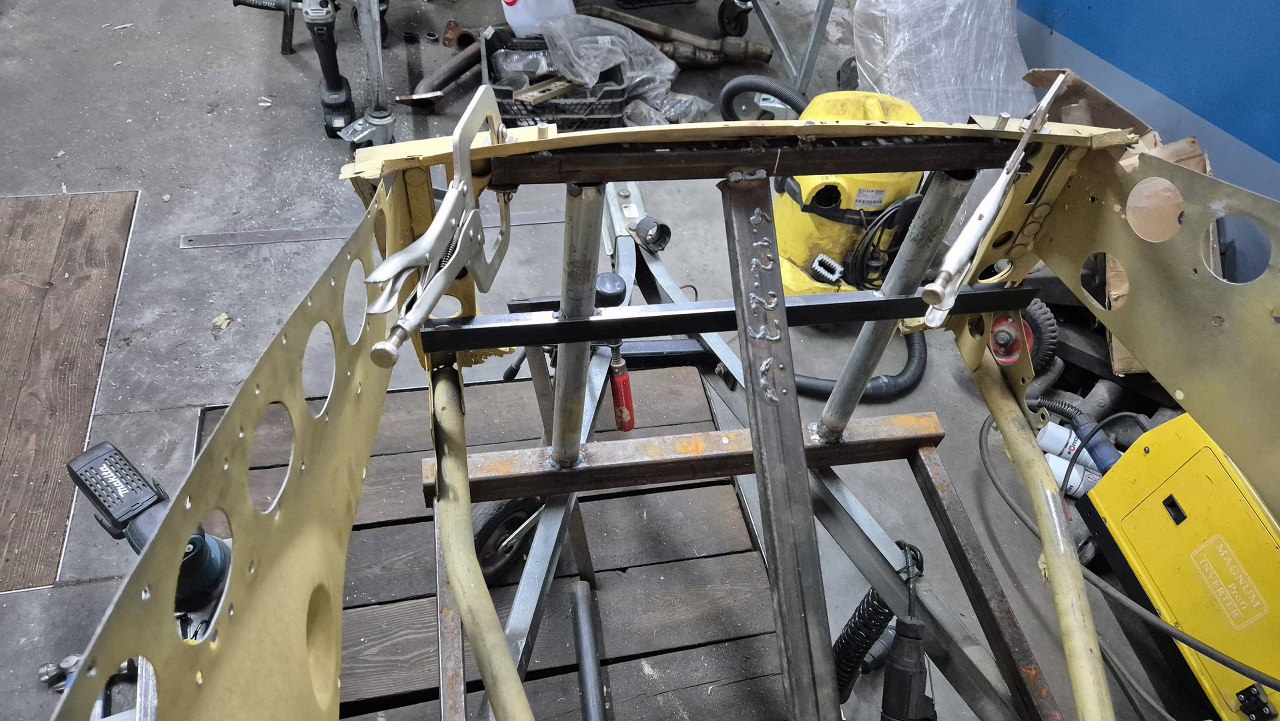 W tym momencie wspawaliśmy dwie rury, pozostałe ze wzmocnień słupków A, jako podparcie dla górnego profilu. Inny profil, przyspawany po skosie, ustala to w pionie.