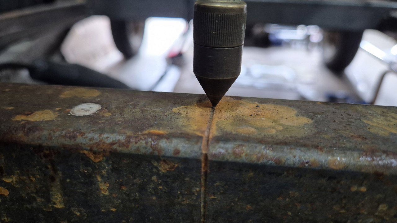 W ten sposób ustawiony profil ma zaznaczony środek. Do ramy podwoziowej dospawaliśmy dodatkowy kawałek ramy, który pozwoli nam na ustawienie przodu. Wyznaczyliśmy i tu środek, w profilu nacięty nieco szlifierką, żeby widoczny na zdjęciu sznurek trafiał w ten rowek. W głównej części ramy, przypominam, również są wycięte takie rowki, żeby łatwo było się odnieść do osi samochodu.