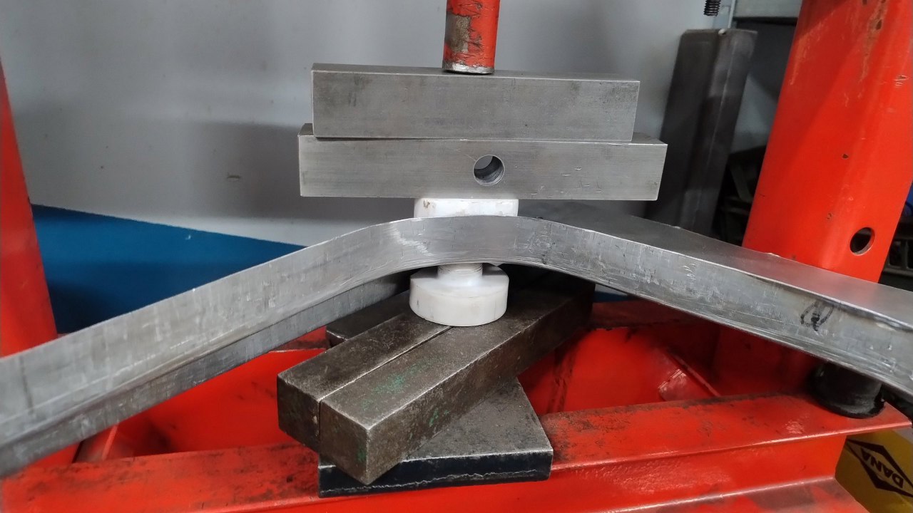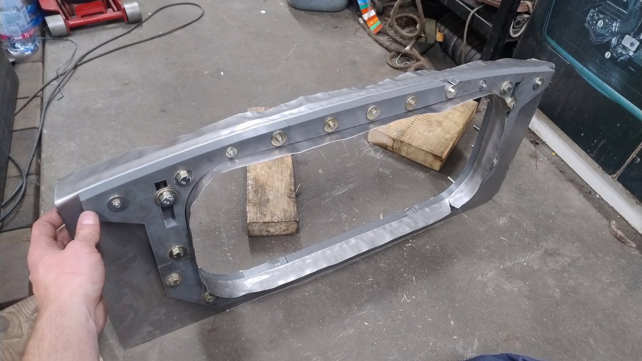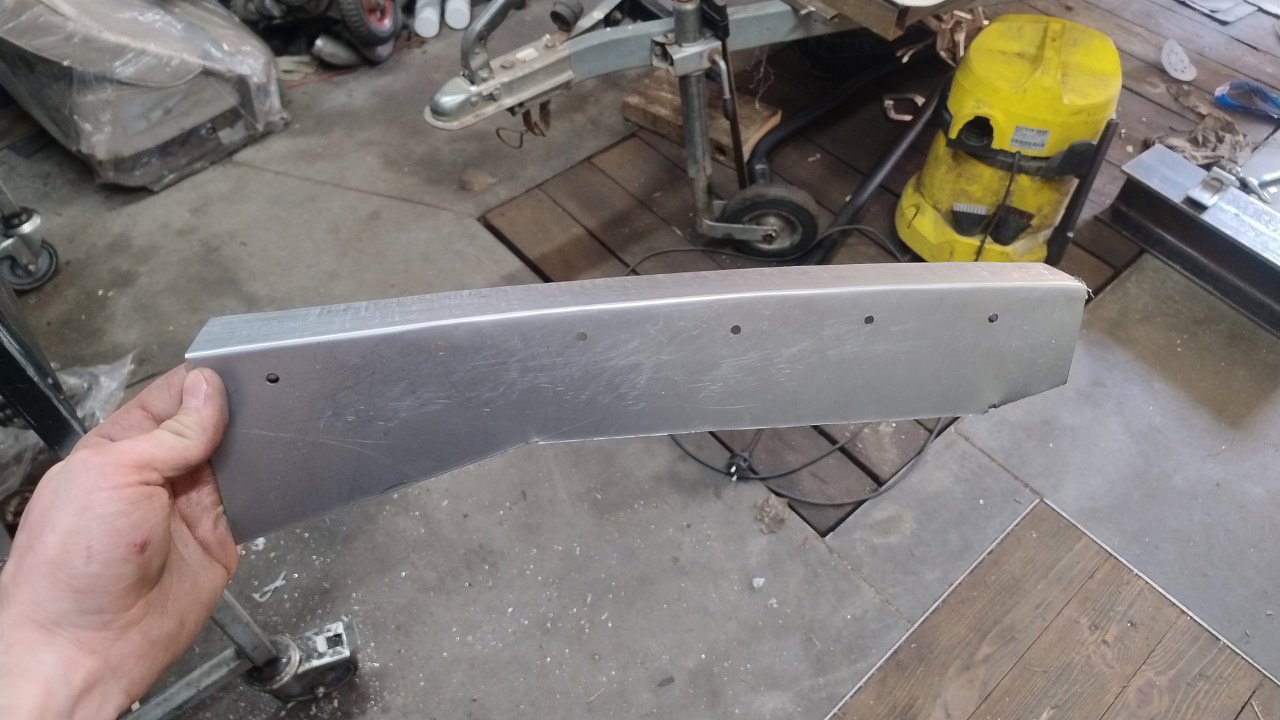 W ten sposób wykonane zostały otworki (śruby skręcające formę przez nie przechodziły, żeby ograniczyć ilość niepotrzebnego wiercenia, teraz zostały rozwiercone) i ich przetłoczenia. W górnej, zakrzywionej części Maciek wygiął jeszcze rant według oryginału. Małe otworki po śrubkach są niepotrzebne i będą zaspawane.