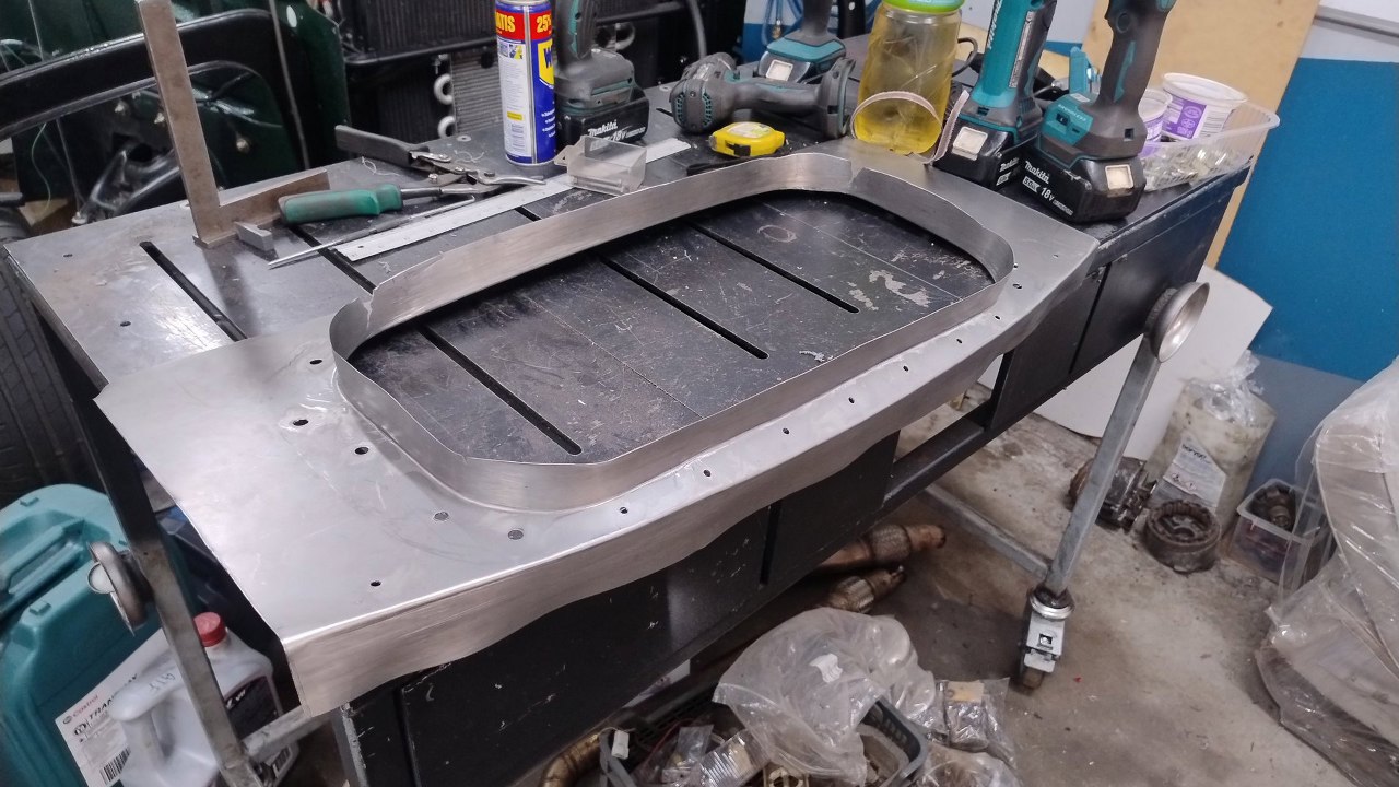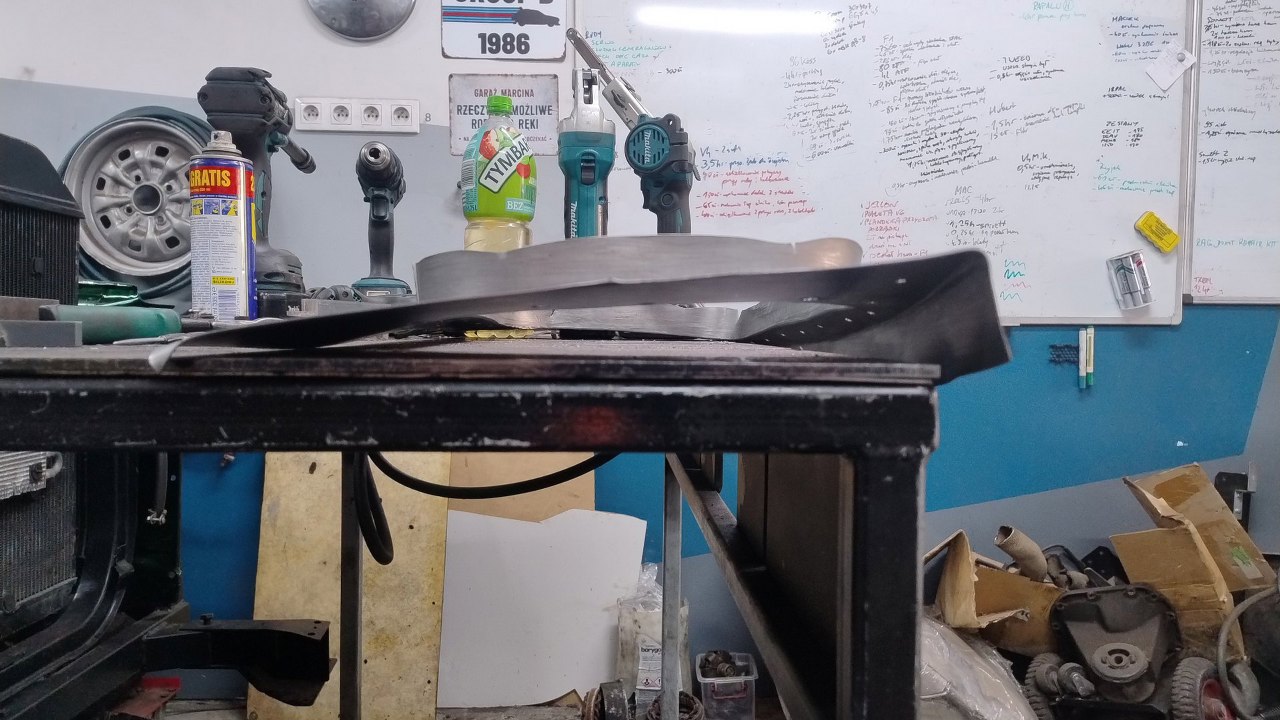Nastała żmudna faza wyrównywania blachy. Maciek wygładził krawędzie otworu - widać, że już nie są tak pofalowane.